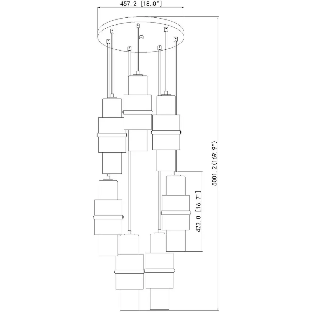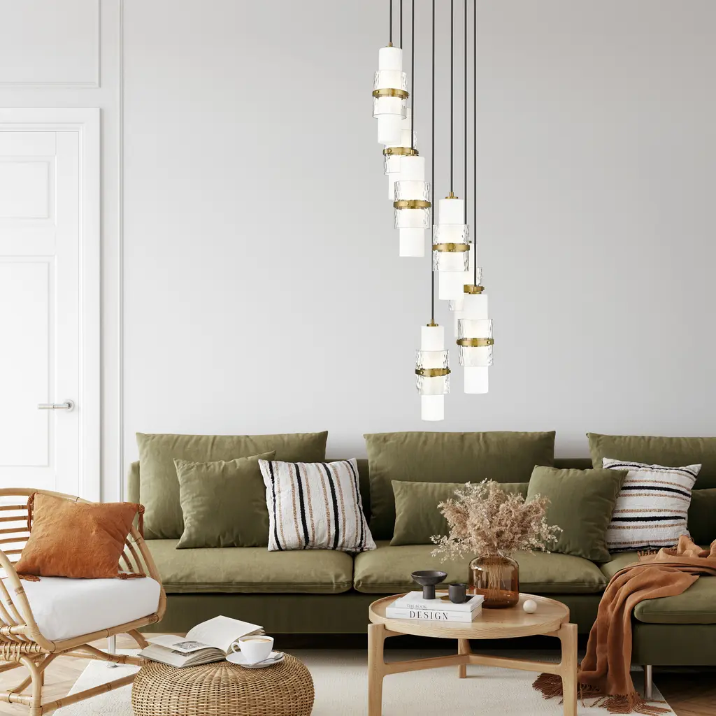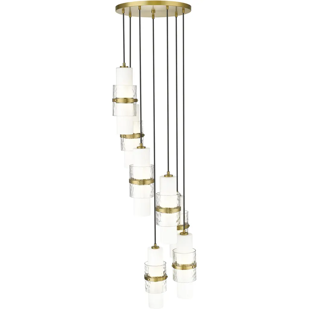 Cylindrical shades are arranged in a dizzying spiral to establish a superb silhouette for this modern seven-light chandelier. Perfect over a staircase or dining table, the chandelier features a modern gold finish canopy and decorative cuffs, which complement etched opal and clear textured glass cylinders that combine to create a stunning display.