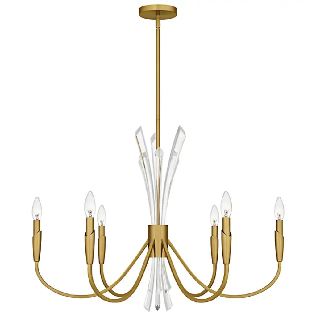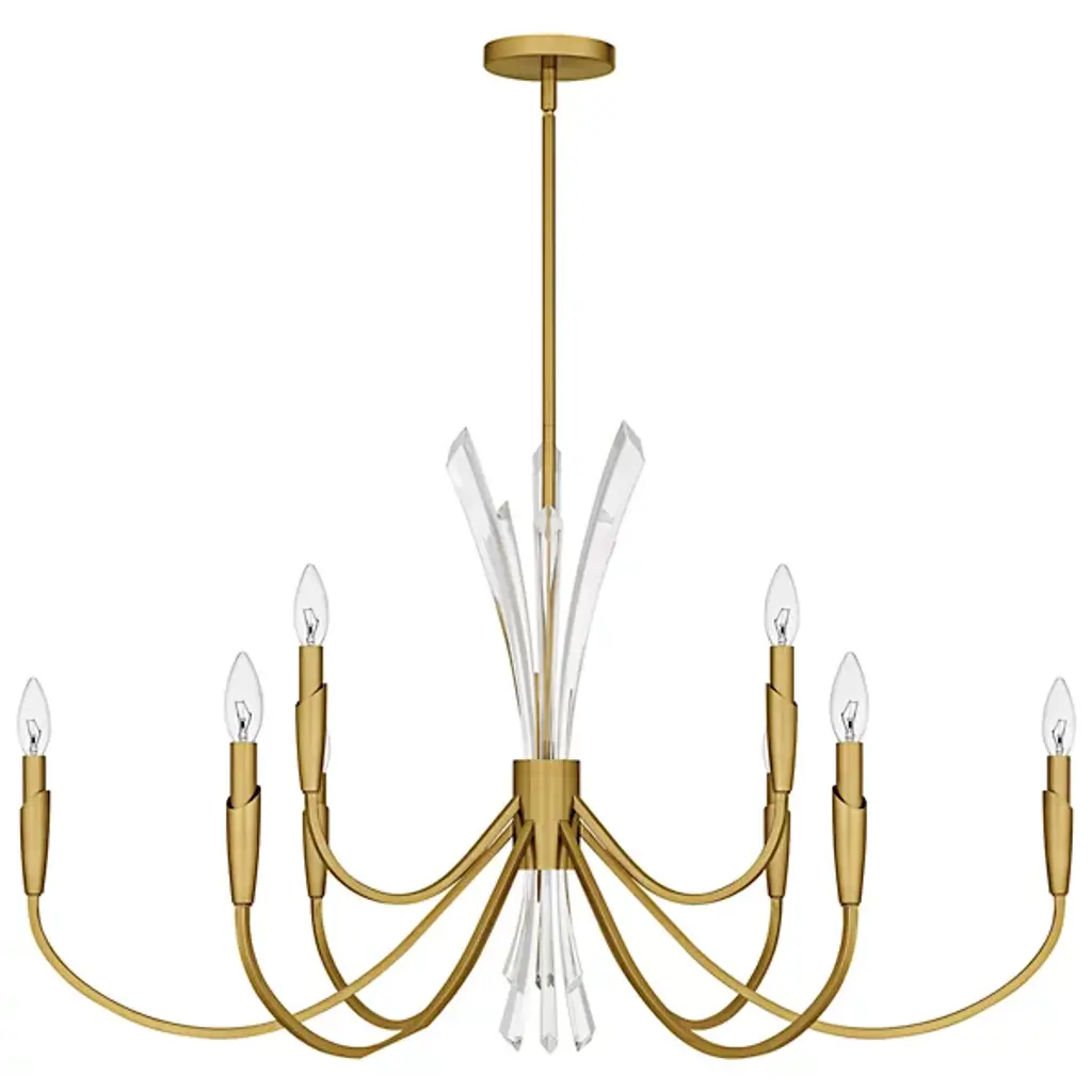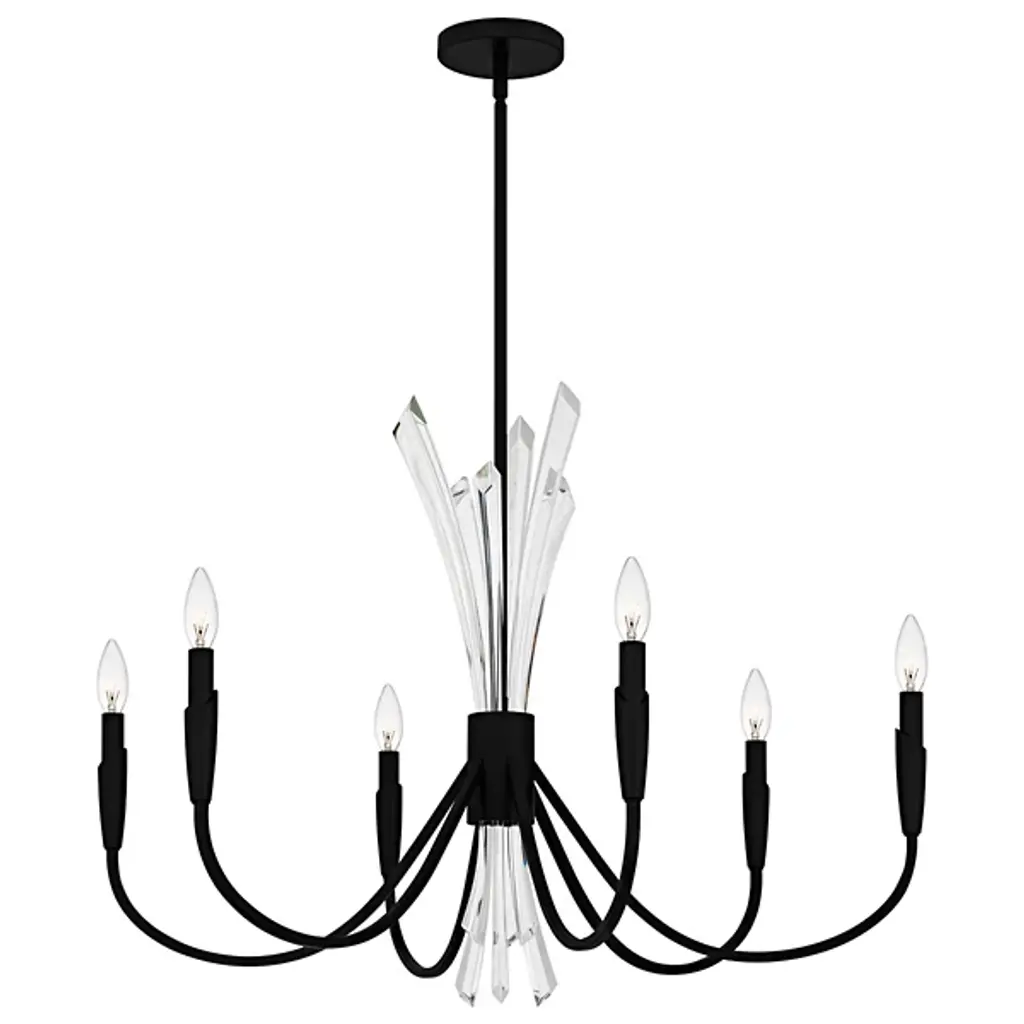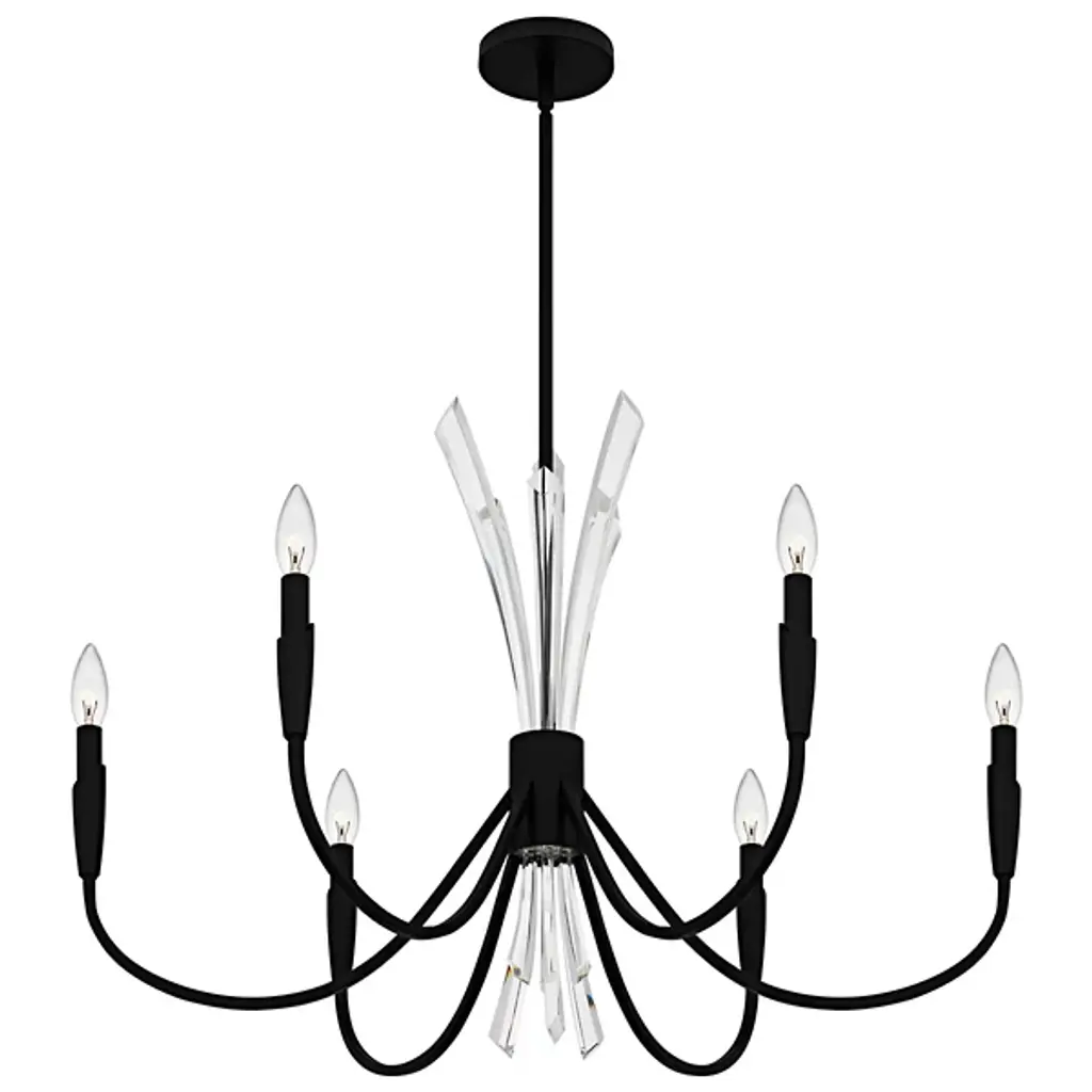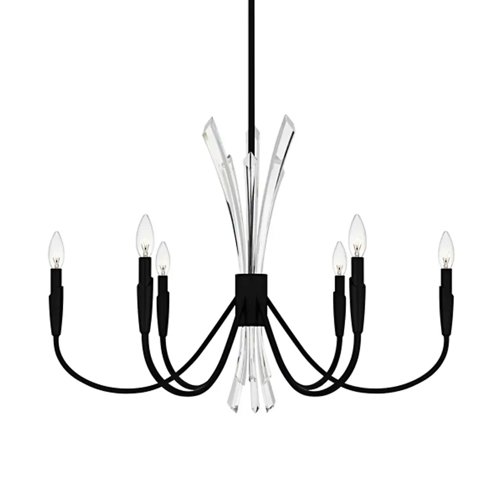 The Cecily Chandelier from Quoizel improves rooms with its distinctive crystal spears bursting from the center hub. Clear crystal elements create dynamic light refraction while gracefully curved arms extend outward to hold candle-style lights. Its central arrangement provides unexpected dimensions, catching light from multiple angles throughout the day. Each curved arm flows naturally from the center, creating a pattern that draws the eye around the entire fixture. This suspension is ideal for dining areas, entryways, or living spaces where distinctive lighting makes a difference.