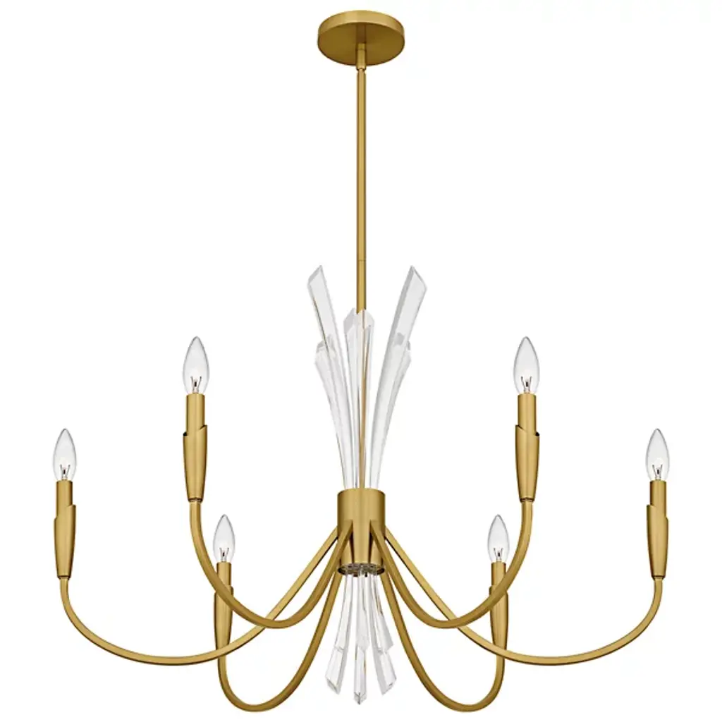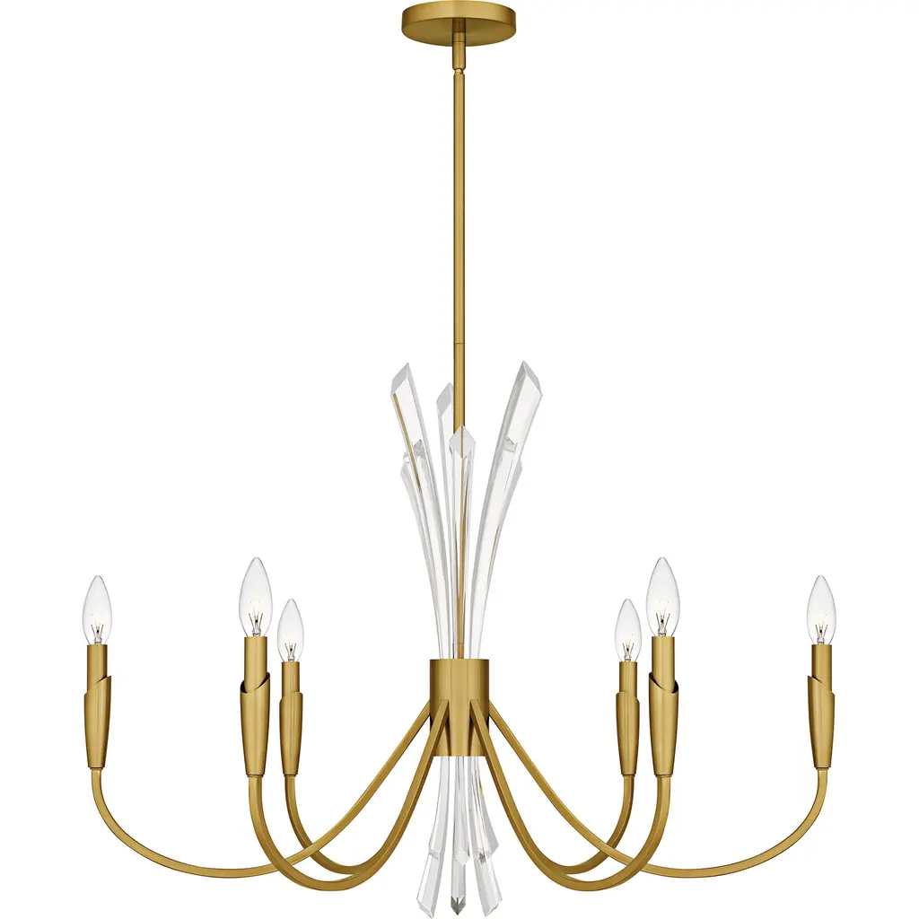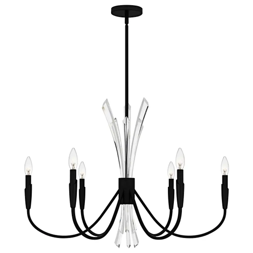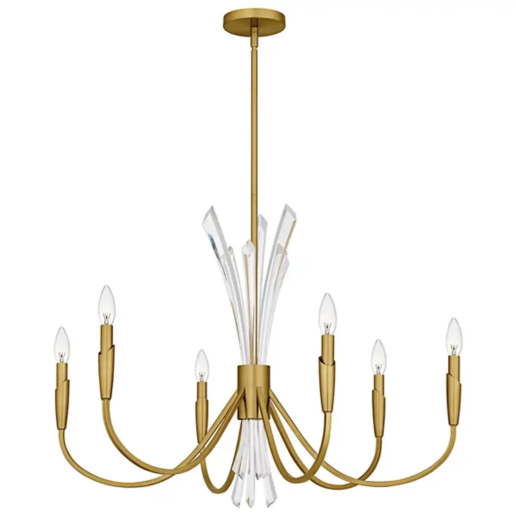 The Cecily Chandelier from Quoizel improves rooms with its distinctive crystal spears bursting from the center hub. Clear crystal elements create dynamic light refraction while gracefully curved arms extend outward to hold candle-style lights. Its central arrangement provides unexpected dimensions, catching light from multiple angles throughout the day. Each curved arm flows naturally from the center, creating a pattern that draws the eye around the entire fixture. This suspension is ideal for dining areas, entryways, or living spaces where distinctive lighting makes a difference.