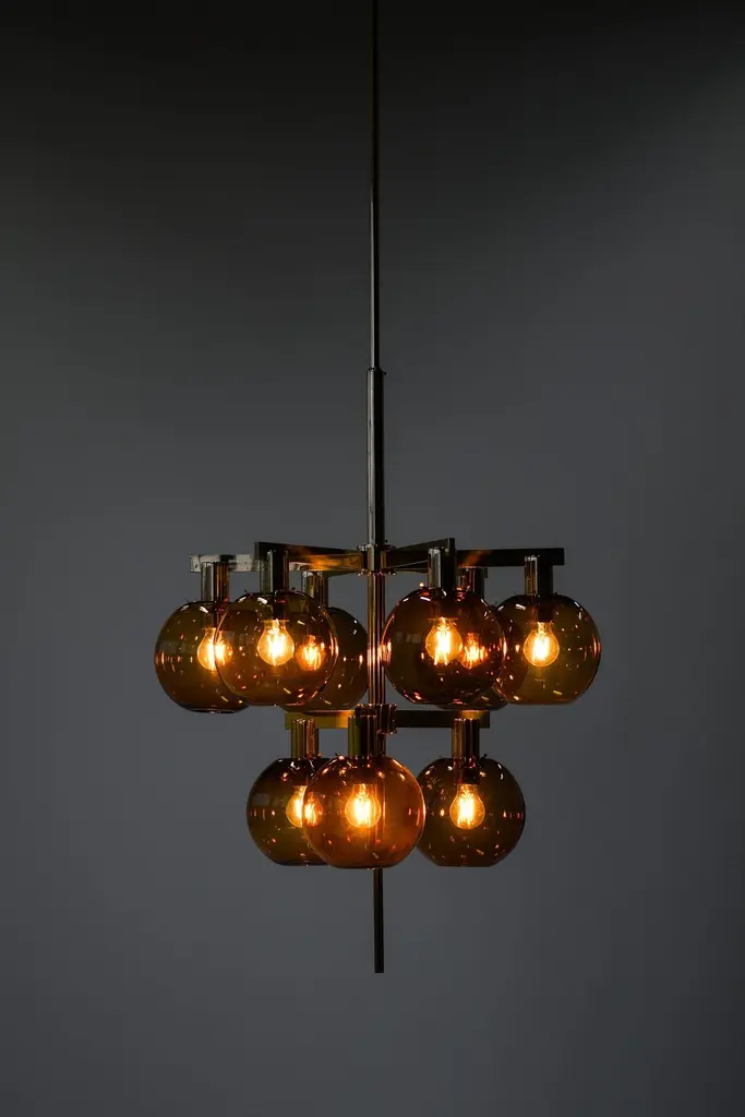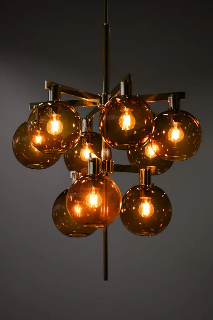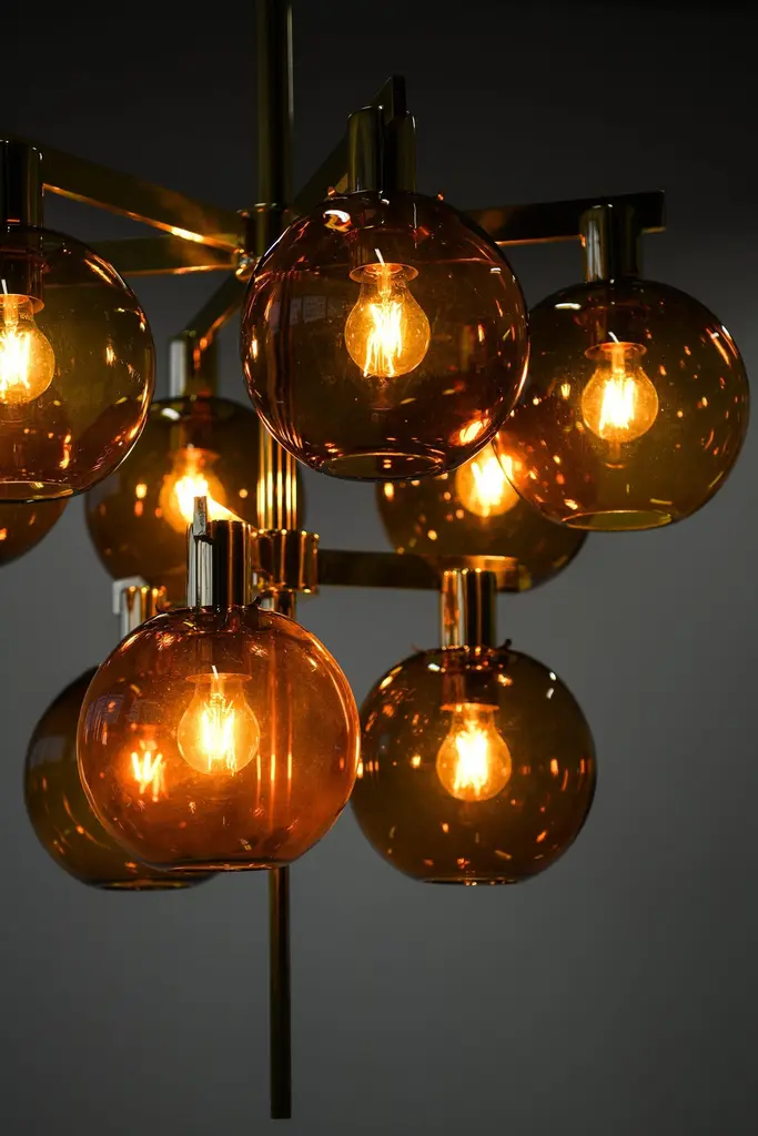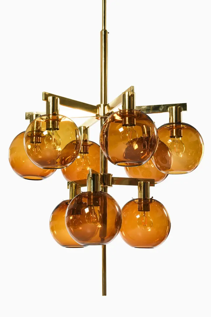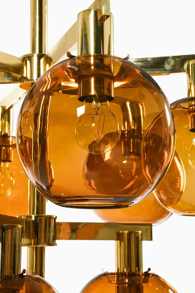 Ceiling Lamp Chandelier In Brass And Amber Glass By Hans-Agne Jakobsson, 1950's