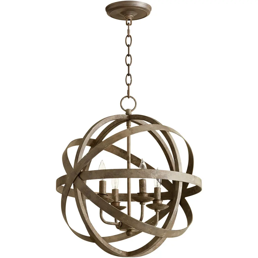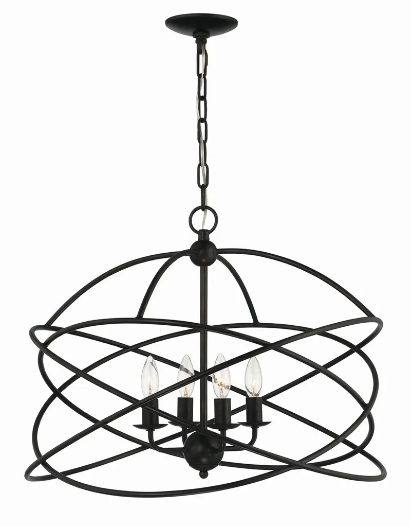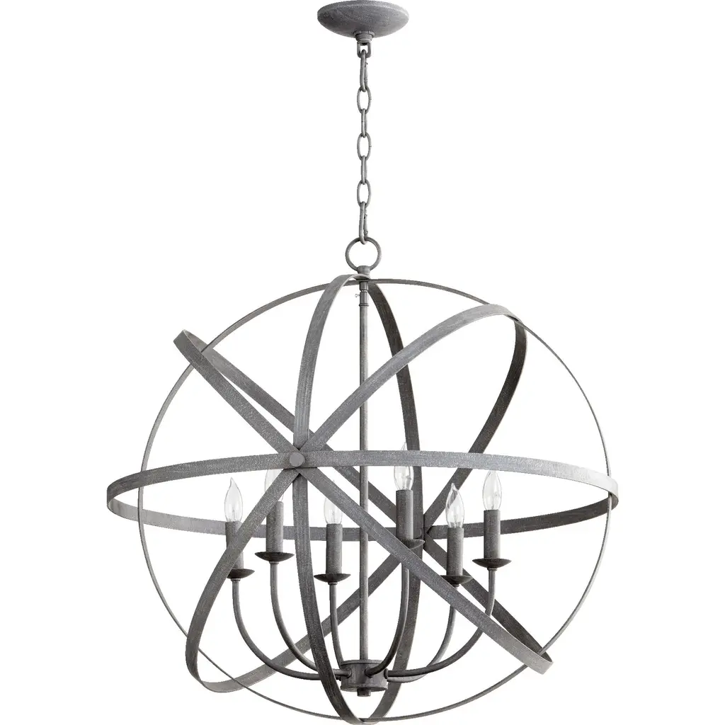 Celestial indeed. The Celeste Sphere Chandelier from Quorum International is a showstopper. Its radiating contours capture the imagination with or without the lights on. Metal rings move in a circulating formation; the open spaces in between them are outlined by a perpendicular ring highlighting its sense of trajectory. Elegant arms rise with gentle curves; they each hold a charming bobeche accent and a compact lamp holder. Its light is simply captivating, grazing past the edges of the framework in a warm glow while creating a starry silhouette.