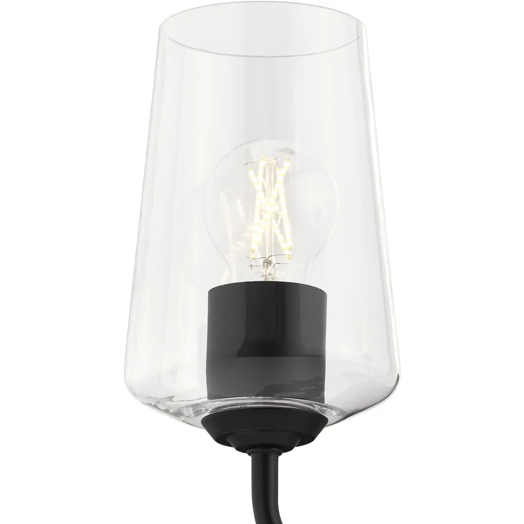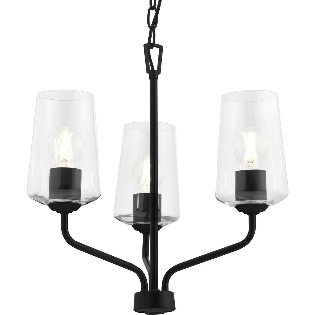 Illuminate your space with the refined elegance of the Celino 3-Light Small Chandelier. With shades inspired by the graceful silhouette of hand-crafted crystal wine glasses, each light fixture is a testament to meticulous artistry and timeless design. The perfectly proportioned clear glass shades offer a seamless and visually stunning form that delivers bright light to the surrounding space. Polished metal arms finished in crisp Black curve upwards, cradling the glass shades with a gentle embrace. Lighting from the Celino will infuse your home with a sophisticated and inviting ambiance.