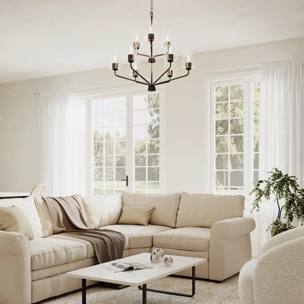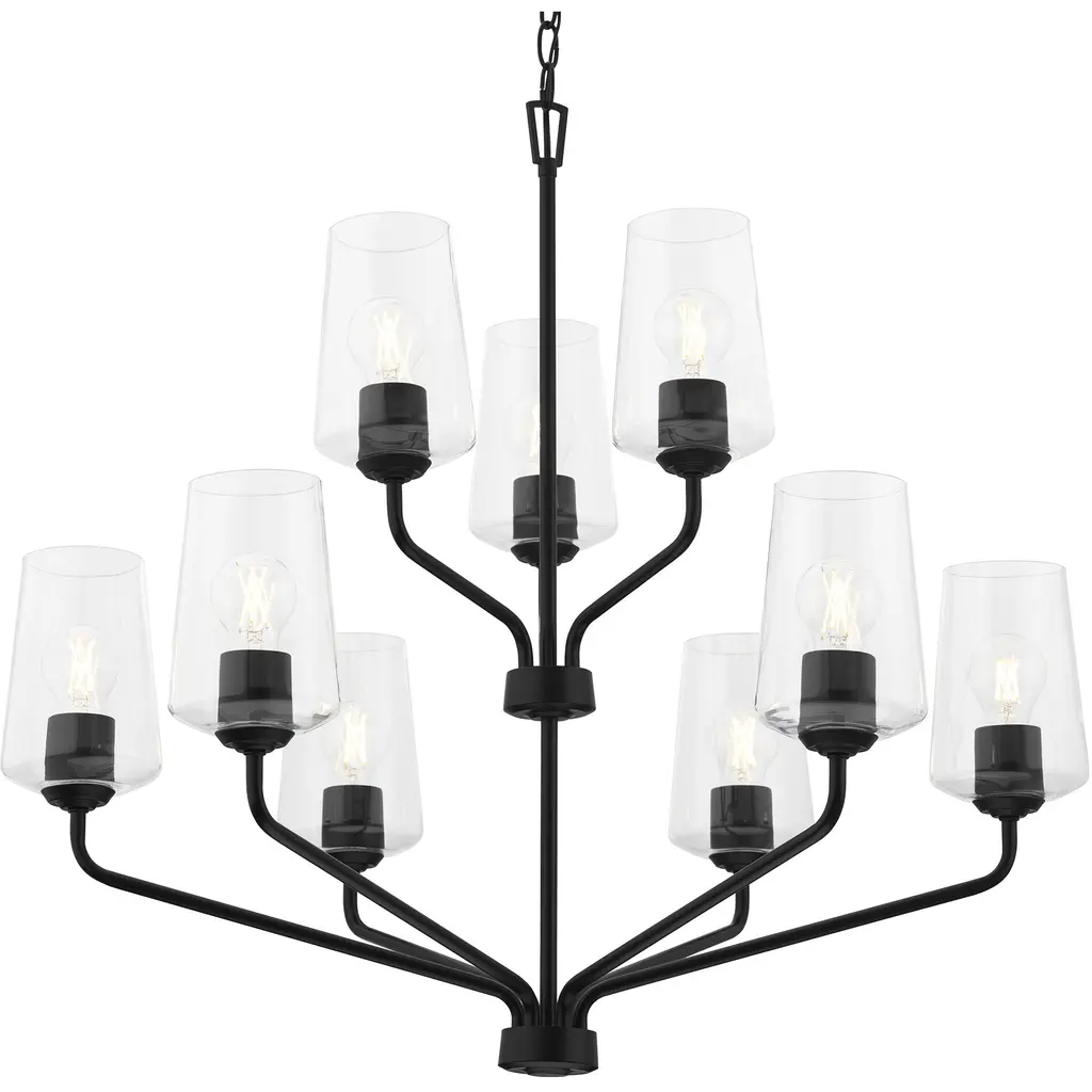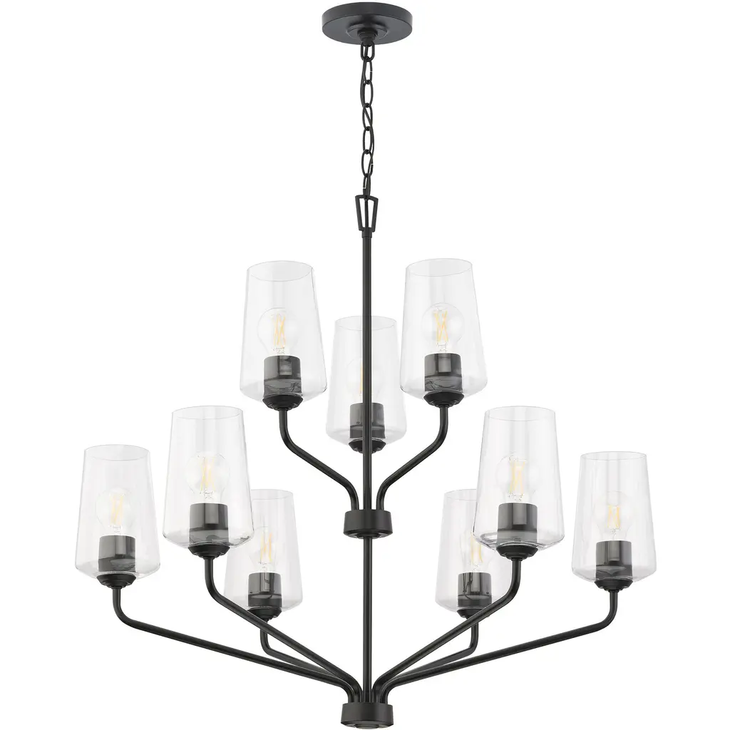 Illuminate any large space with the refined elegance of the Celino 9-Light, 2-Tiered Chandelier. With shades inspired by the graceful silhouette of hand-crafted crystal wine glasses, each light fixture is a testament to meticulous artistry and timeless design. The perfectly proportioned clear glass shades offer a seamless and visually stunning form that delivers bright light to the surrounding space. Expansive, polished metal arms finished in crisp Black curve upwards, cradling the glass shades with a gentle embrace. Lighting from the Celino will infuse your home with a sophisticated and inviting ambiance.
