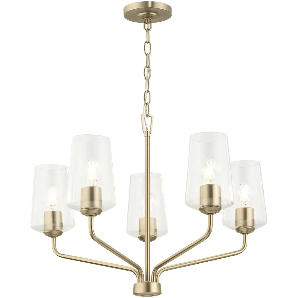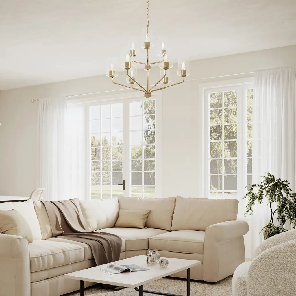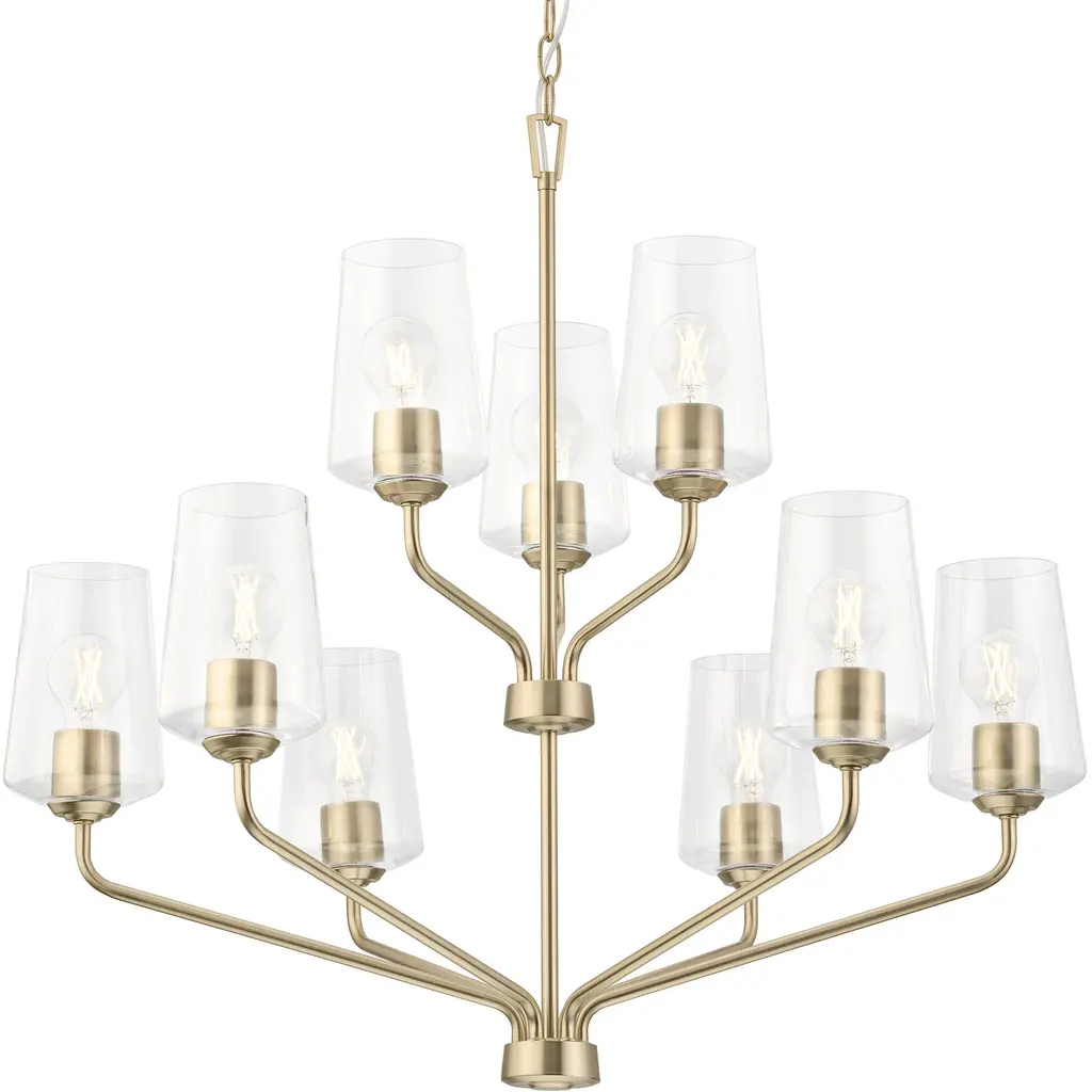 Illuminate any large space with the refined elegance of the Celino 9-Light, 2-Tiered Chandelier. With shades inspired by the graceful silhouette of hand-crafted crystal wine glasses, each light fixture is a testament to meticulous artistry and timeless design. The perfectly proportioned clear glass shades offer a seamless and visually stunning form that delivers bright light to the surrounding space. Expansive, polished metal arms finished in rich Champagne Bronze curve upwards, cradling the glass shades with a gentle embrace. Lighting from the Celino will infuse your home with a sophisticated and inviting ambiance.