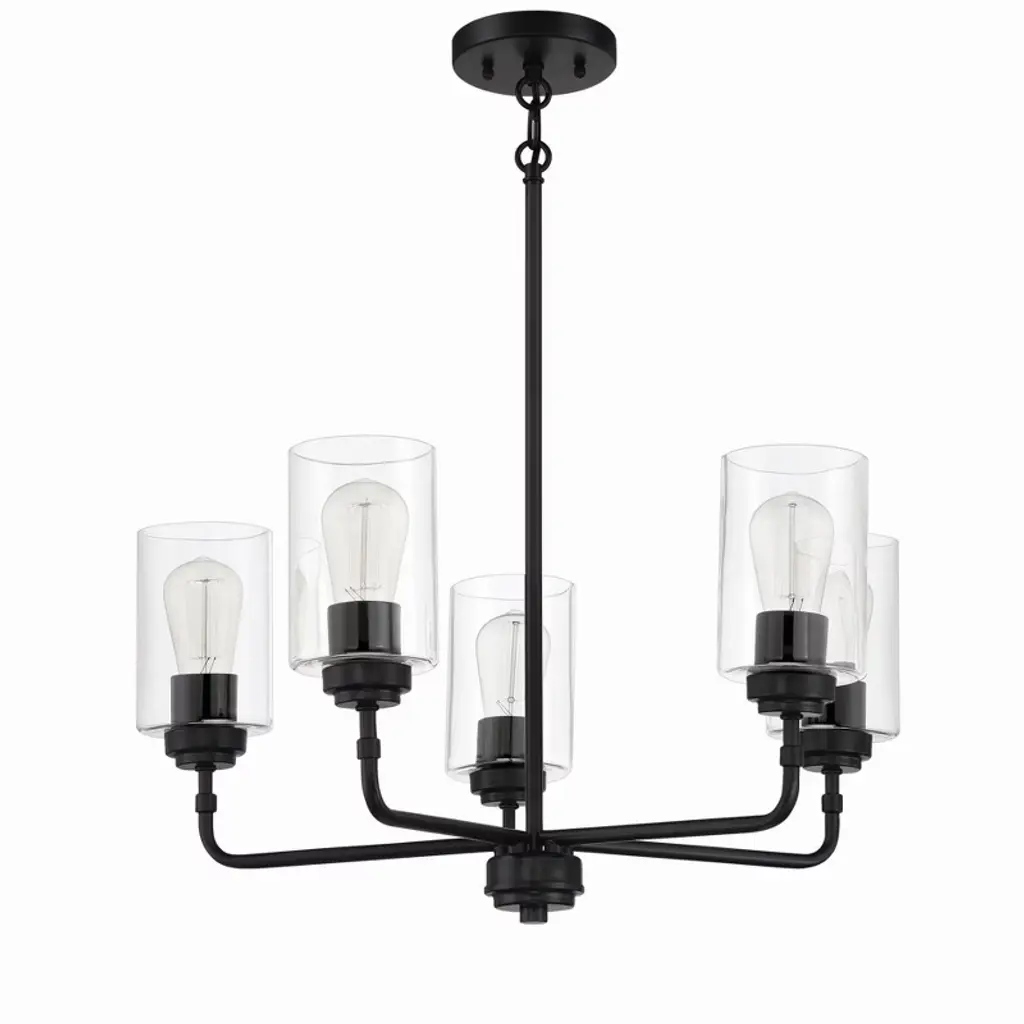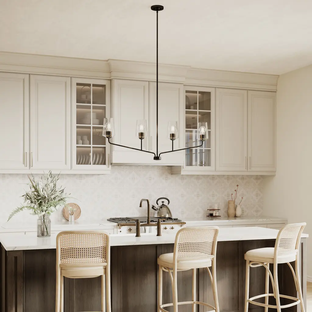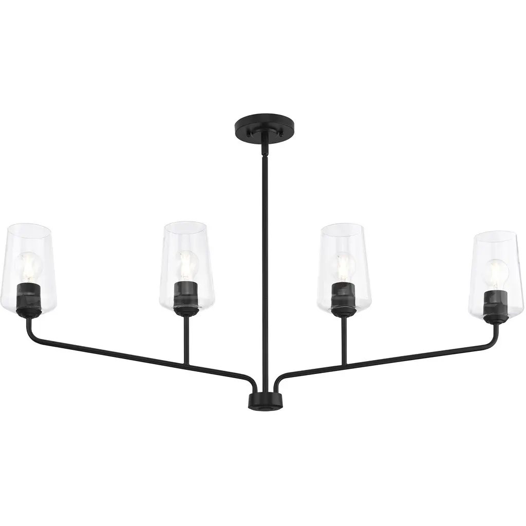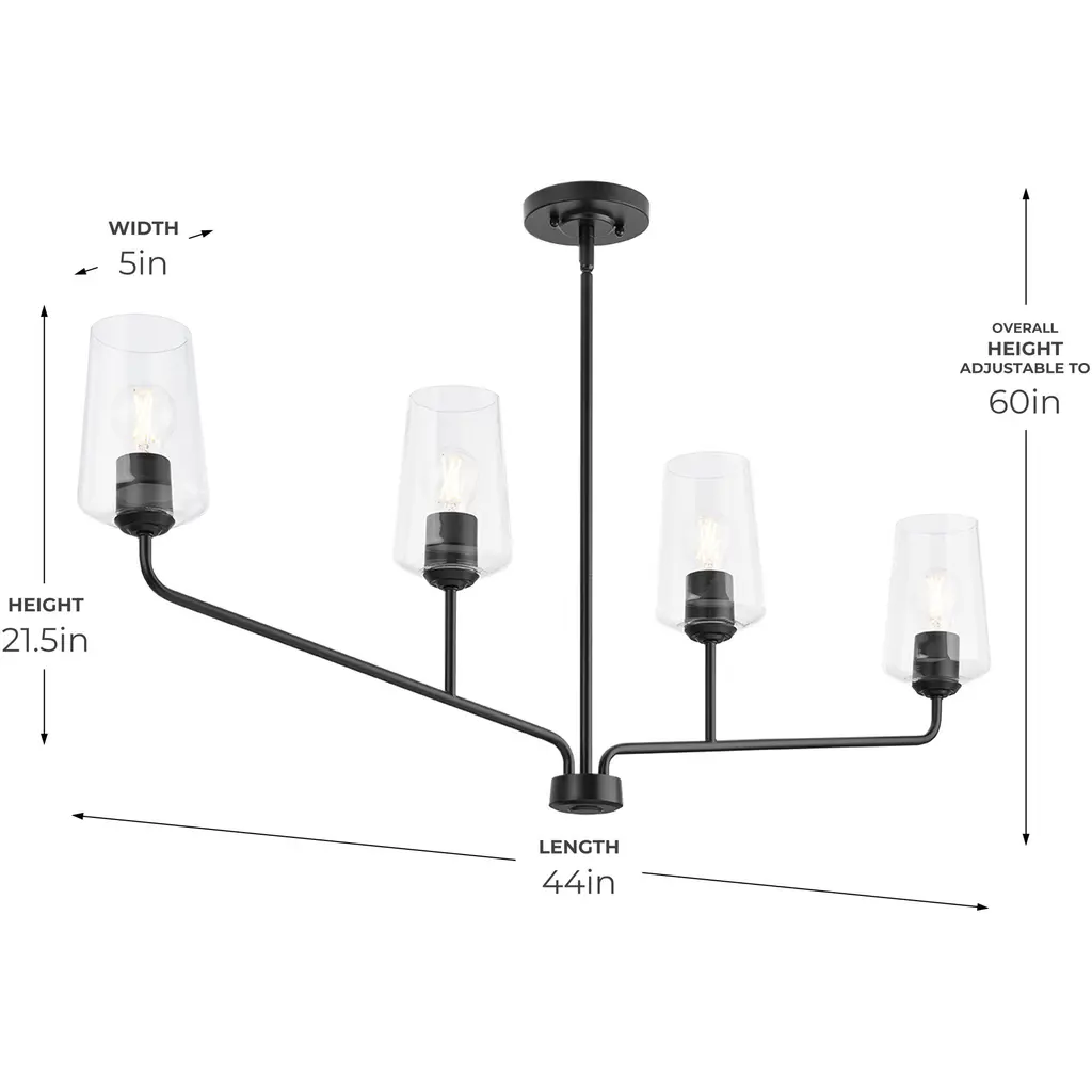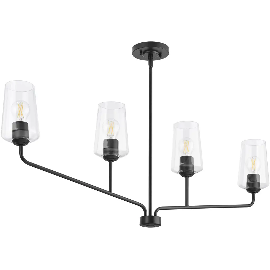 Illuminate your space with the refined elegance of the Celino 4-Light Linear Chandelier. With shades inspired by the graceful silhouette of hand-crafted crystal wine glasses, each light fixture is a testament to meticulous artistry and timeless design. The perfectly proportioned clear glass shades offer a seamless and visually stunning form that delivers bright light to the surrounding space. Polished metal arms finished in crisp Black extend outward, cradling the glass shades with a gentle embrace. Lighting from the Celino will infuse your home with a sophisticated and inviting ambiance.