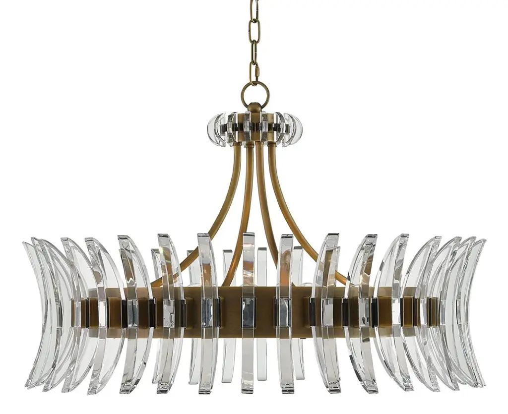 Create a visually distinct look with this matchless chandelier. Its antiqued brass silhouette is enclosed by optic crystals formed into a charming half-moon shape. Within its striking composition, there are eight bulbs that shine and illuminate the room.