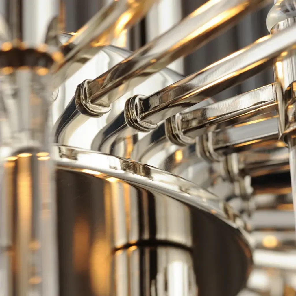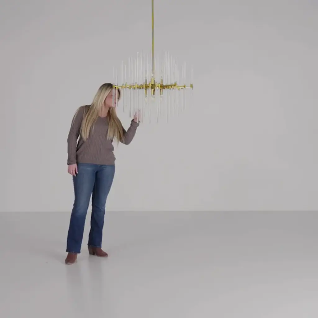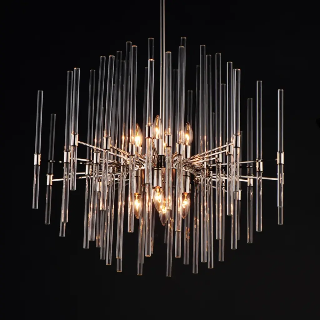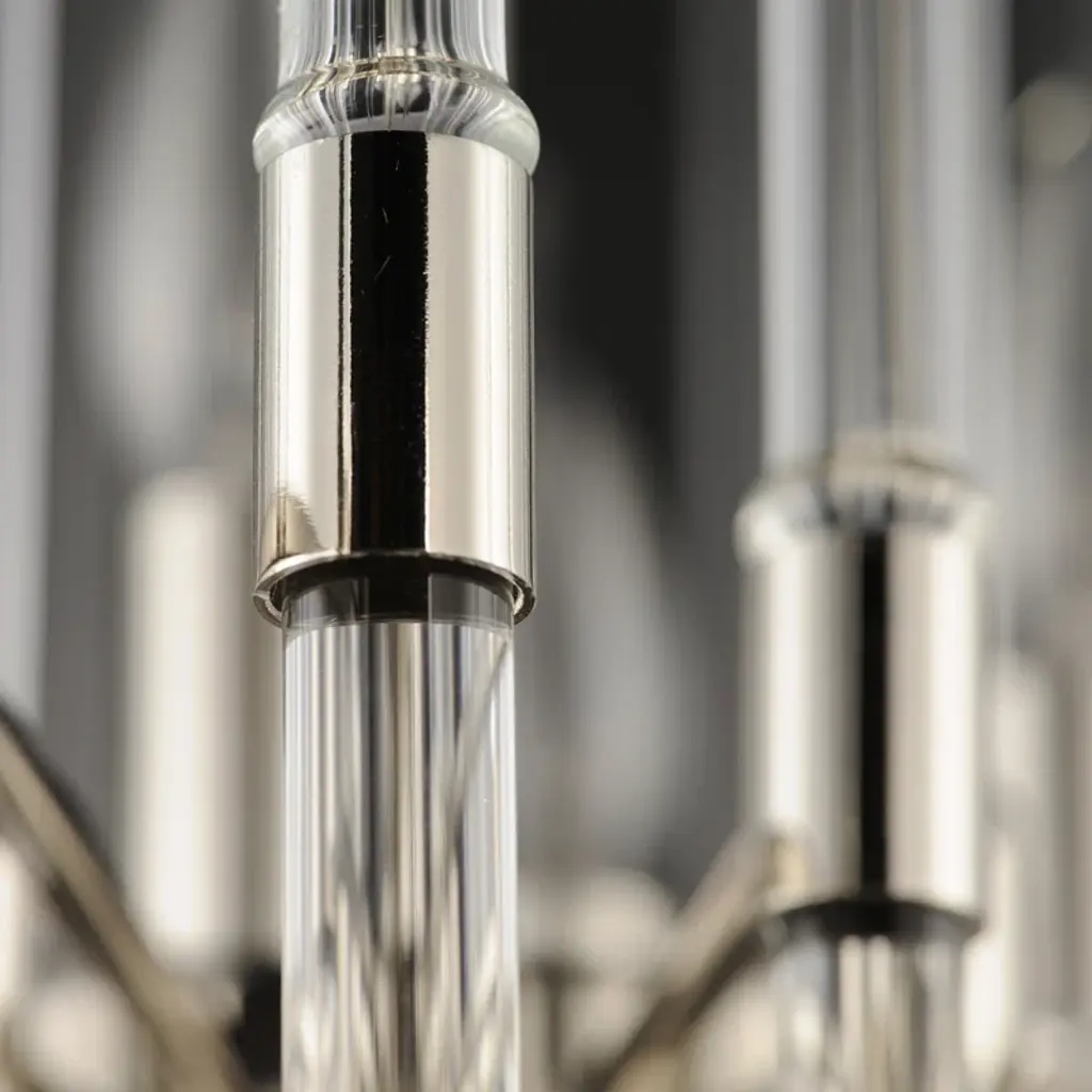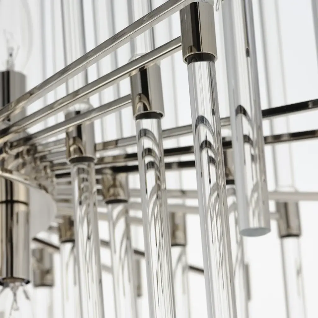 Simple streamlined forms create an unexpectedly lavish effect in this modern chandelier. Its eight lights are refracted through a nimbus of clear glass rods held at varying heights + lengths by steel arms in a bright finish. Install it with a dimmer switch for an adjustable ambiance.