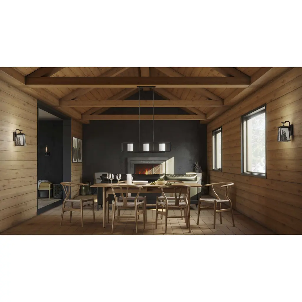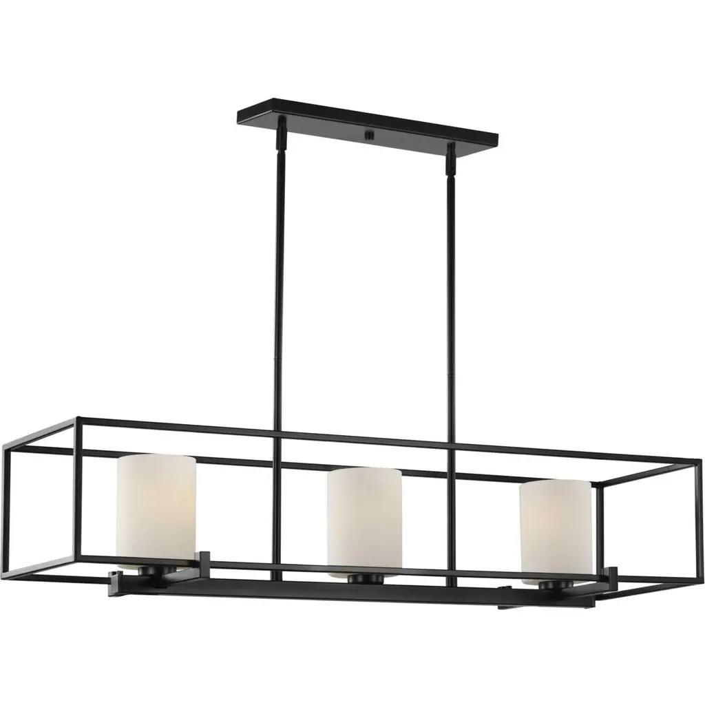 Stick with simple geometric forms and clean crisp lines with the modern Chadwick Collection's Three-Light Matte Black Island Chandelier. A beautiful etched opal glass shade visually calms the sharp edges of the boxy frame in a masterful stroke of design excellence. The frame is coated in a matte black finish that visually contrasts with the light shade. The light fixture is just right for spaces in need of a subtle, feminine touch.