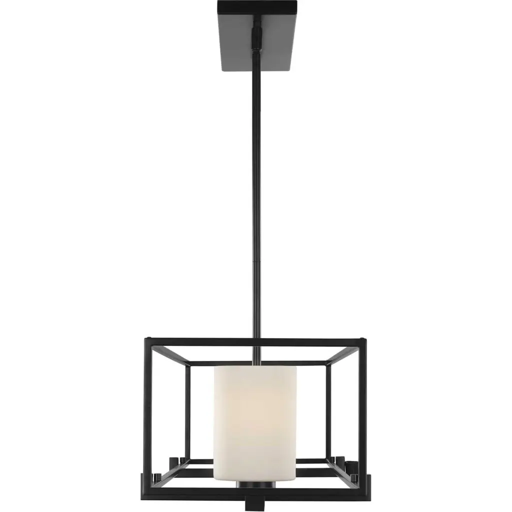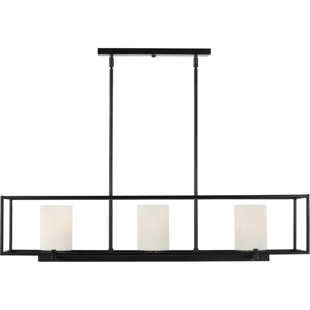 Stick with simple geometric forms and clean crisp lines with the modern Chadwick Collection's Three-Light Matte Black Island Chandelier. A beautiful etched opal glass shade visually calms the sharp edges of the boxy frame in a masterful stroke of design excellence. The frame is coated in a matte black finish that visually contrasts with the light shade. The light fixture is just right for spaces in need of a subtle, feminine touch.