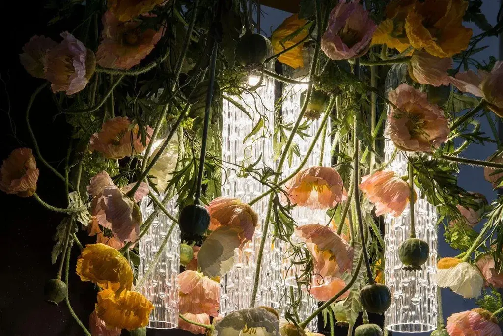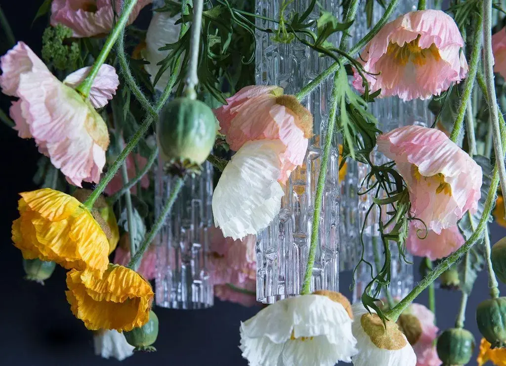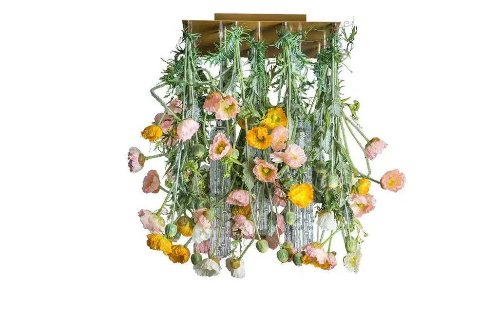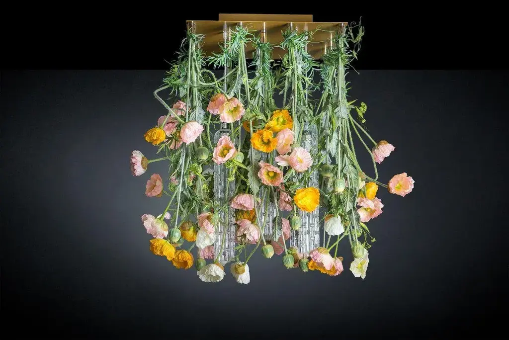 Chandelier consisting of vg artificial flowers and pipes in muranese glass, led bulbs (6 bulbs gu10 x 6w each) fitted with fixing plate in varnished steel gold color, to be suspended or ceiling mounted. vg poppies in various colors and different lengths are supplied as the standard versions, creating a vegetative flowerbed. plate size is approx 15 cm shorter in length and width than volume dimensions. up to 250v (europe/uk standard).