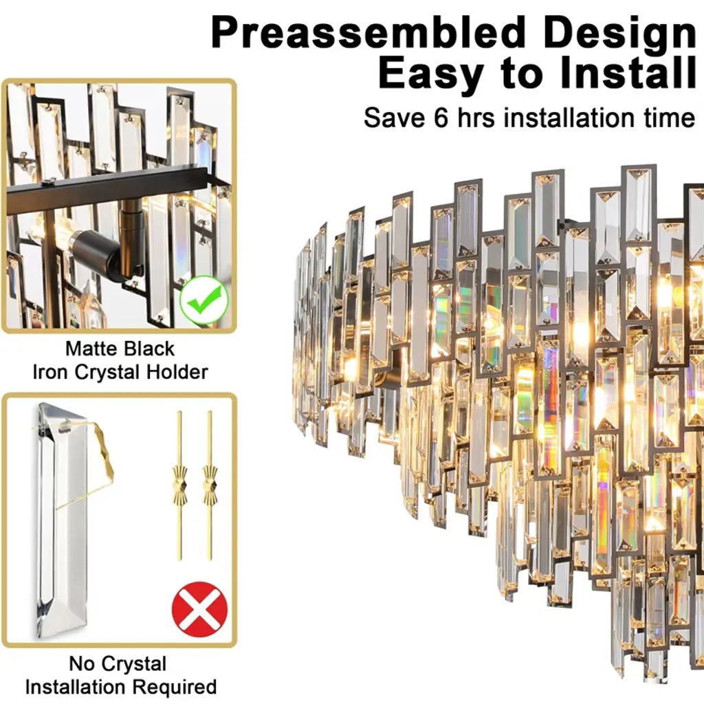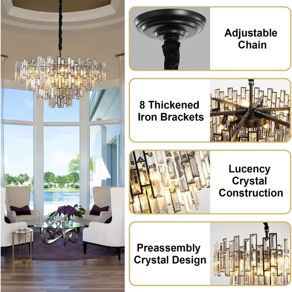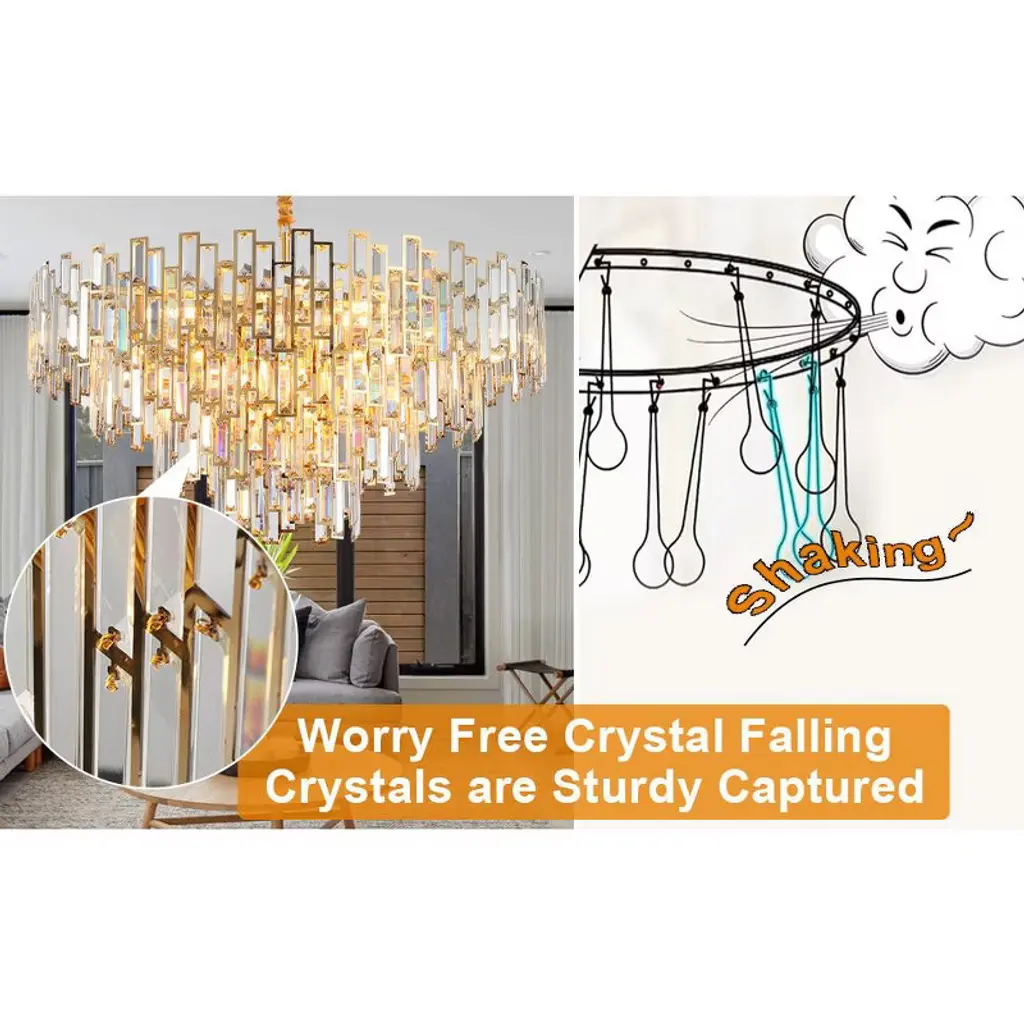 The luxury crystal chandelier is made of 8-thickaned iron brackets and upgraded crystal construction. The surface of the iron brackets are coated with anti-oxidation to prevent rust and corrision, and secure the crystals in place, achieving a perfect natural balance. Fairmly grasps the ceiling, the thickened metal ensures that it will not fall off during suspendion, ensuring safety and firmness. The modern K9 crystal chandelier clear multi-faced crystals reflect the beauty of brilliant gemstones, and the upgraded pendant light is more colorful and gorgeous than other same type chandeliers. It's perfect for living room, dinning room, bedroom, foyer, staircase, and etc.