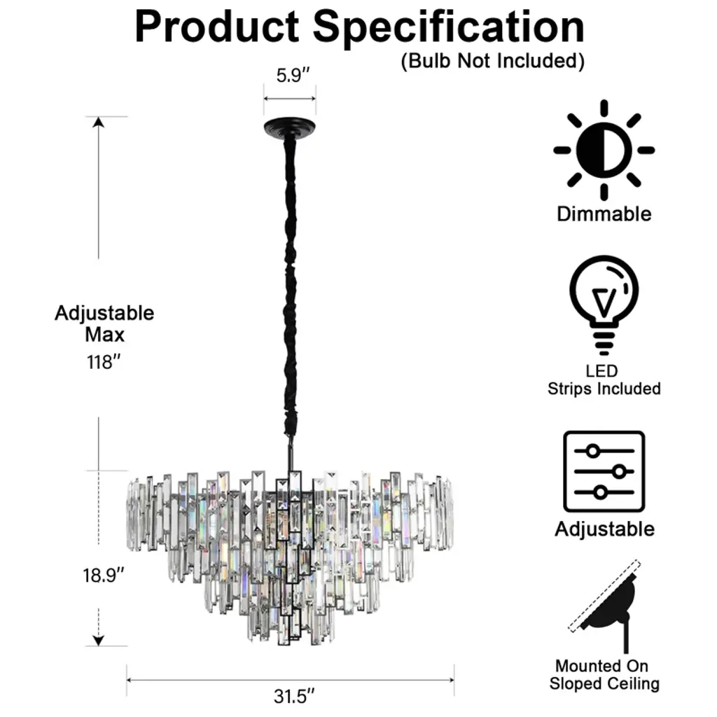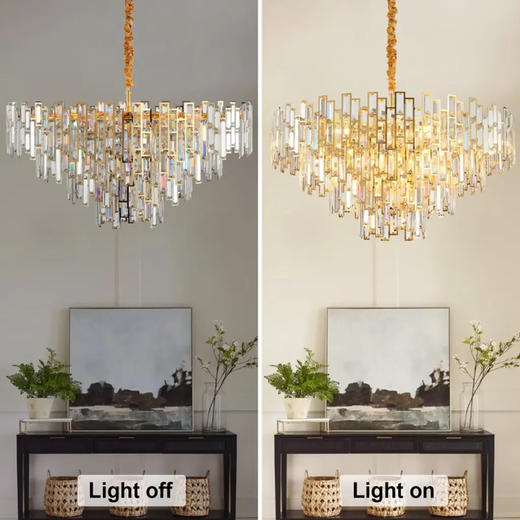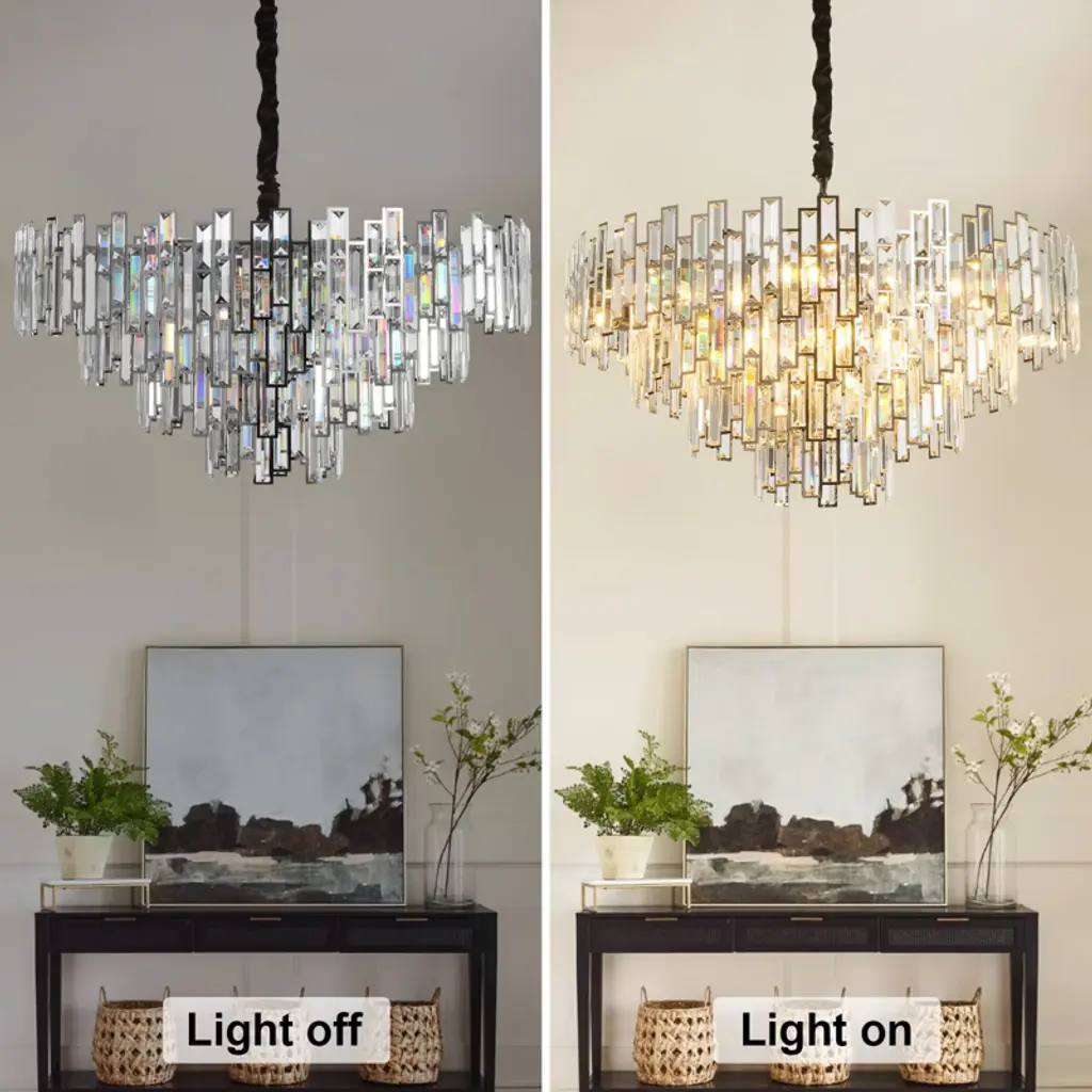 The luxury crystal chandelier is made of 8-thickaned iron brackets and upgraded crystal construction. The surface of the iron brackets are coated with anti-oxidation to prevent rust and corrision, and secure the crystals in place, achieving a perfect natural balance. Fairmly grasps the ceiling, the thickened metal ensures that it will not fall off during suspendion, ensuring safety and firmness. The modern K9 crystal chandelier clear multi-faced crystals reflect the beauty of brilliant gemstones, and the upgraded pendant light is more colorful and gorgeous than other same type chandeliers. It's perfect for living room, dinning room, bedroom, foyer, staircase, and etc.
