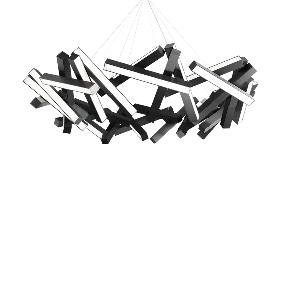 Like piano keys falling through the air, Chaos freezes a moment in time with breathtaking elegance. Ultra-thin powered aircraft cables stabilize the suspension, holding everything in place with as little visual interference as possible, and each section of this sculptural form is equipped with consistent, highly efficient LEDs for refined illumination throughout. Let Chaos reign.