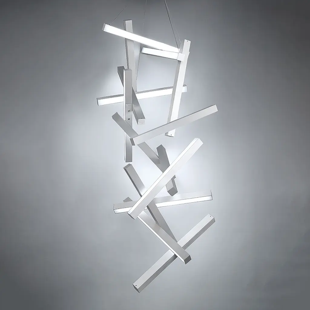Like piano keys falling through the air, Chaos freezes a moment in time with breathtaking elegance. Ultra-thin powered aircraft cables stabilize the suspension, holding everything in place with as little visual interference as possible, and each section of this sculptural form is equipped with consistent, highly efficient LEDs for refined illumination throughout. Available in brushed aluminum, aged brass or black. Let chaos reign.