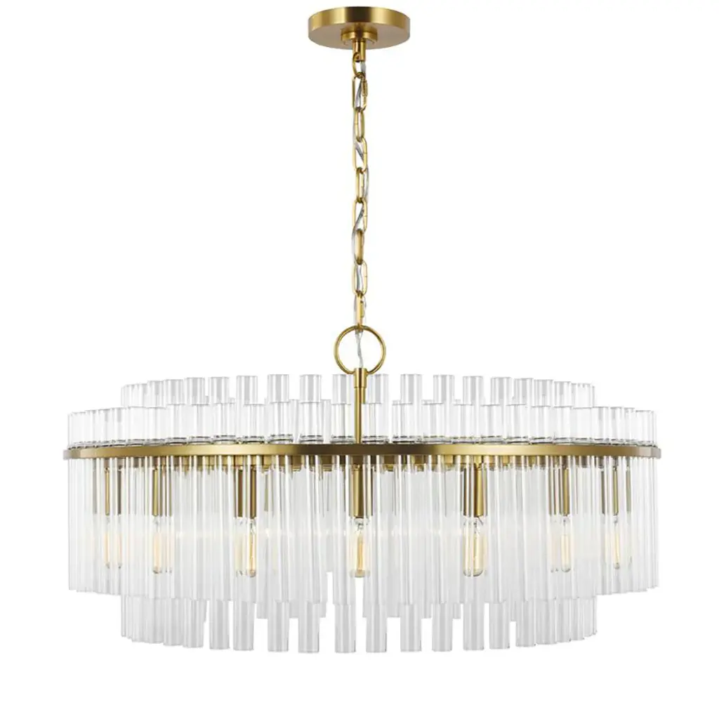 The Beckett family from C&M by Chapman & Myers presents Art Deco forms with a modern minimalist sensibility. Crafted of steel, a round metal band hold the clear extruded glass cylinders in place. The Chapman and Myers Beckett single tier chandelier is the perfect way to achieve your desired fashion or functional needs in your home. Features