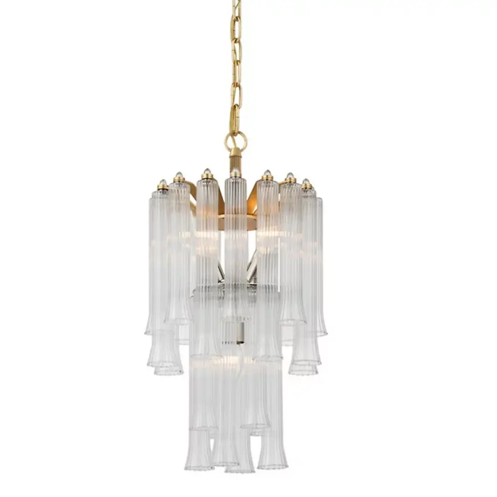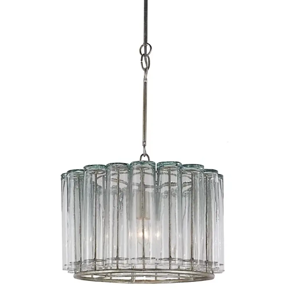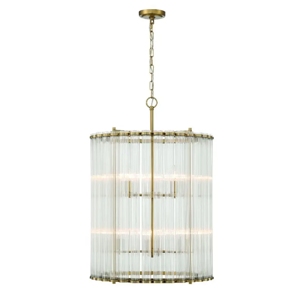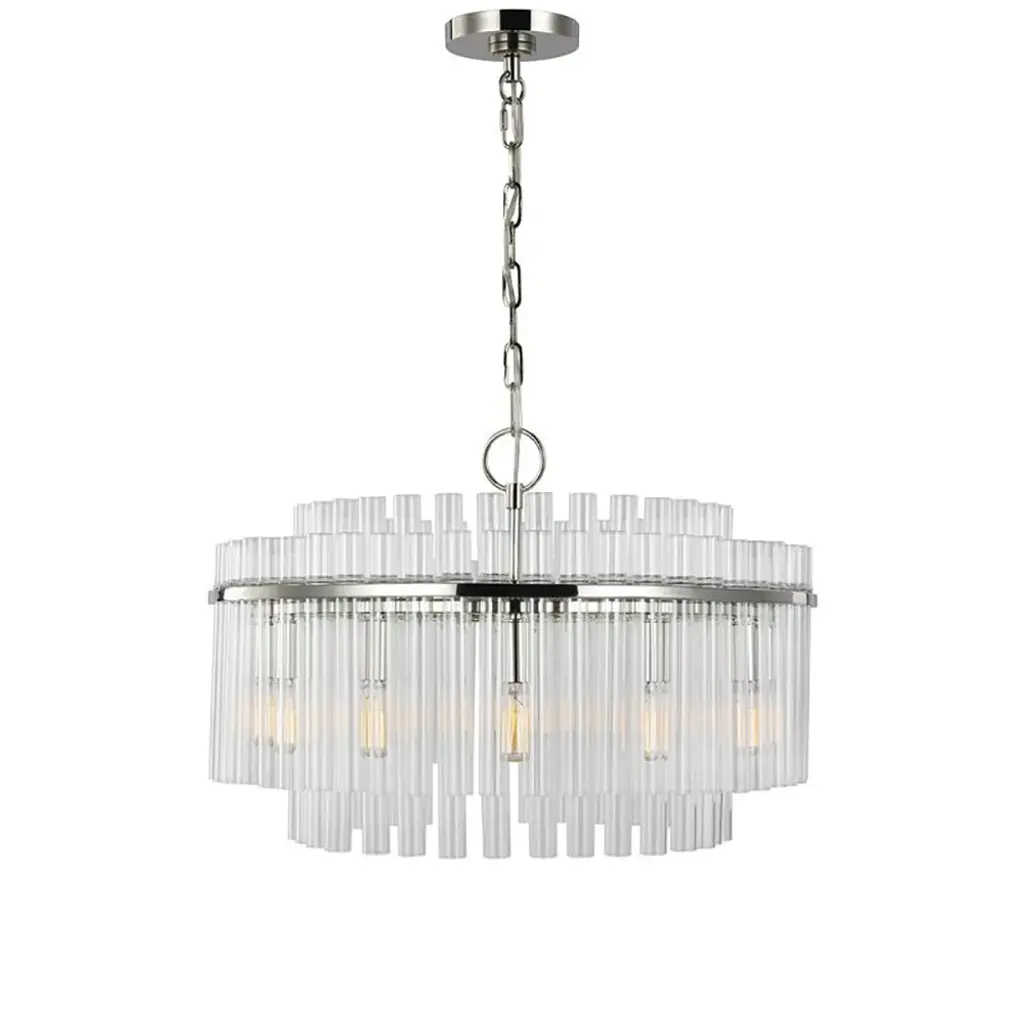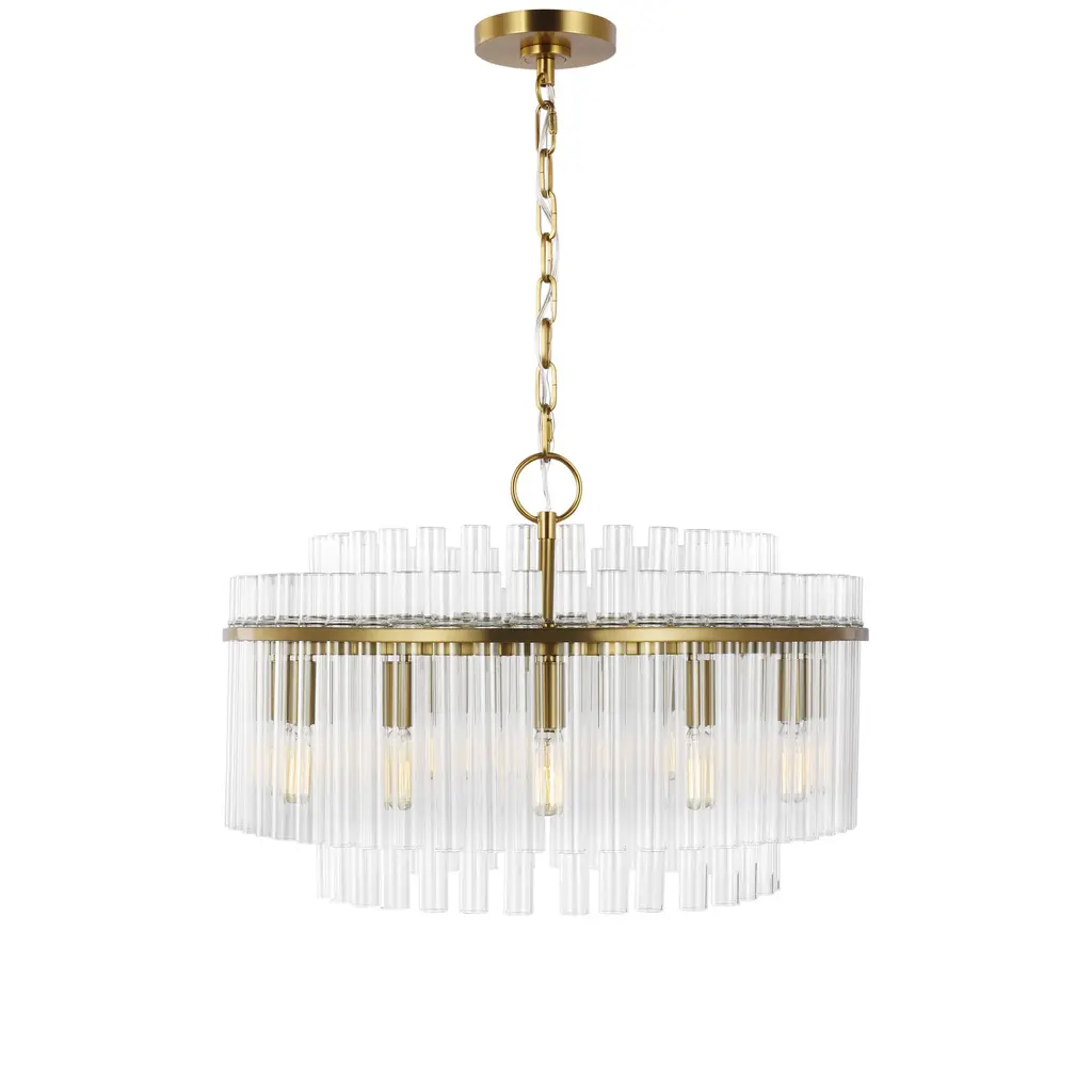 The Beckett family from C&M by Chapman & Myers presents Art Deco forms with a modern minimalist sensibility. Crafted of steel, a round metal band hold the clear extruded glass cylinders in place. The Chapman and Myers Beckett single tier chandelier is the perfect way to achieve your desired fashion or functional needs in your home. Features