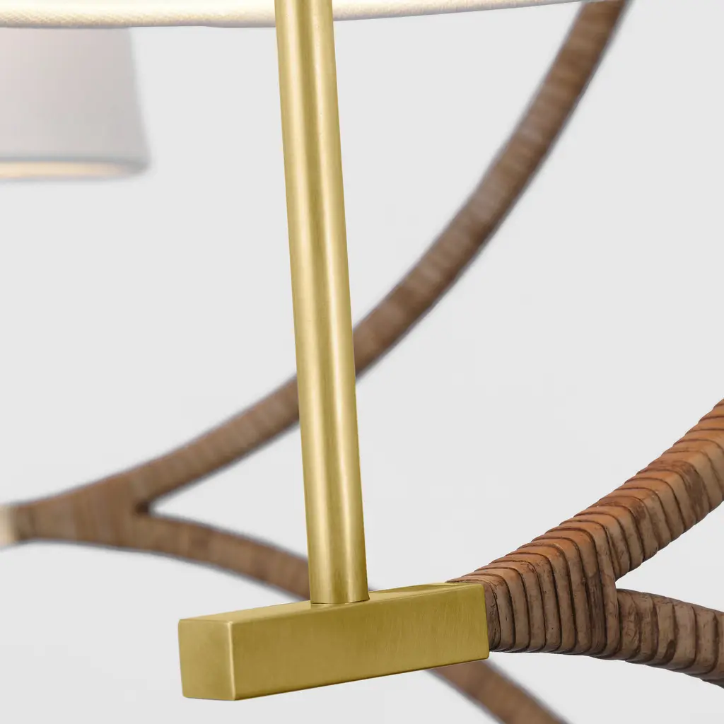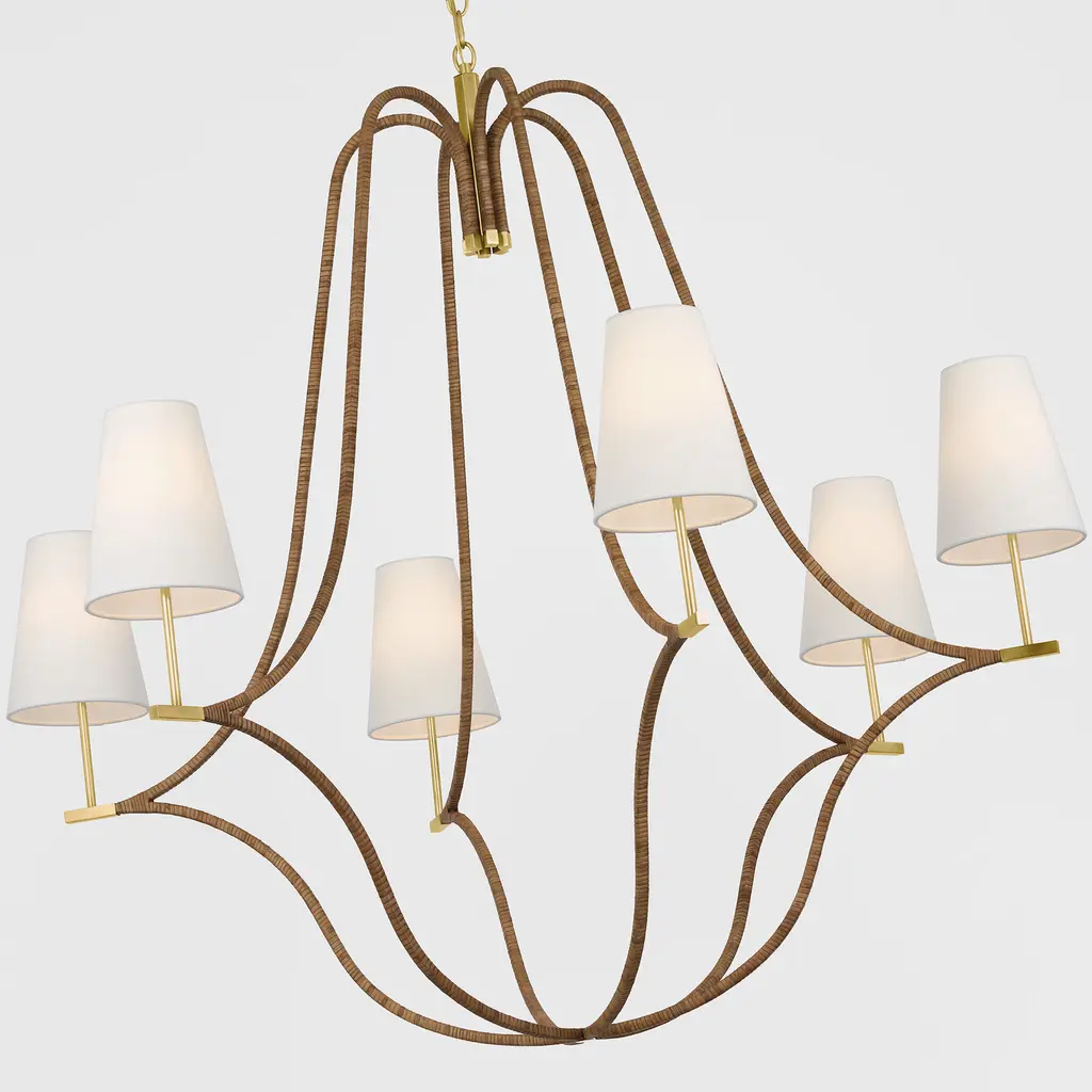 Biscayne Extra Large Wrapped Chandelier in Antique-Burnished Brass and Natural Rattan with Linen Shades