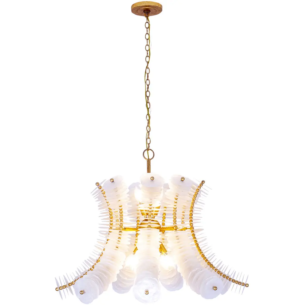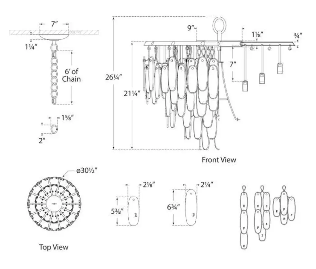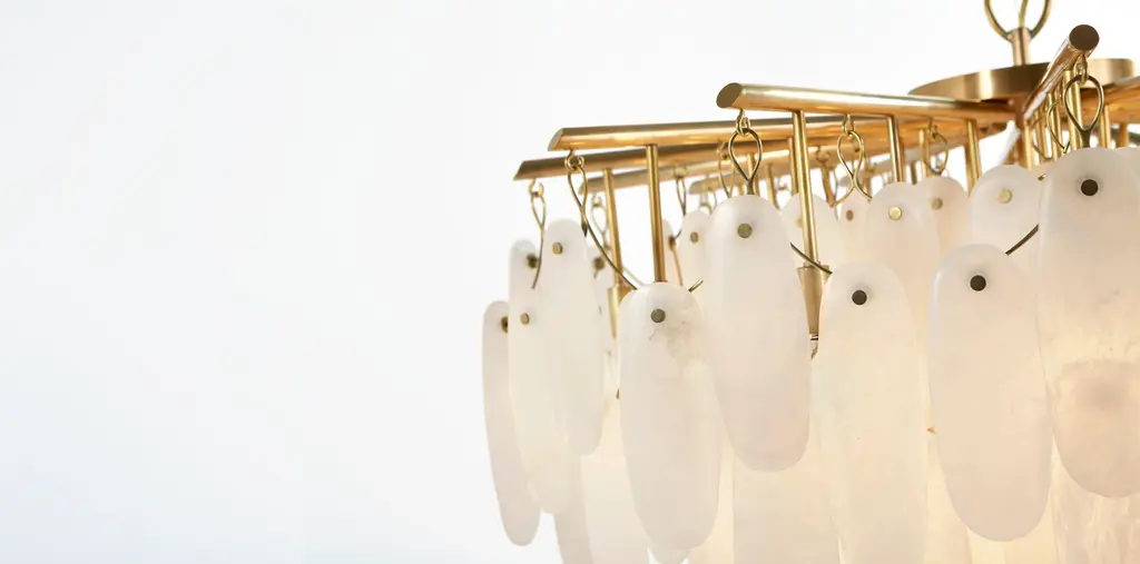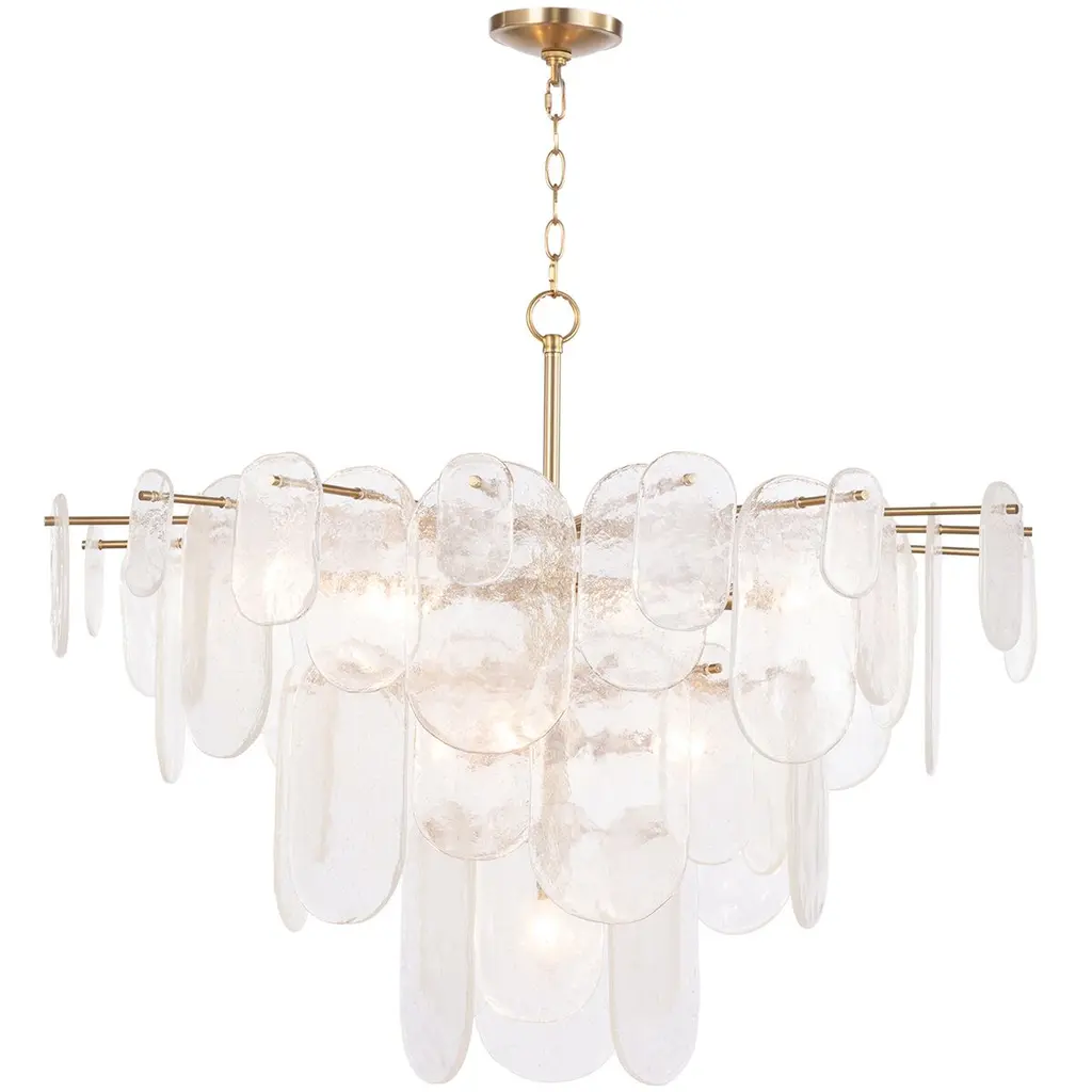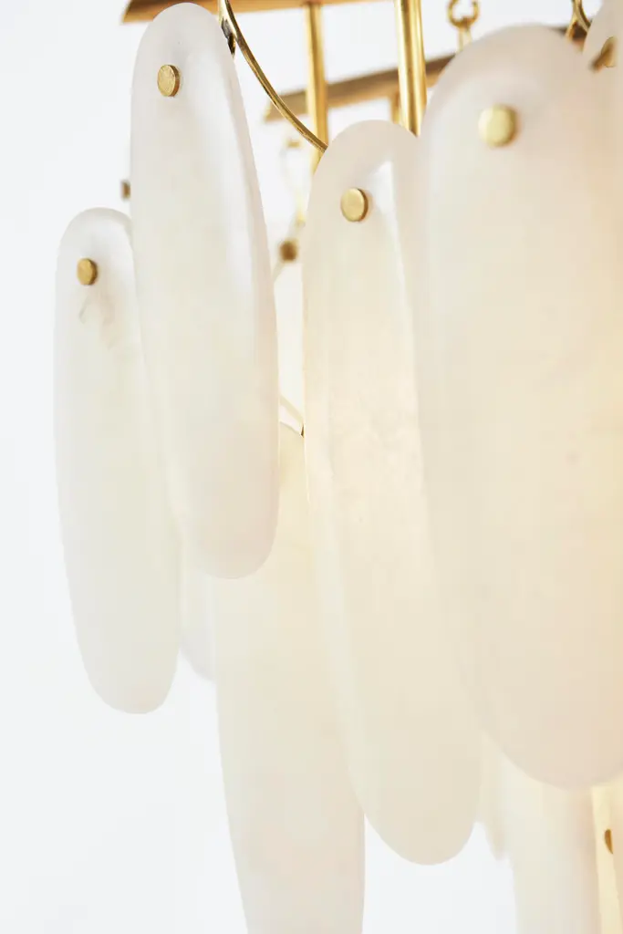 Cora Small Waterfall Chandelier in Antique-Burnished Brass with Alabaster Designer: Chapman & Myers Canopy: 7" Round Mounting: Chain Shade Detail: Alabaster Socket: 35 - E12 Candelabra Wattage: 35 - 3.5 LED B11 Safety Rating Location: DRY Note: Assembly Required