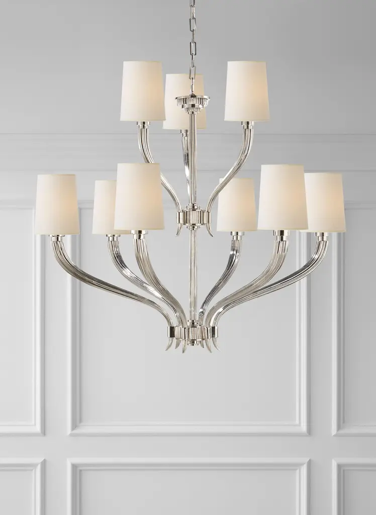 Ruhlmann 2-Tier Chandelier in Polished Nickel with Natural Paper Shades Designer: Chapman & Myers Canopy: 5.5" Round Mounting: Chain Shade Detail: 4" x 5" x 6.5" Natural Paper Socket: 9 - E12 Candelabra Wattage: 9 - 60 B11 Safety Rating Location: DRY