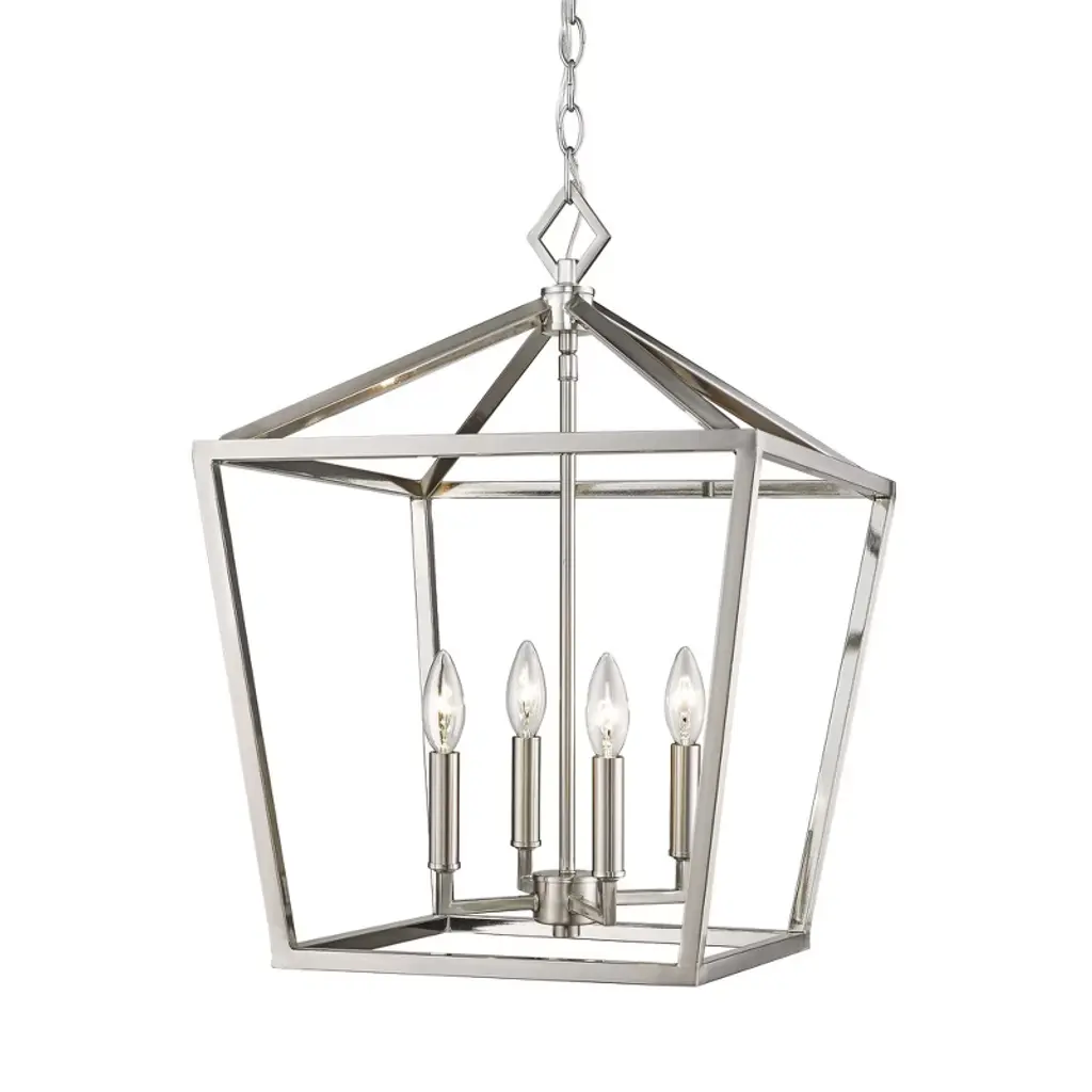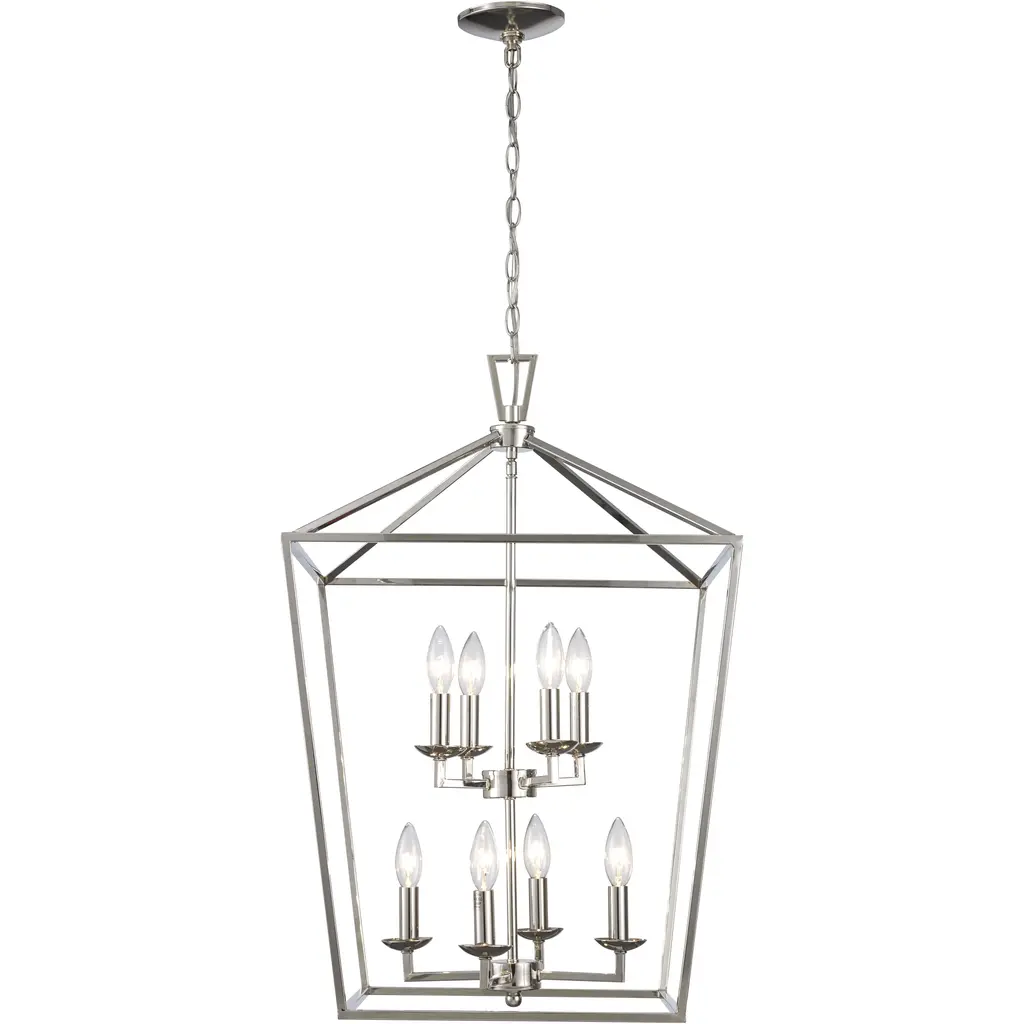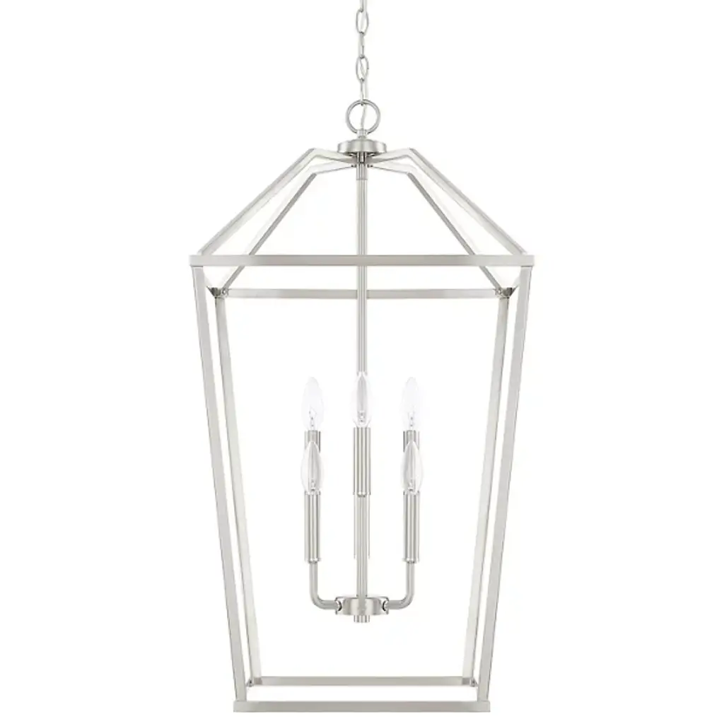 The Chapman and Myers Southold Chandelier in burnished brass or polished nickel provides abundant light to your home while adding style and interest. Southold by Chapman & Myers pairs curves and lines to form a classic geometric silhouette. This new, contemporary lantern has a thin frame that gives it an airy feel, paired with a tight hub for the candelabra. For a more traditional look, Southold is available in Burnished Brass; for a more contemporary look, try Polished Nickel. This lantern series will make any space well-lit and elegant. Crafted of steel and an open, angular frame, this elegant chandelier is ideal for illuminating any space with a warm, inviting glow. Features