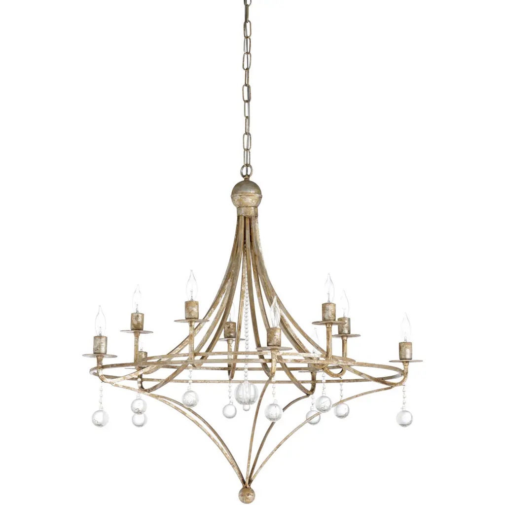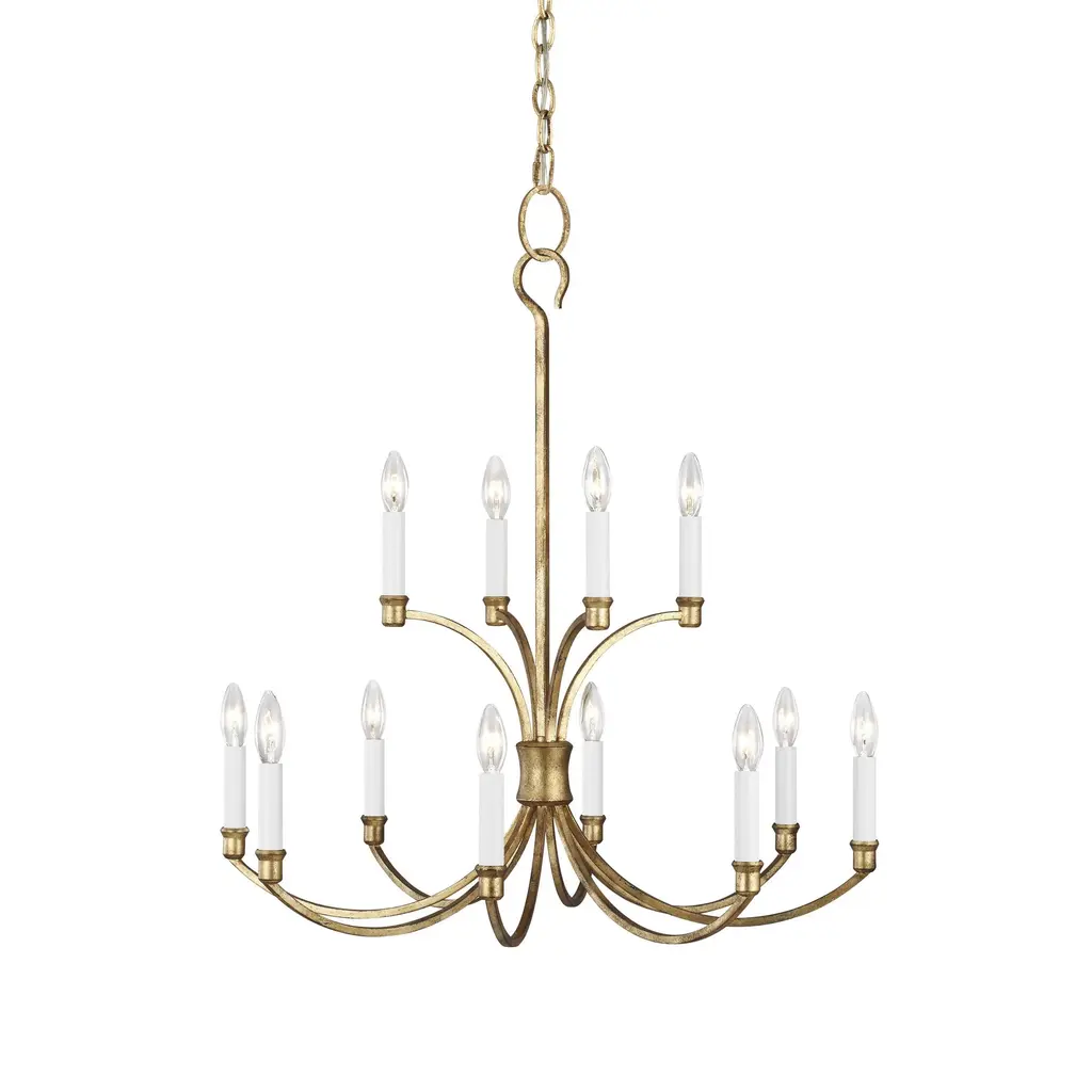 The Chapman and Myers Westerly Chandelier in antique gild or smith steel makes a stunning addition to an entryway, great room, or above a large dining table. Designed by Chapman & Myers , Westerly features flowing arms and an exposed candelabra. The sculpted lines and hook with loop detail at the top and on the canopy lend designer flair and polish. Select the best size for your space and tailor the look with either Antique Gild for a chic, metallic feel. This simply framed chandelier has a minimal form inspired by architectural cove molding. The lower arm curves seamlessly into the upper creating an elegant balanced frame. Two tiers of candle-style lights on graceful, sweeping arms. Assortment includes a large and small 12-light chandelier. Features
