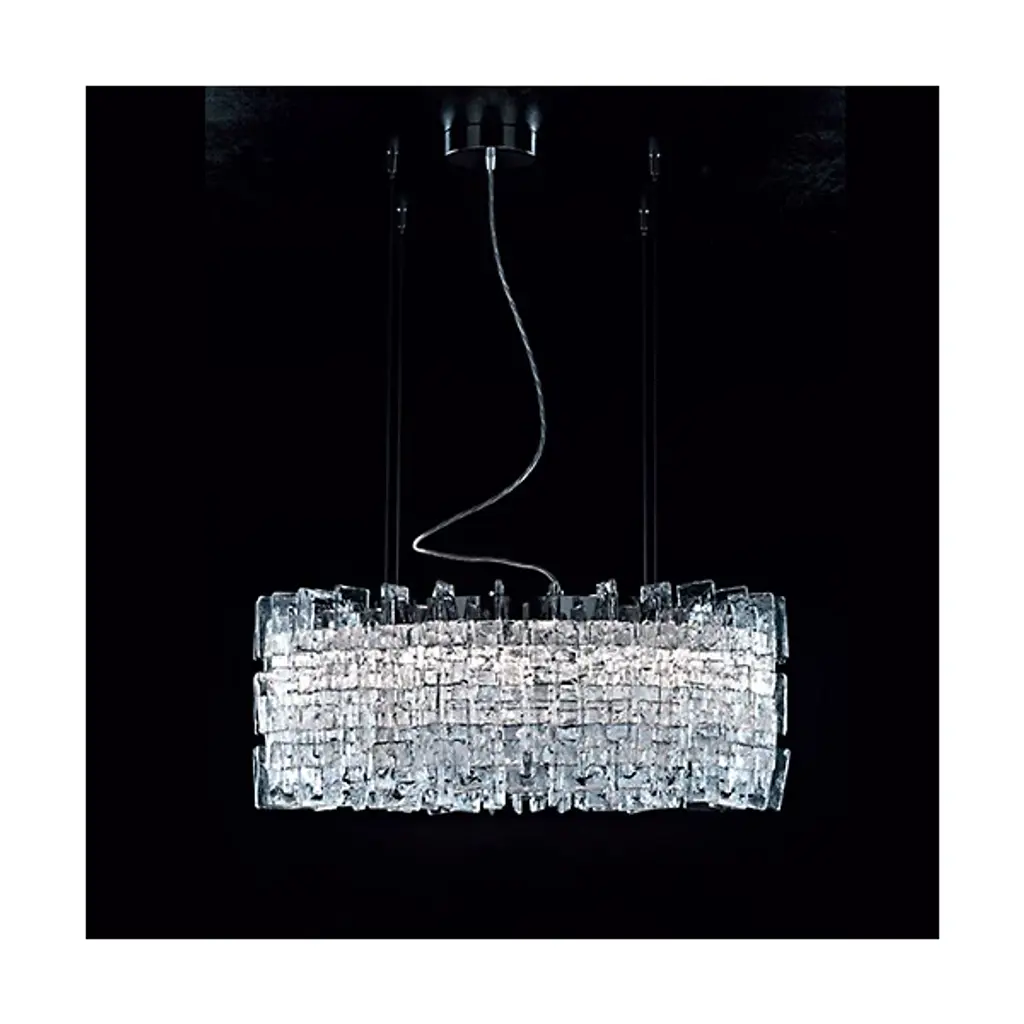 Pure class in a c-shaped composition. The Charlie Chandelier from Mazzega 1946 is all about the letter C as an interlocking design of dazzling handcrafted glass shapes. Born and raised in Murano, Italy, the MoMA-included Carlo Nason pays respect to his hometown’s traditions in glass with a modern design taste. Nason shows the beauty of the glass material by breaking up the traditional chandelier into reflective and repeating shapes. The hooking glass elements combine to create a grand drum silhouette. From everywhere you look at it, the chandelier presents layers of dazzling texture. The lamping inside sets the already inspiring glass ablaze with gorgeous highlights. Light travels in every direction to create a filling glow and an elevated ambiance.