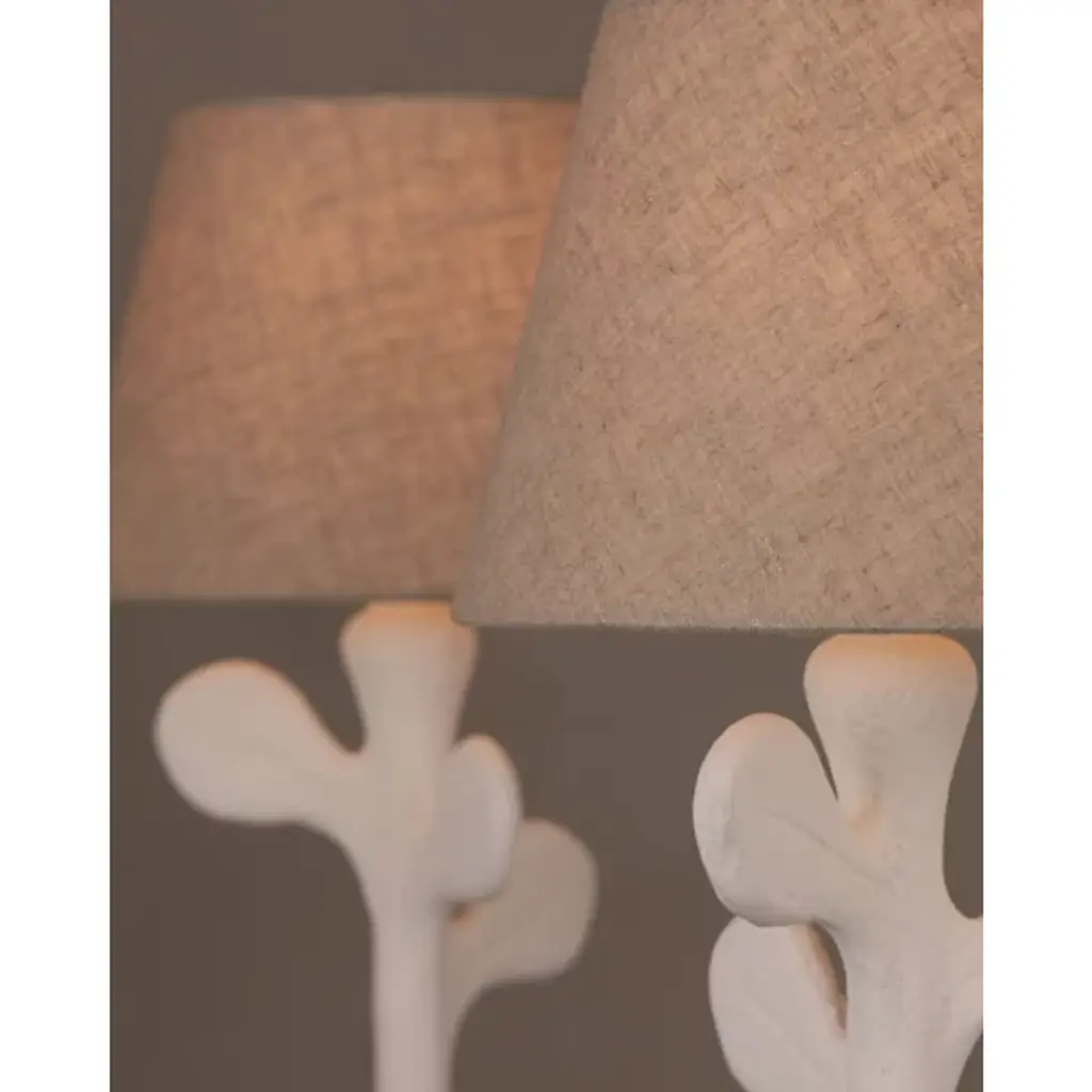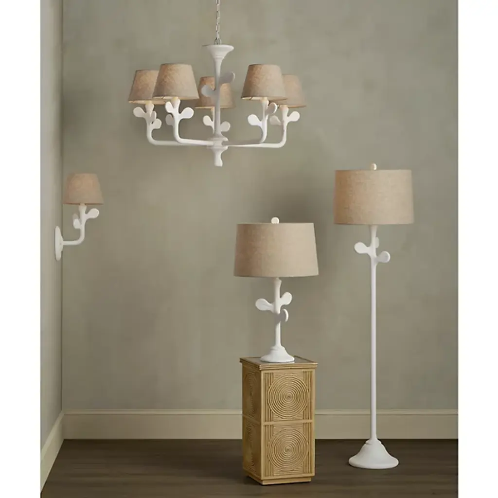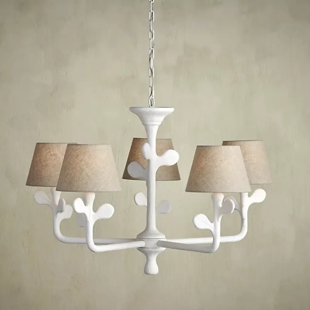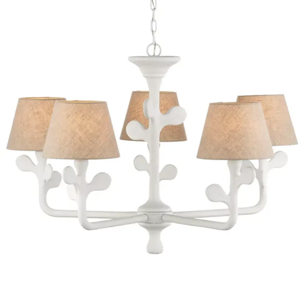 The Charny Chandelier from Currey & Company will elevate your space with whimsical charm. Crafted from composite and finished in White Gesso, this chandelier boasts a playful profile inspired by nature. Leaf-like shapes extend gracefully from the stems, creating a delightful luminary for any room. The textural shades, made of coarse linen, infuse warmth into the design. Illuminate your space with this captivating chandelier, a perfect blend of playful aesthetics and natural inspiration.