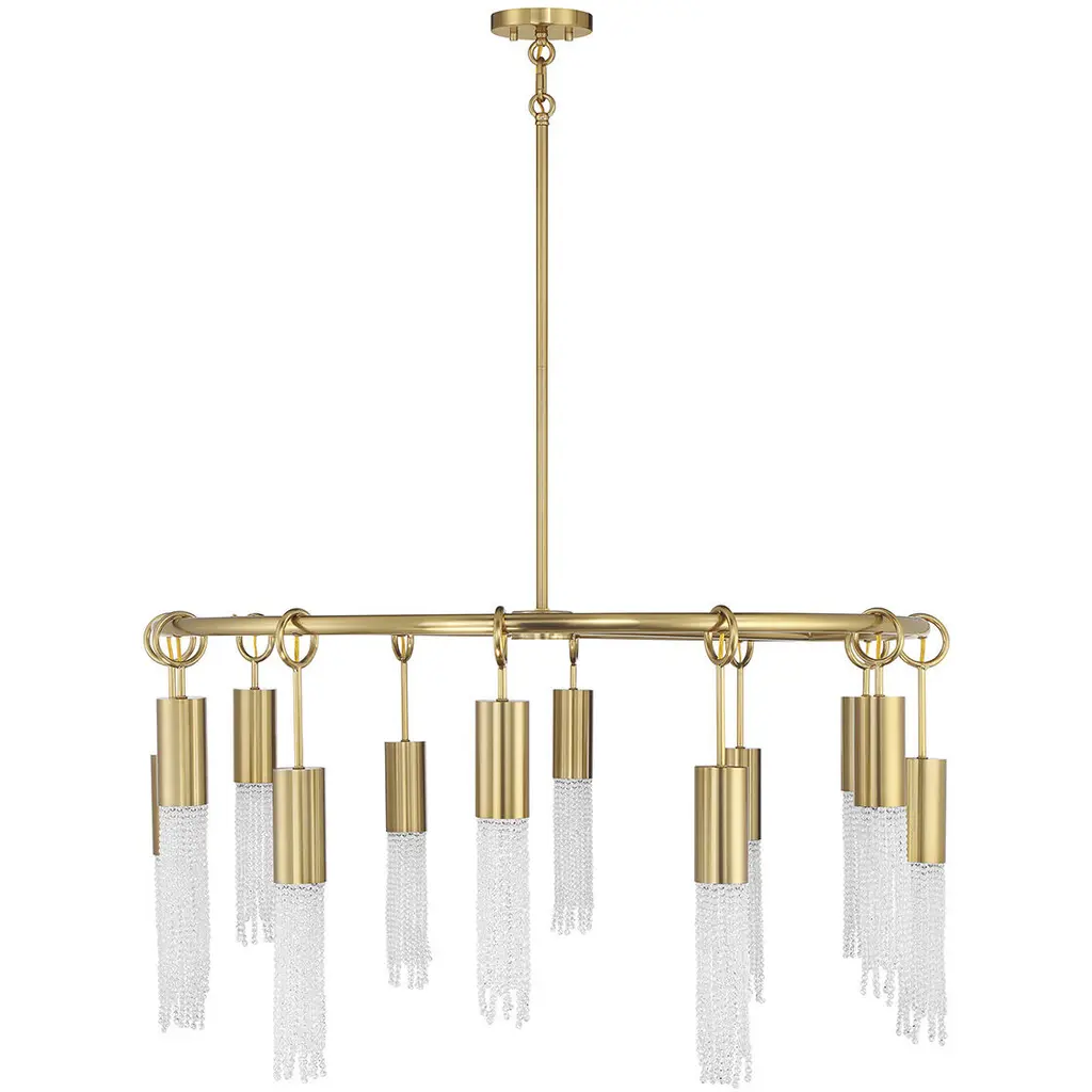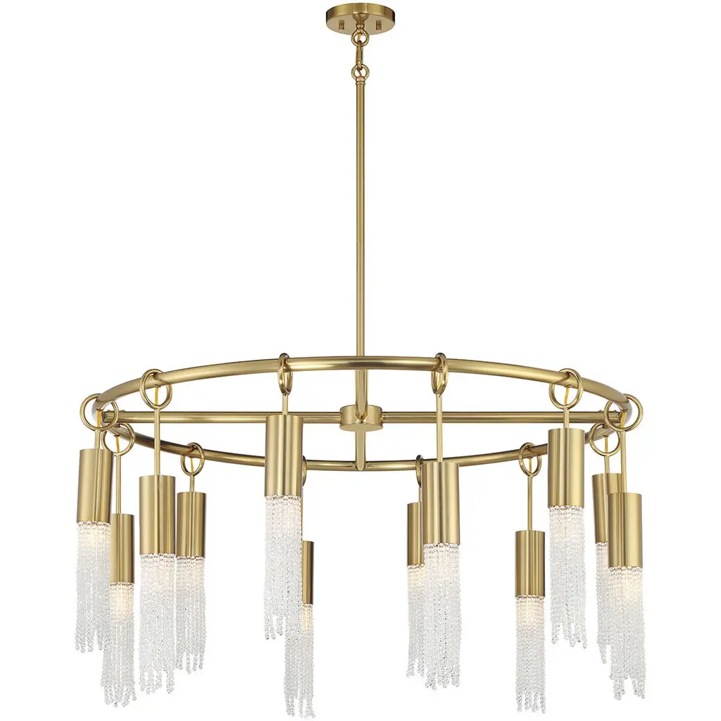 The Savoy House Chelsea 12-light chandelier brings understated elegance and sparkle to your home. Each light socket, finished in beautiful Warm Brass, is adorned with cascading strands of clear crystal beads that amplify the shimmer and shine. Chelsea is 40" in width and has an adjustable height ranging from 20.5" to 74.5". It comes with four 12" downrods and one 6" downrod. Uses twelve standard size bulbs of up to 60 watts per bulb. Bulbs not included.