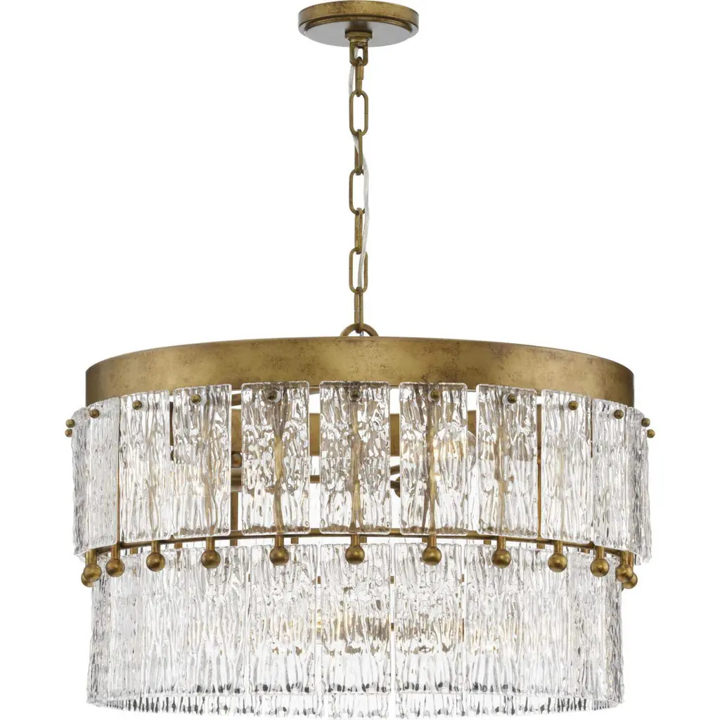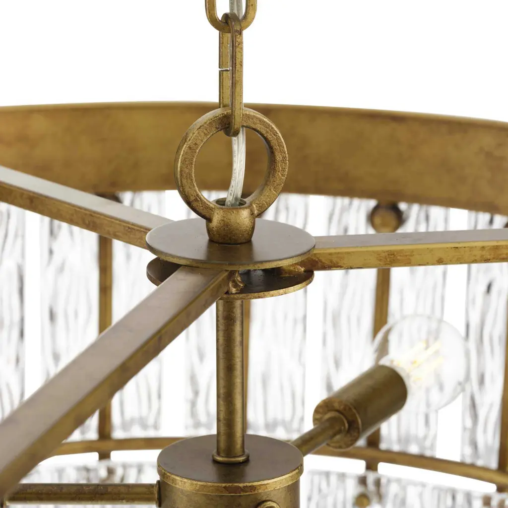Add glamour to your home with the elegant Chevall Collection. Layers of distinctive artisanal glass encircle a richly burnished, Gold Ombre frame, creating a chandelier that offers a luxurious lighting experience. Glimmering illumination creates a sparkling ambiance that fills the room. This fixture is part of the Progress Lighting Design Series, a lighting collection offering fashionable styles and affordable luxury lighting for the home.