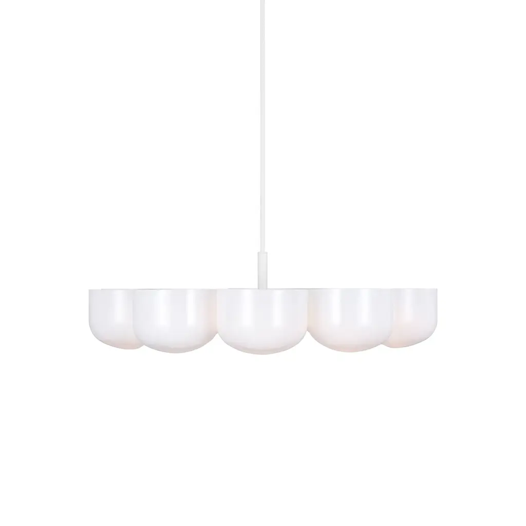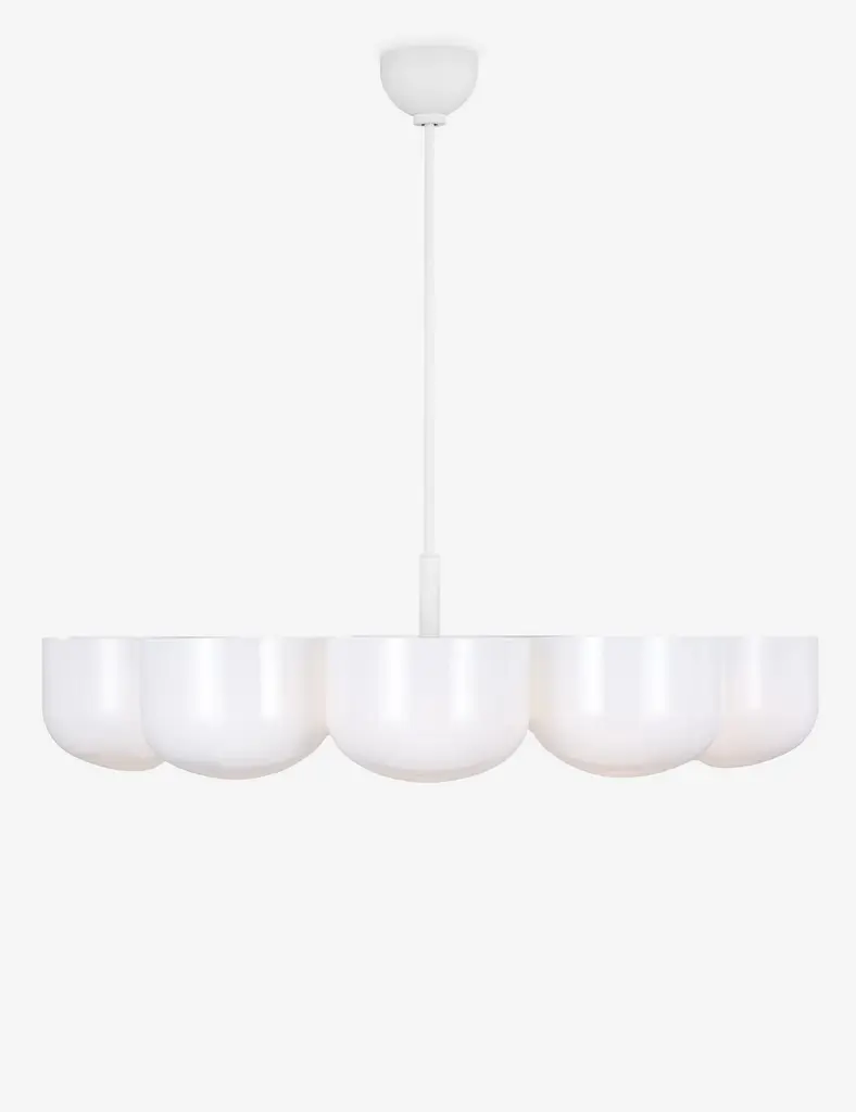Christiane Lemieux brings her keen eye to a sculptural lighting collection made for livable designcovering every element from lamps and sconces to pendants and chandeliers. With cupped glass milk shades and touches of metal, Cheverny is a study in the designer's layered minimalism. This large chandelier creates a grand statement overhead, gently tempered by its sleek silhouette.