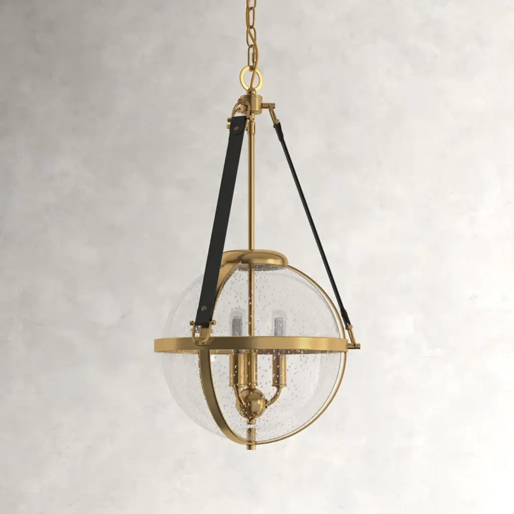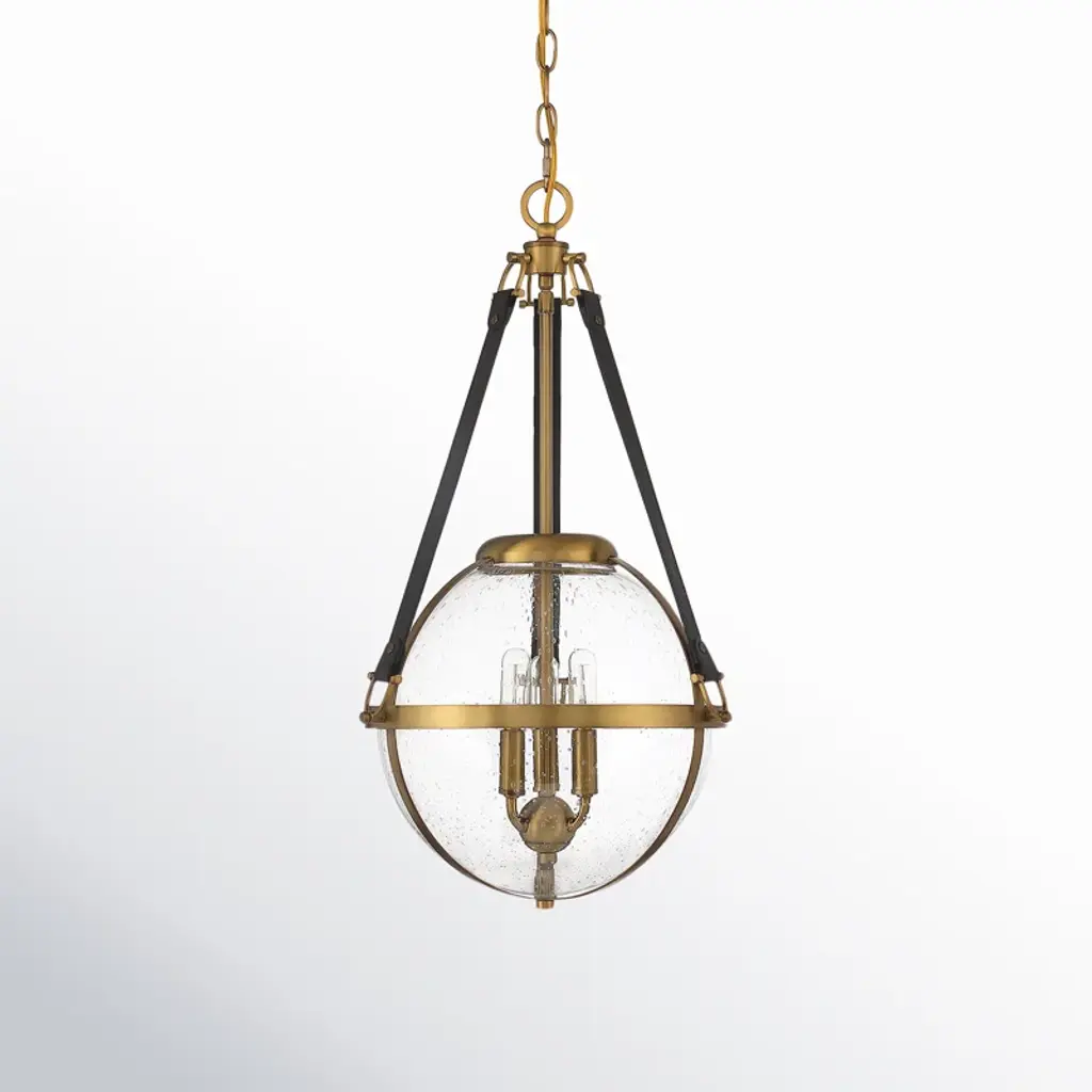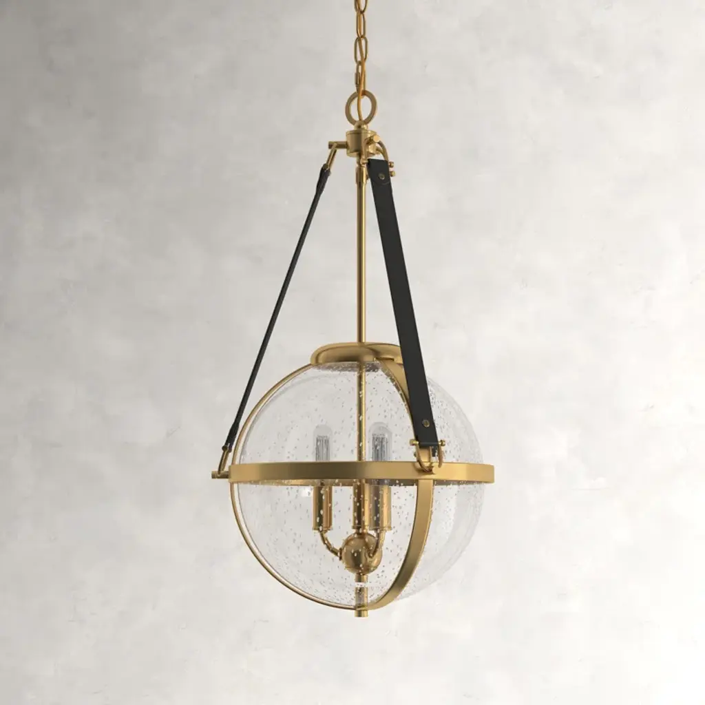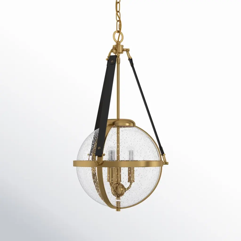 The 3-light pendant is a design that brings a touch of refined, equestrian-inspired style to your home. A seeded glass orb is held in place with straps of charcoal leather that pair perfectly with the antique finish. is 25" in height and 14" in width. It uses three candelabra-size bulbs of up to 60 watts per bulb. Comes with 120" of chain and 144" of cord.