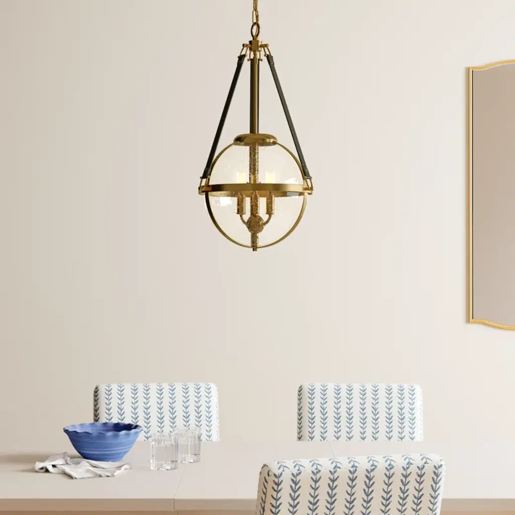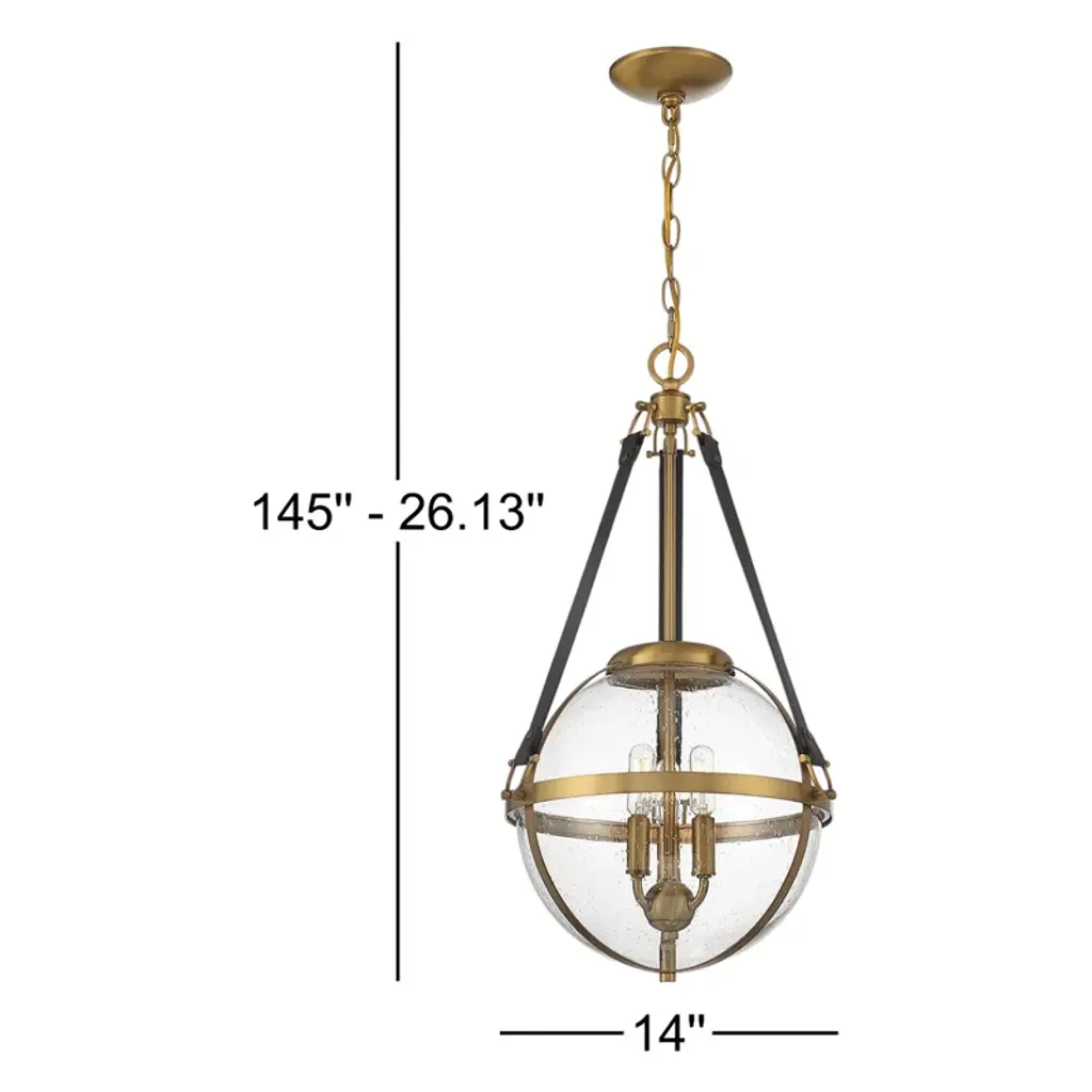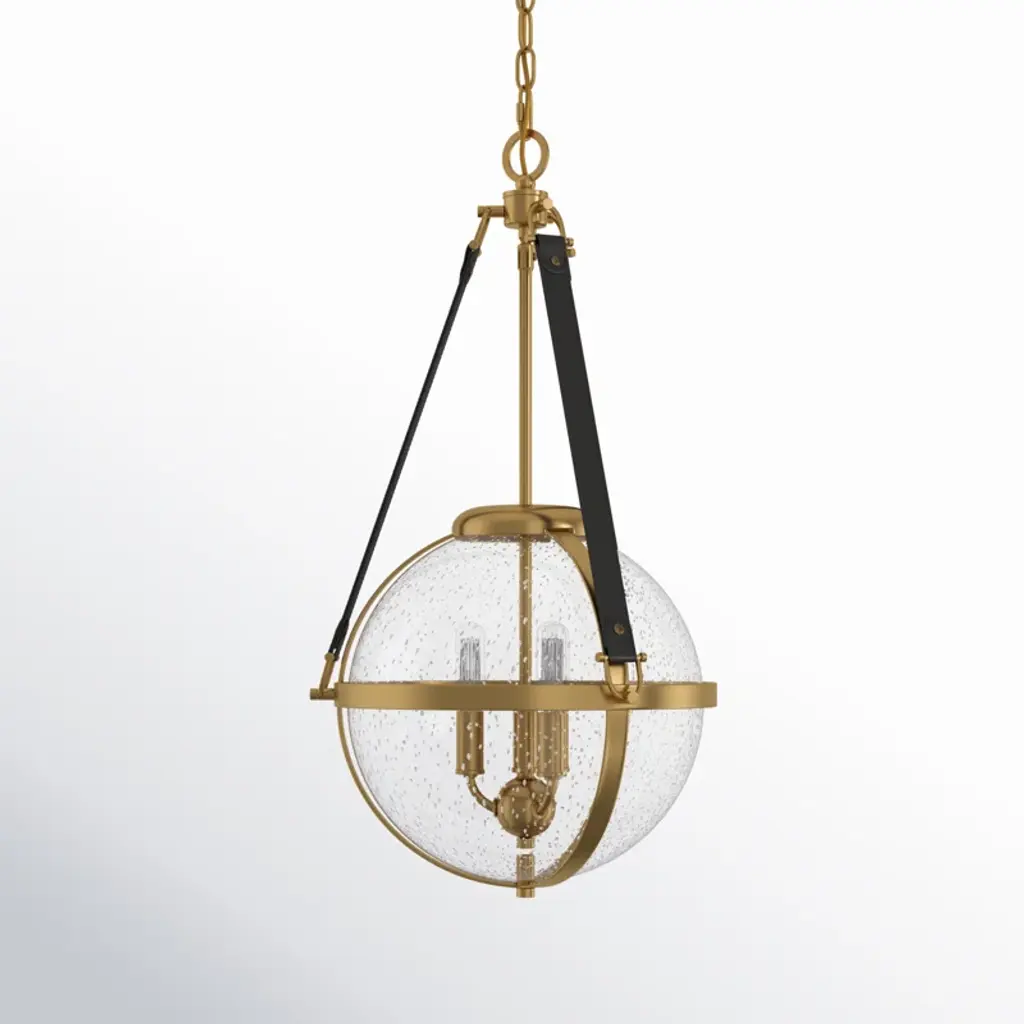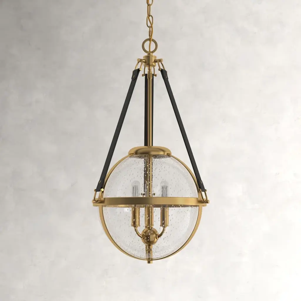 The 3-light pendant is a design that brings a touch of refined, equestrian-inspired style to your home. A seeded glass orb is held in place with straps of charcoal leather that pair perfectly with the antique finish. is 25" in height and 14" in width. It uses three candelabra-size bulbs of up to 60 watts per bulb. Comes with 120" of chain and 144" of cord.