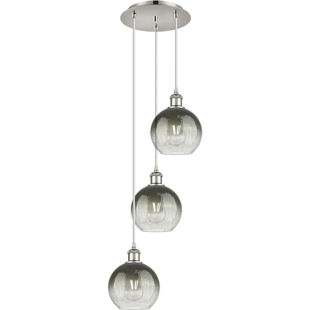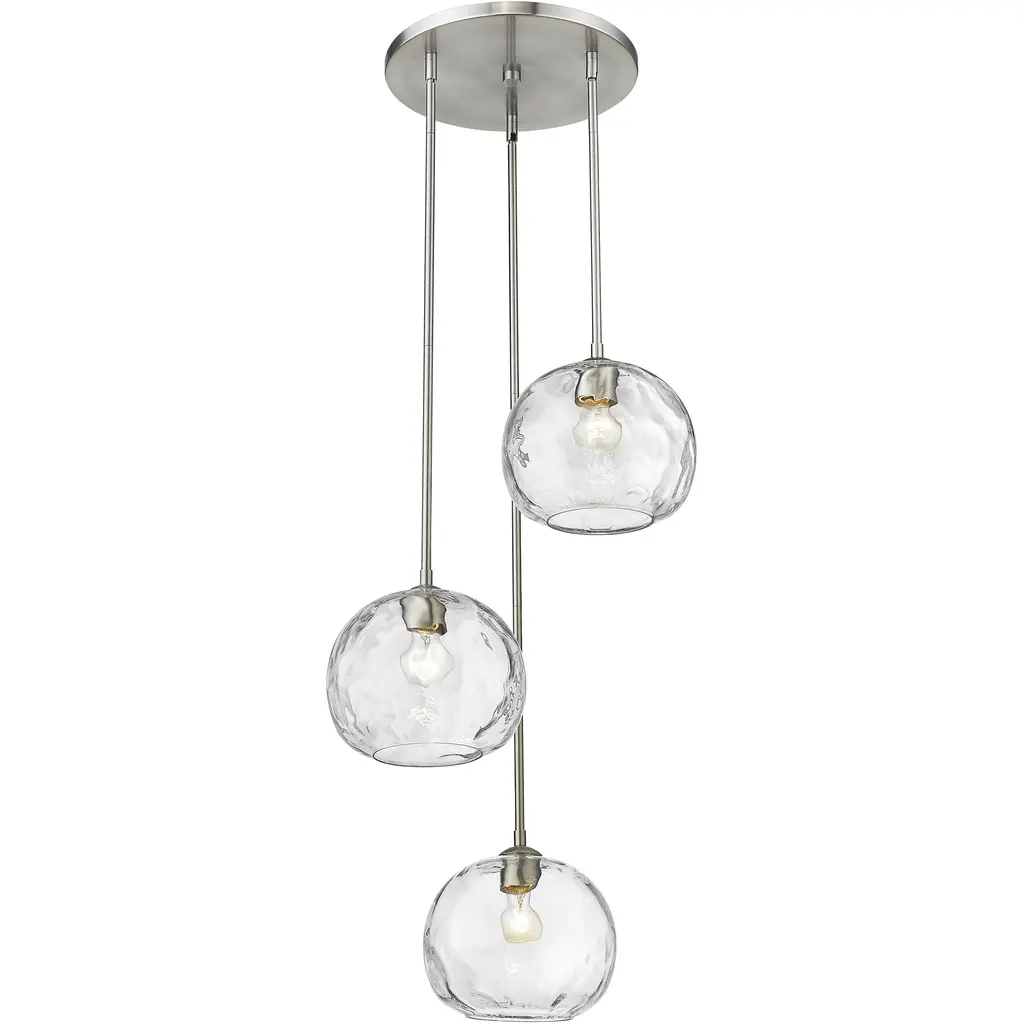 Define your modern space with the eye-catching, streamlined presence of this contemporary three-light pendant. Grooved, rounded shades are made from clear, water-textured glass, suspended from a sleek steel frame with a brushed nickel finish. Your contemporary dining room or family space gets an instant boost with this sophisticated fixture.