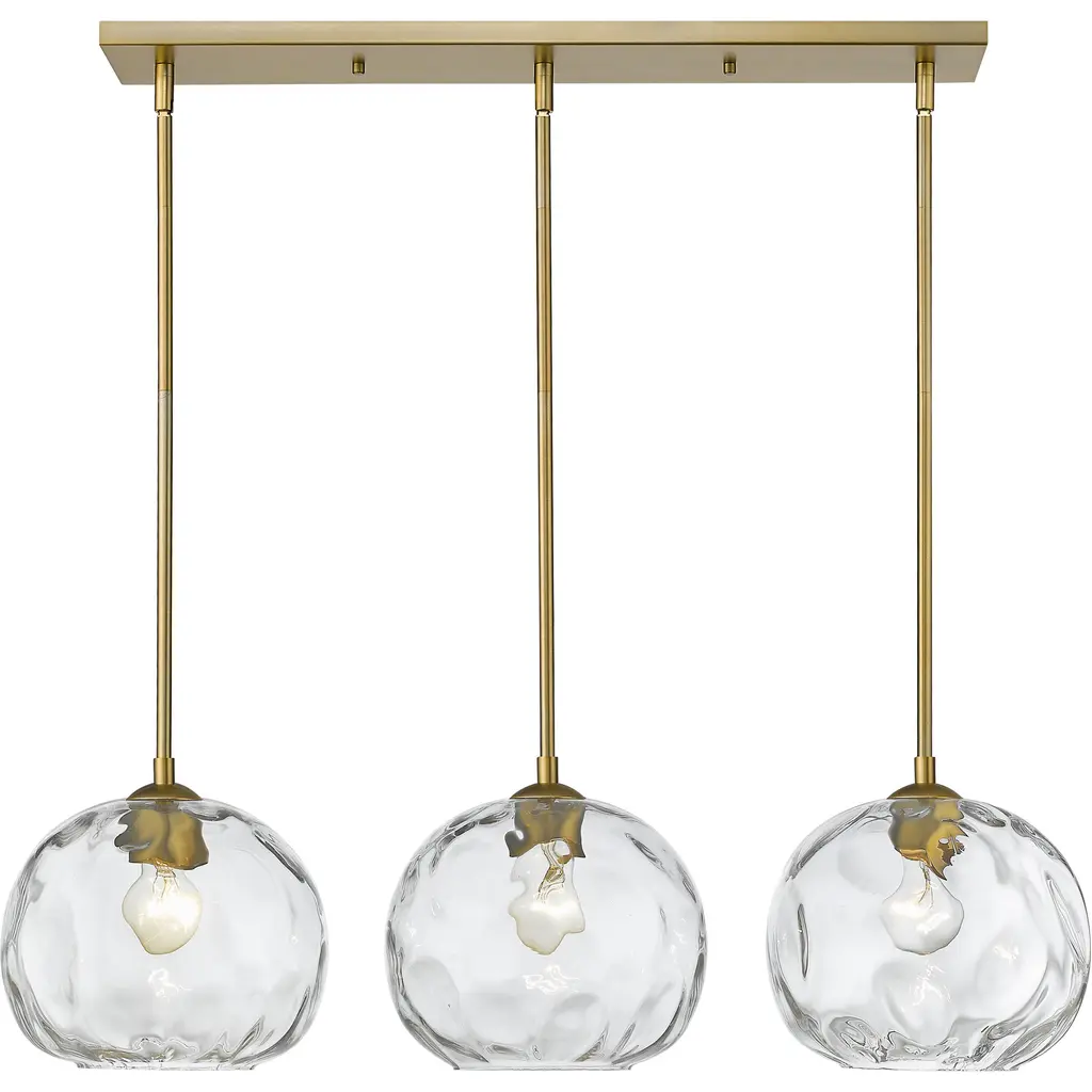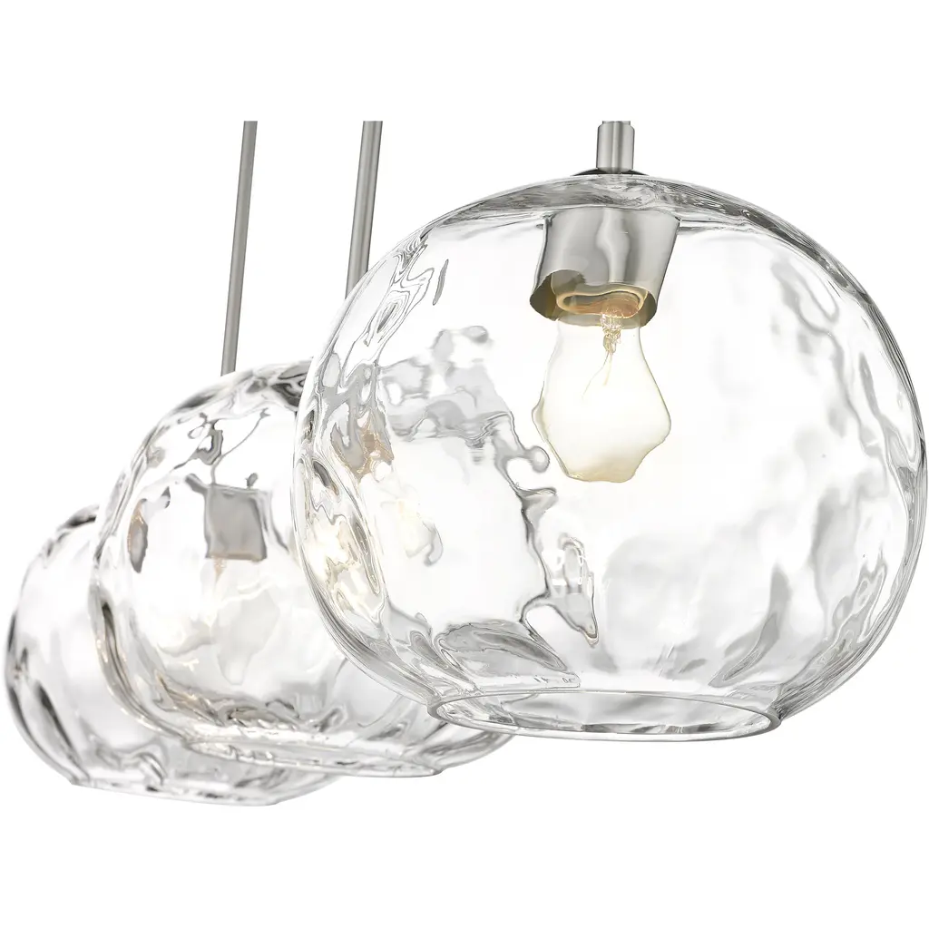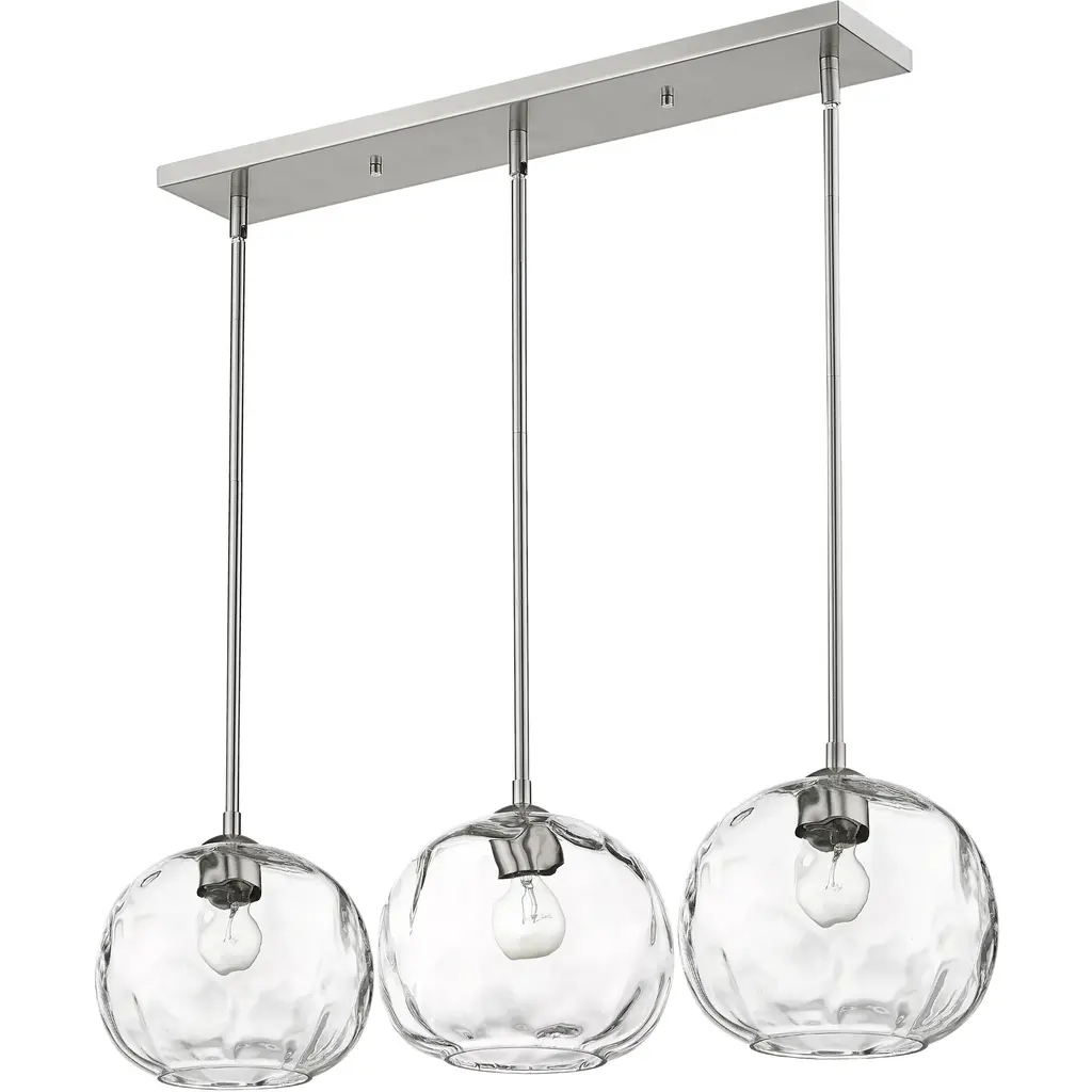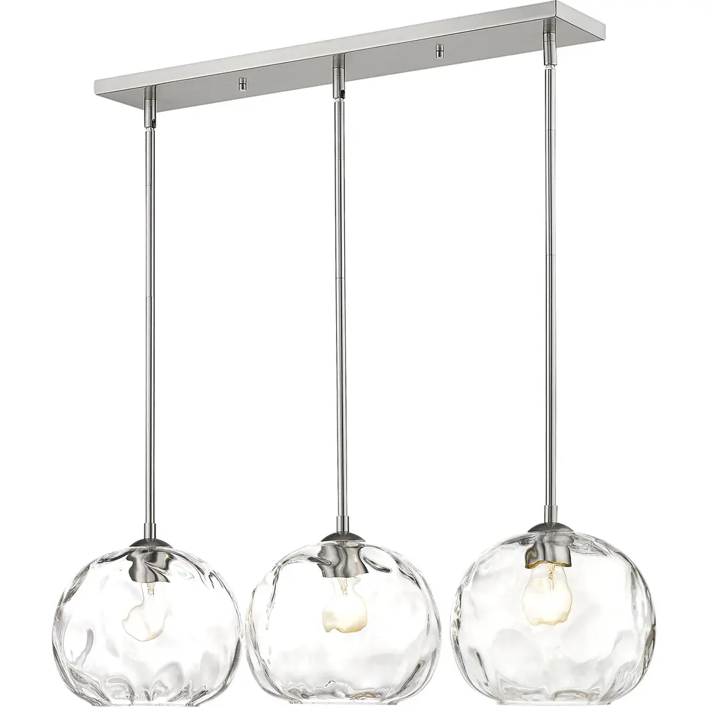 Define your modern space with the eye-catching, streamlined presence of this billiard style three-light pendant. Rounded shades are made from clear, water-textured glass, suspended from a sleek steel frame with a brushed nickel finish. Your contemporary dining room or family space gets an instant boost with this sophisticated fixture.
