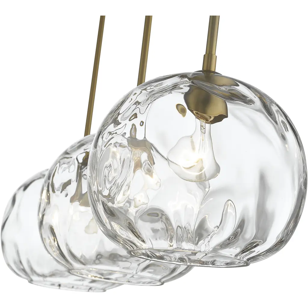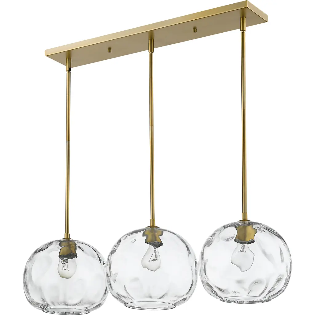 Define your modern space with the eye-catching, streamlined presence of this billiard style three-light pendant. Rounded shades are made from clear, water-textured glass, suspended from a sleek steel frame with an olde brass nickel finish. Your contemporary dining room or family space gets an instant boost with this sophisticated fixture.