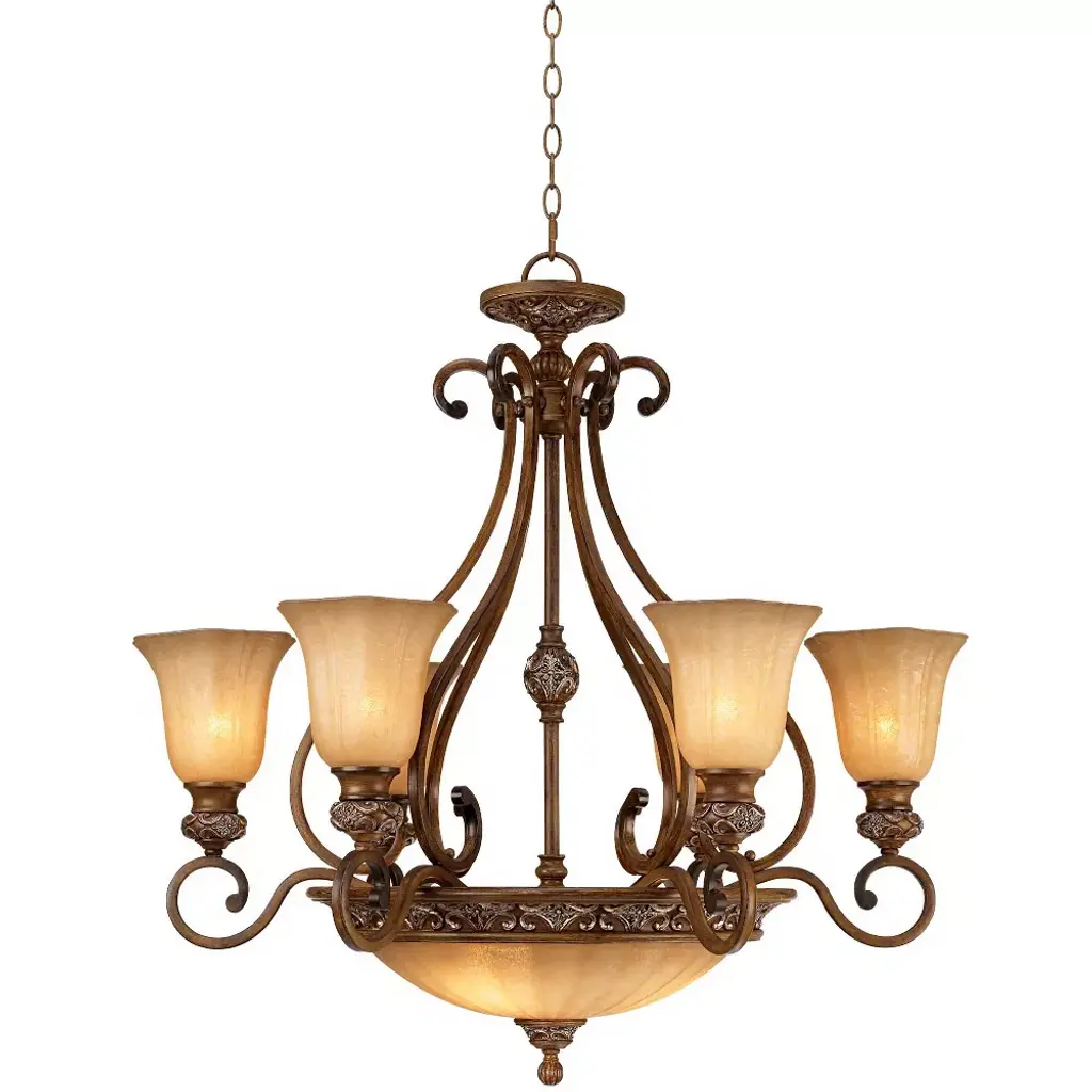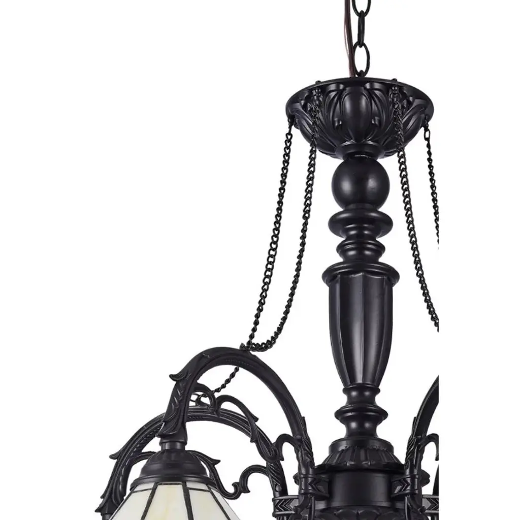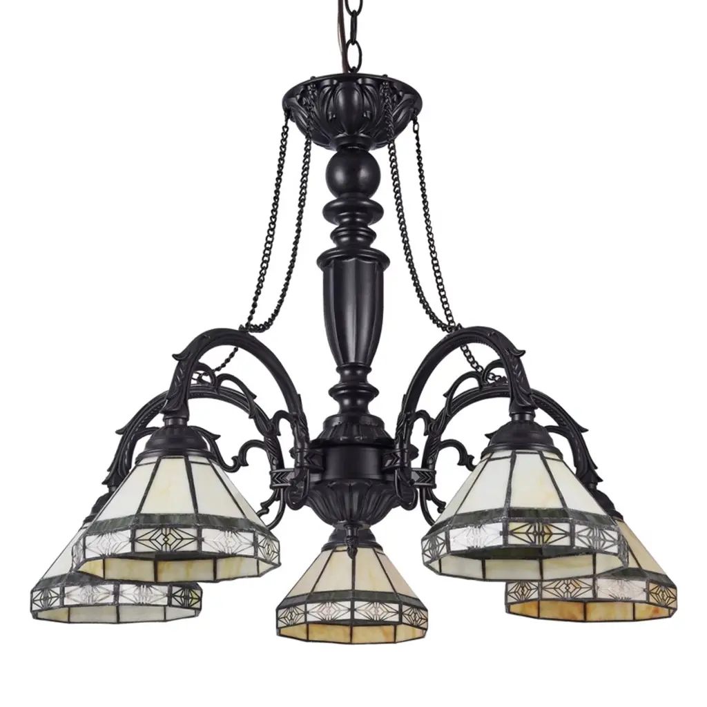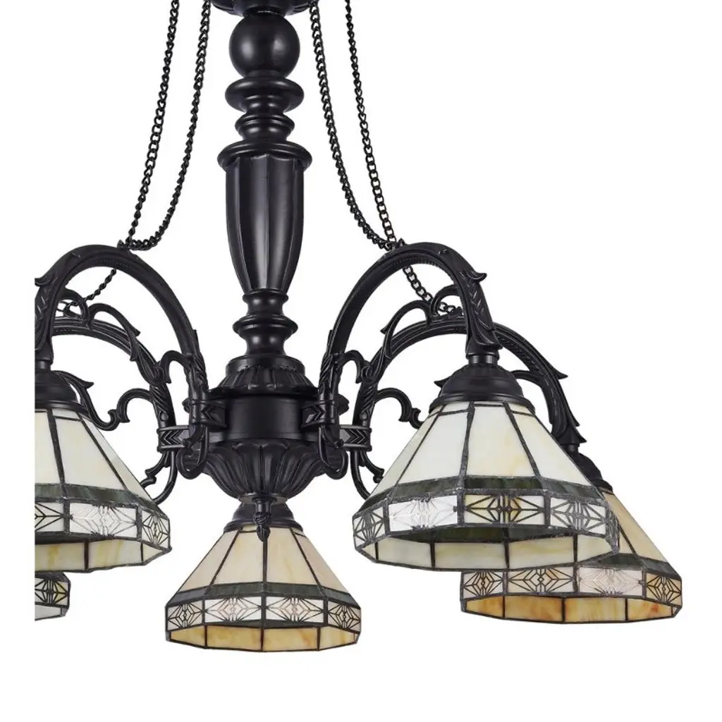 Elevate your interior with the clean geometry and warm hues of the Belle Tiffany-style chandelier. A stunning fusion of Mission design and stained glass artistry, this 5-light fixture is handcrafted from over 200 pieces of rich amber, brown, and black art glass, all cut and wrapped using traditional copper foil techniques. The blackish bronze finish adds contrast and depth, while five gracefully arranged shades offer generous downlighting, perfect for dining rooms or grand foyers. Key Features: Mission-style chandelier with handcrafted Tiffany-glass shadesComposed of 200 hand-cut stained glass pieces for striking detailAccommodates five 60W max E26 bulbs (not included)Suspended by an 84" adjustable chain and matching blackish bronze hardwareDimensions: 24"H x 27"W | Shade Height: 4.3" | Shade Width: 7.1" |Net Weight: 15 lbs Designed to cast a rich, ambient glow, Belle brings a bold, artistic presence to large indoor spaces.