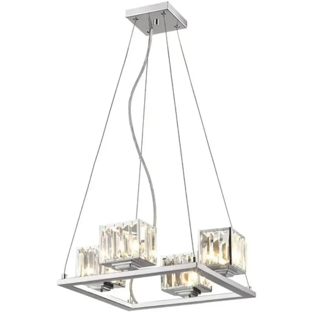 The Chloe Lighting CH20038CM16-UP4 Trilluminate Contemporary 4-Light Chrome Finish Crystal Shade Mini Chandelier is an elegant lighting fixture designed to enhance modern and contemporary interiors. Key Features: Style: Contemporary with a sleek chrome finish and crystal accents.Dimensions: Approximately 4.68 inches in height and 16.38 inches in width and depth.Material: Steel frame with crystal shades.Bulb Compatibility: Requires four 40-watt G9 halogen bulbs (included).Installation: Hardwired; no assembly required.Certifications: UL Listed for safety