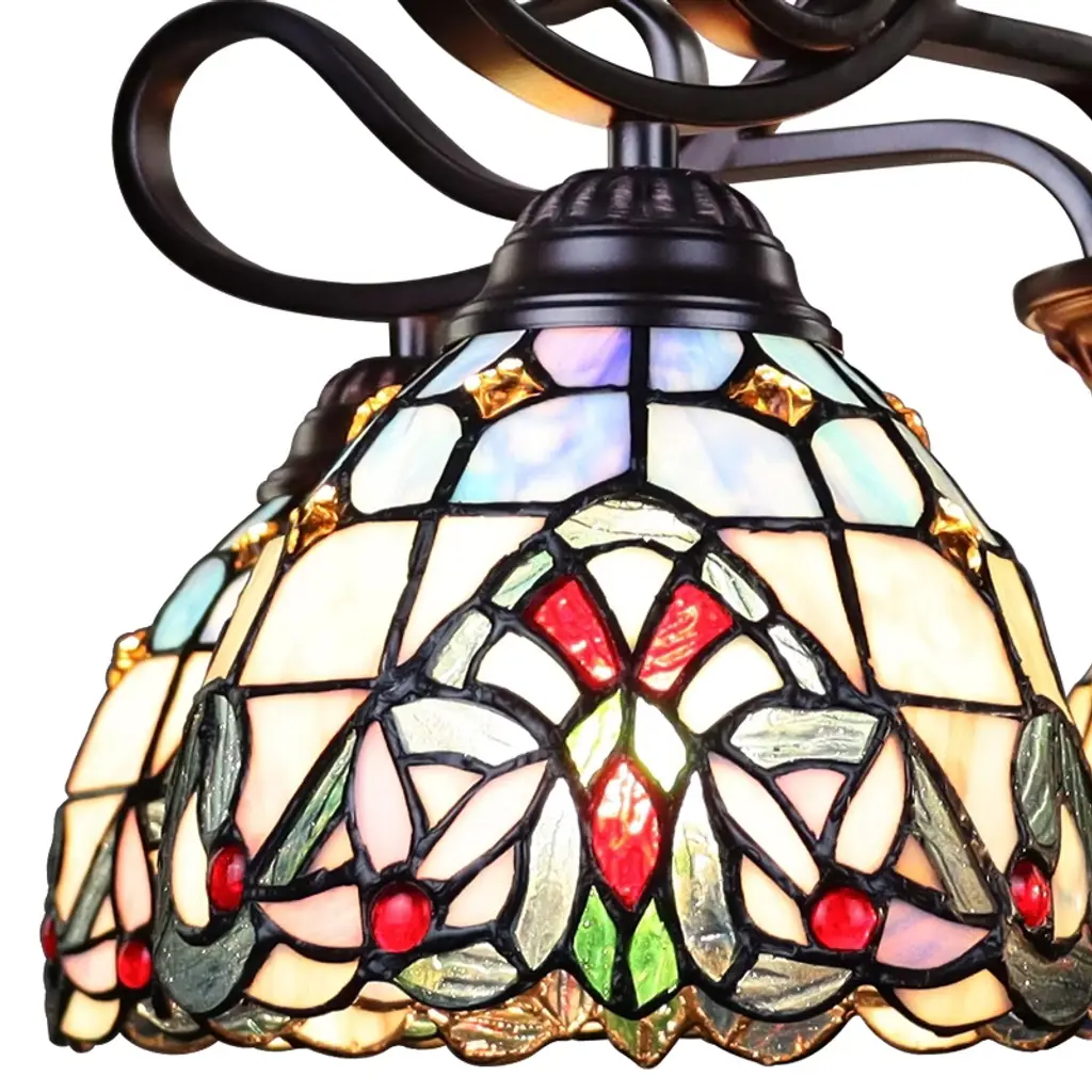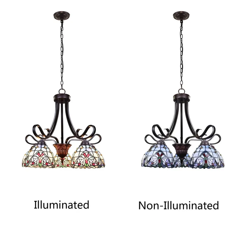 Grenville is a beautiful large chandelier, featuring 5 stained glass Victorian-style shades and a dark bronze canopy. This chandelier would be perfect to hang over a dining room table or over an entranceway. Each shade is handcrafted, using the same methods developed by Louis Comfort Tiffany in the early 1900s. This process entails using a total of 142 hand-cut stained art glass pieces and 16 glass beads, each wrapped in fine copper foil and soldered together at extremely high temperatures to form each unique piece. The exact size to the nearest inch may vary, and the exact color of each glass piece may vary due to each piece being handcrafted. The first image is with the light shining through, the second image is with no light. Dry listed and recommended for an indoor setting.
