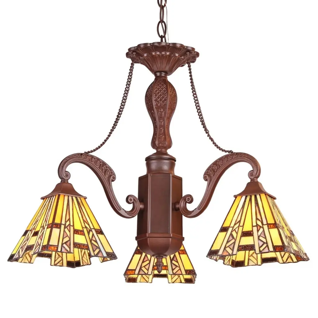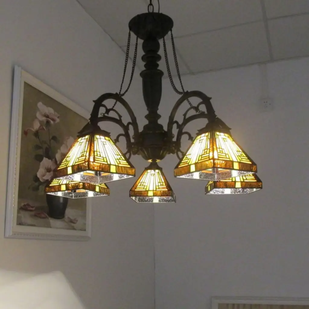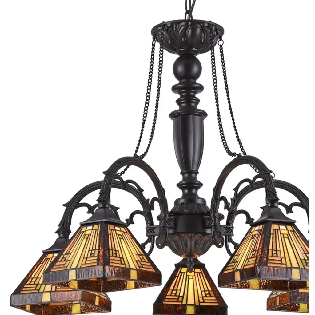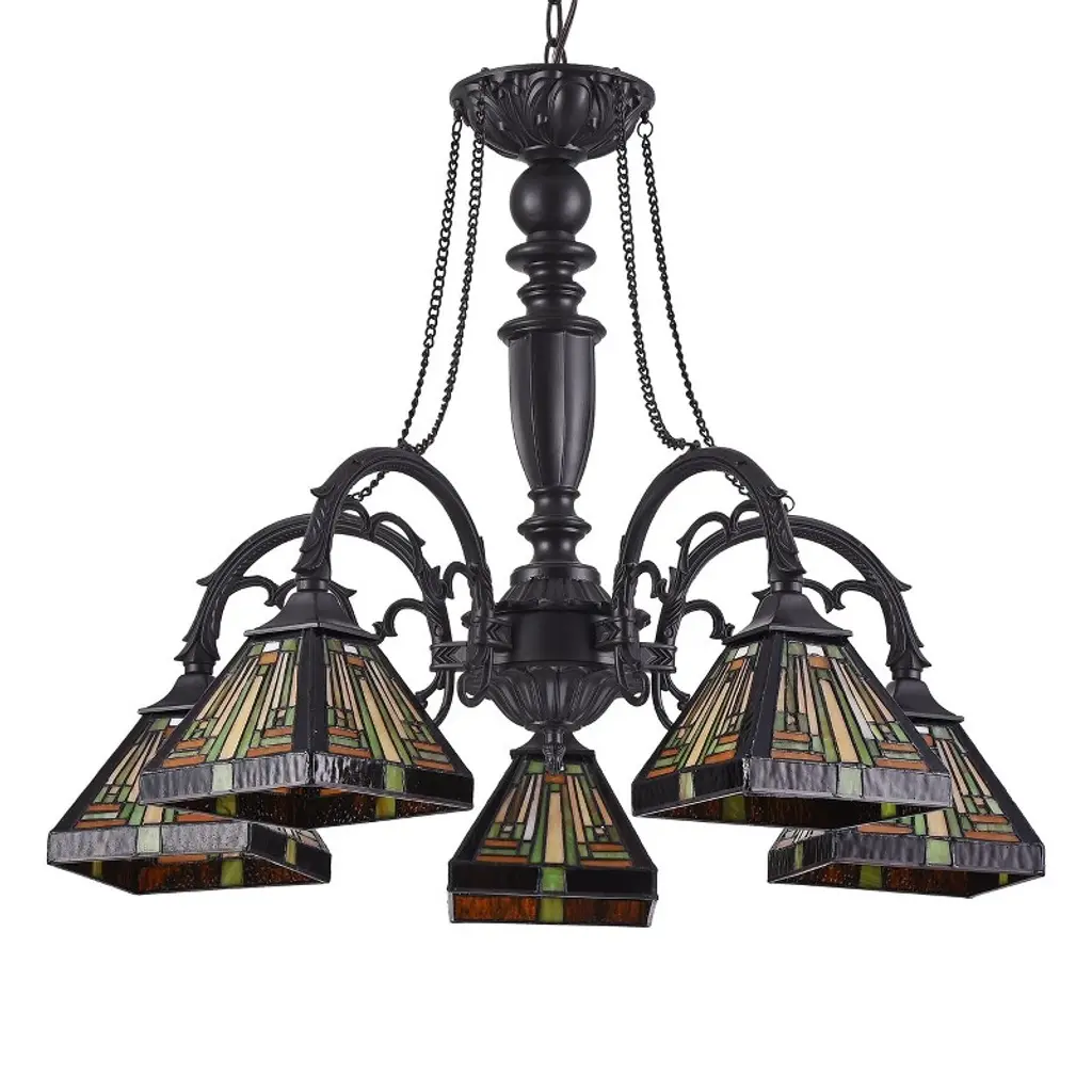 Elevate your home’s ambiance with the Innes Tiffany-style 5-light mission chandelier — a grand fixture rich in vintage charm and handcrafted artistry. Designed to evoke a medieval aesthetic, this 27-inch wide chandelier features 840 hand-cut stained glass pieces in shades of black, yellow, and green, assembled using copper foil techniques pioneered by Louis Comfort Tiffany in the early 1900s. The result is a luminous centerpiece that diffuses rich, warm light throughout your space, perfect for dining rooms, foyers, or large living areas. Key Features Handcrafted from 840 stained glass pieces for authentic Tiffany-style elegance Blackish bronze finish and square-shaped shades deliver classic mission design Uses (5) 60W max E26 Type A bulbs; downlight direction; wall switch operated Adjustable hanging length up to 84"; hardwired for indoor use Overall dimensions: 27"L x 27"W x 24"H; shade: 6.1"W x 4.3"H