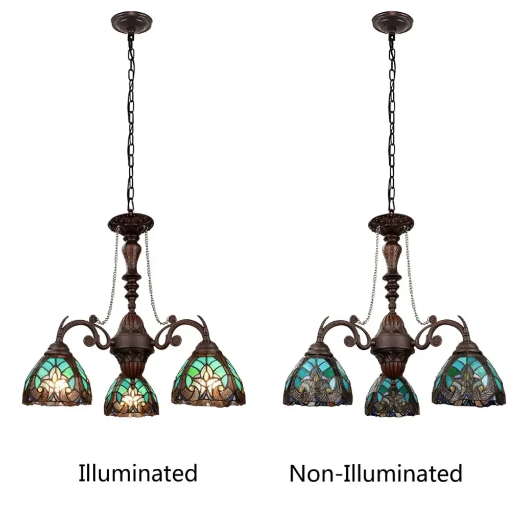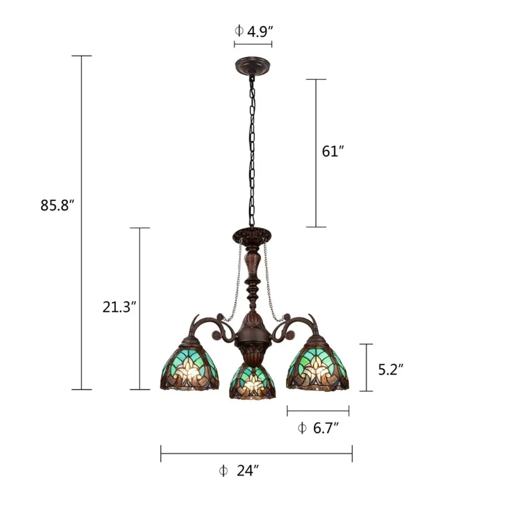 Liaison is a beautiful Victorian-style 3 light chandelier, featuring stained glass that will cast a warm glow on your home. Each of the 3 shades is made up of 152 pieces of copper-foiled, stained art glass, and 12 glass beads, expertly designed and crafted by hand. CHLOE's Tiffany-style stained glass products are formed using the very same technique developed by Louis Comfort Tiffany in the early 1900s, using hand-cut stained art glass, each wrapped in fine copper foil and soldered together at extremely high temperatures to form each unique piece. The exact size to the nearest inch may vary, and the exact color of each glass piece may vary due to each piece being handcrafted. The first image is with the light shining through, the second image is with no light. Dry-listed and recommended for an indoor setting.
