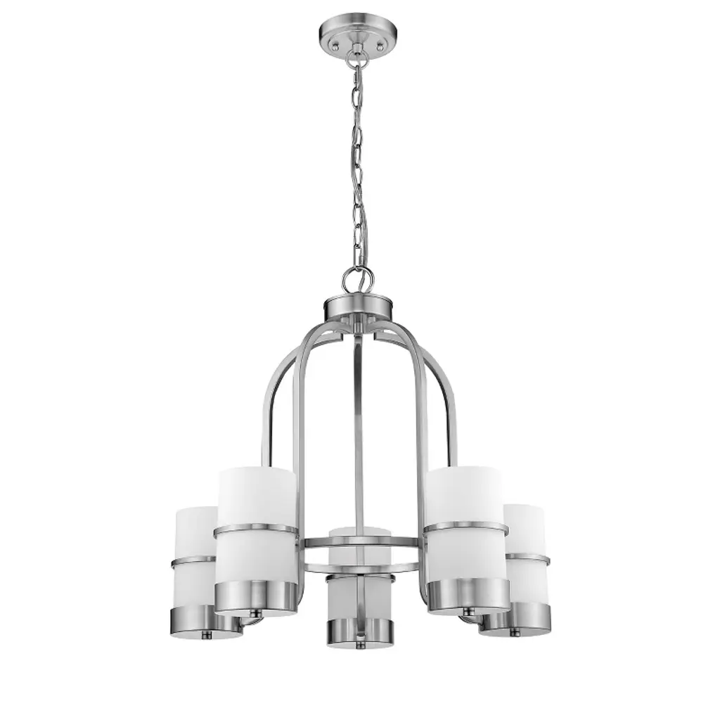 Elevate your space with the sleek, modern elegance of the Penelope Contemporary 5-Light Mini Chandelier. Featuring a refined brushed nickel finish and five etched white cylinder glass shades, this fixture blends clean lines with warm illumination—perfect for transitional or industrial interiors. Whether installed above a dining table, in an entryway, or as a stylish accent in a living space, it adds a striking yet balanced presence. Key Features: Brushed nickel finish and clean steel frame complement both transitional and modern interiors. Etched white cylinder glass shades create a soft, inviting uplight effect. Accommodates (5) 100W max E26 base Type A bulbs for optimal brightness (bulbs not included). Hardwired installation with 120" adjustable chain and wire for flexible ceiling mounting. Overall dimensions: 22" W x 21" H; shade size 5.78" H x 5.5" W; projection 22".