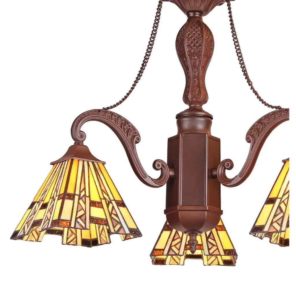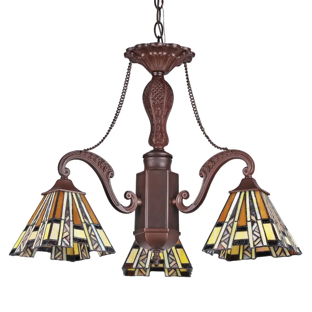 The Progressive Mini Chandelier is a refined blend of mission-style artistry and retro sophistication. With 456 hand-cut pieces of stained Tiffany glass in geometric patterns, this 3-light fixture adds striking dimension and color to dining rooms, offices, or transitional interiors. The square shades create focused downlighting, while a dark bronze finish completes its handcrafted look. Key Features: Requires (3) 60W max E26 Type A bulbs (not included) Designed with 456 hand-cut stained glass pieces in classic mission style Finished in rich dark bronze for vintage appeal Hardwired installation with 84" chain and cord included Dimensions: 22"W x 22"L x 17.32"H | Net Weight: 8.31 lbs