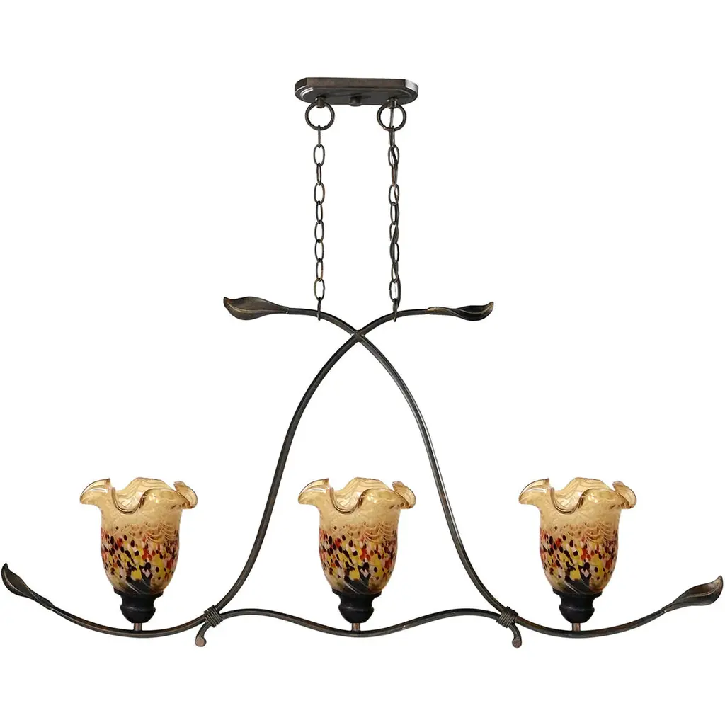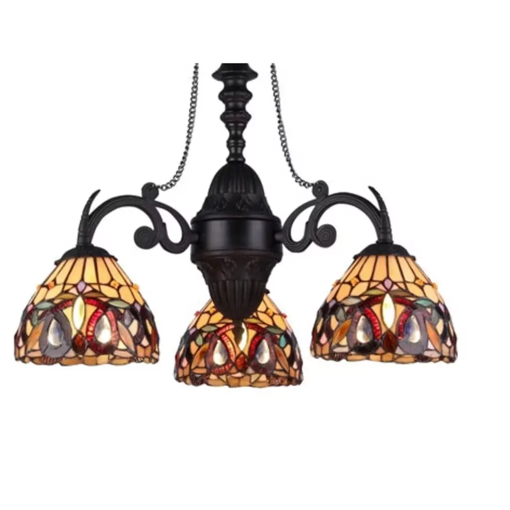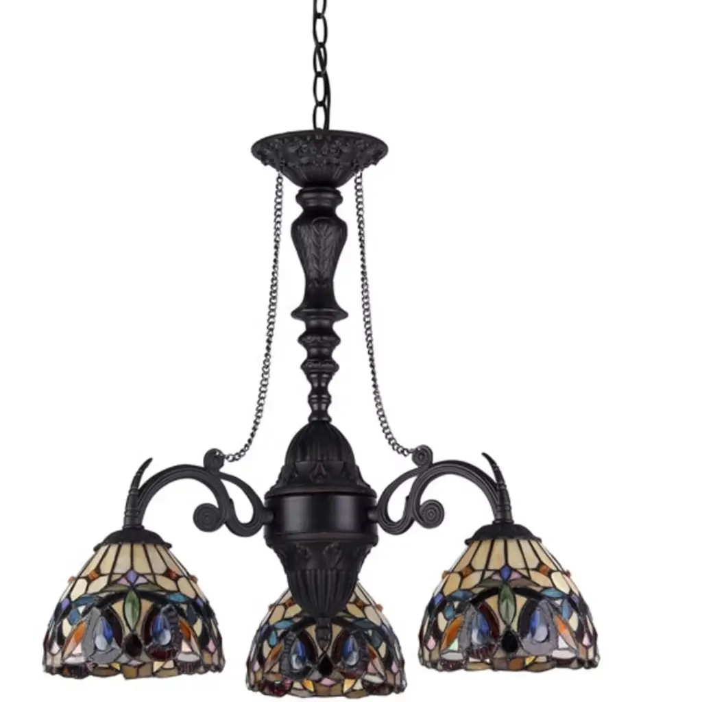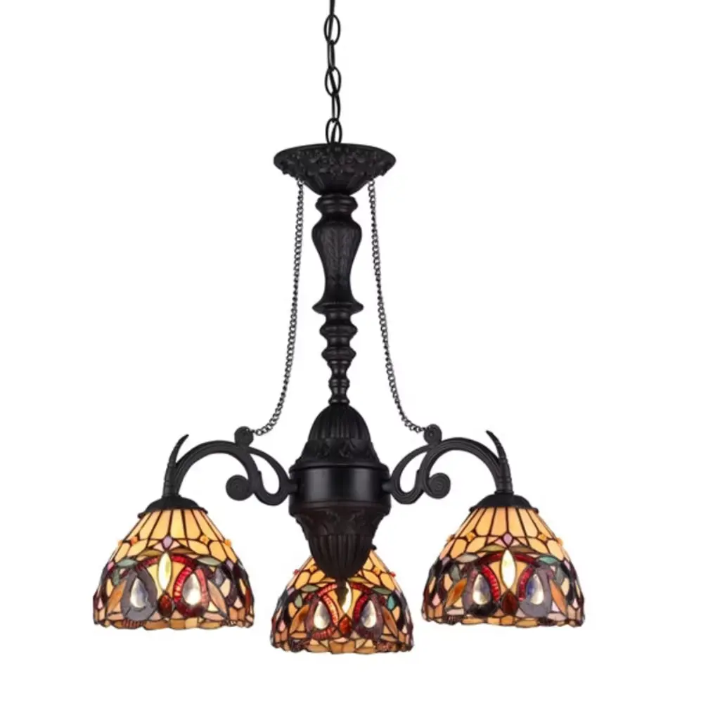 The Serenity Mini Chandelier delivers classic Victorian charm in a refined scale ideal for dining nooks, foyers, or small rooms. Featuring three down-facing lights, this fixture is exquisitely handcrafted with 486 pieces of real stained Tiffany-style glass. Sparkling accents and a graceful silhouette add elegance to your décor, while a rich dark antique bronze finish enhances the vintage look. Hang it solo or pair it with other Serenity fixtures to unify your design. Key Features: Victorian-inspired 3-light mini chandelier with antique bronze finish Handcrafted with 486 stained Tiffany-glass cuts and radiant crystal accents Chain-hung design with 84" adjustable cord for ideal positioning Dimensions: 25.8" H x 20.5" W x 20.5" D | Shade height: 4.9" | Weight: 13.2 lbs Requires (3) 100W max E26 Type A bulbs (not included); UL and cUL Listed for indoor use