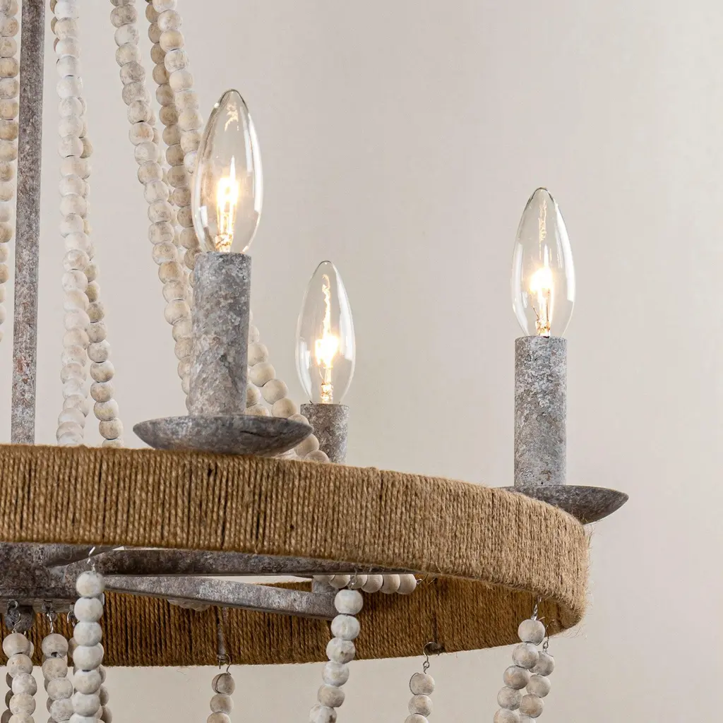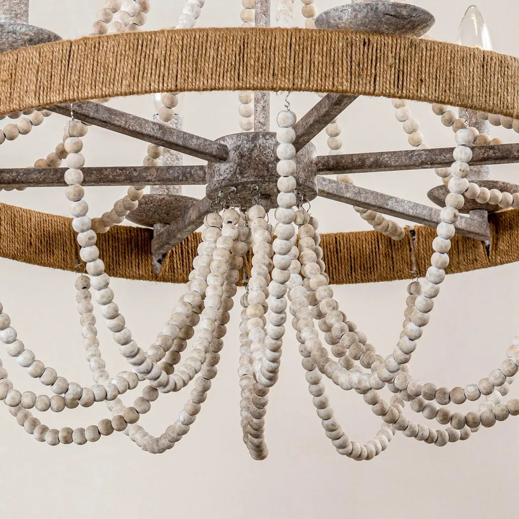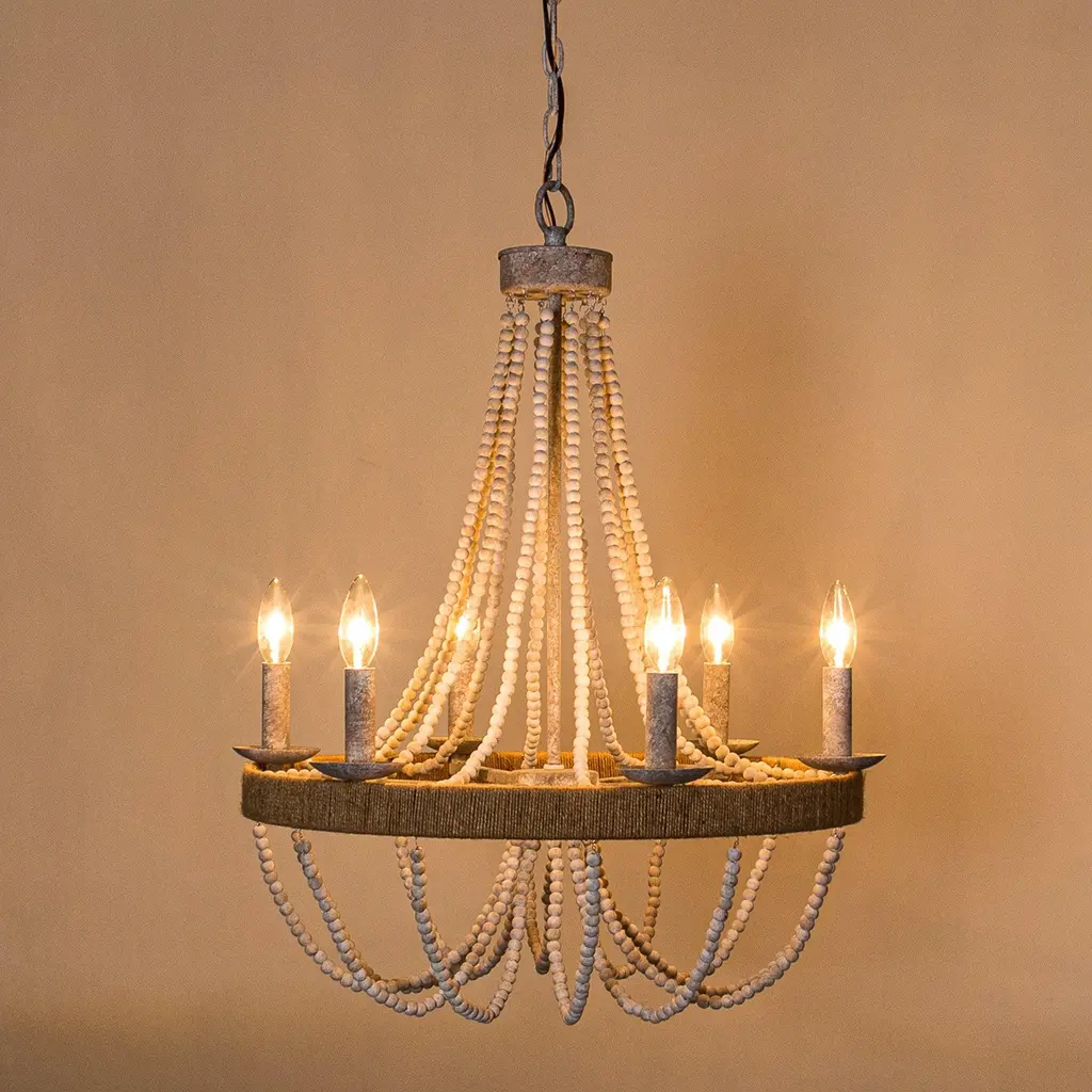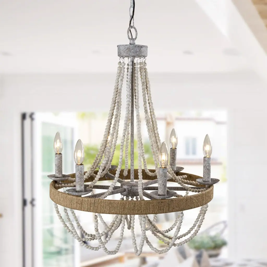 This farmhouse chandelier is neither large nor small. Its standard size makes it suitable for most places. The most fascinating thing is it is made with neutral-toned wood beads and a rustic iron on the metal accents. Designers often say lighting is the jewelry of the house decor and this piece is absolutely a distinctive statement necklace.