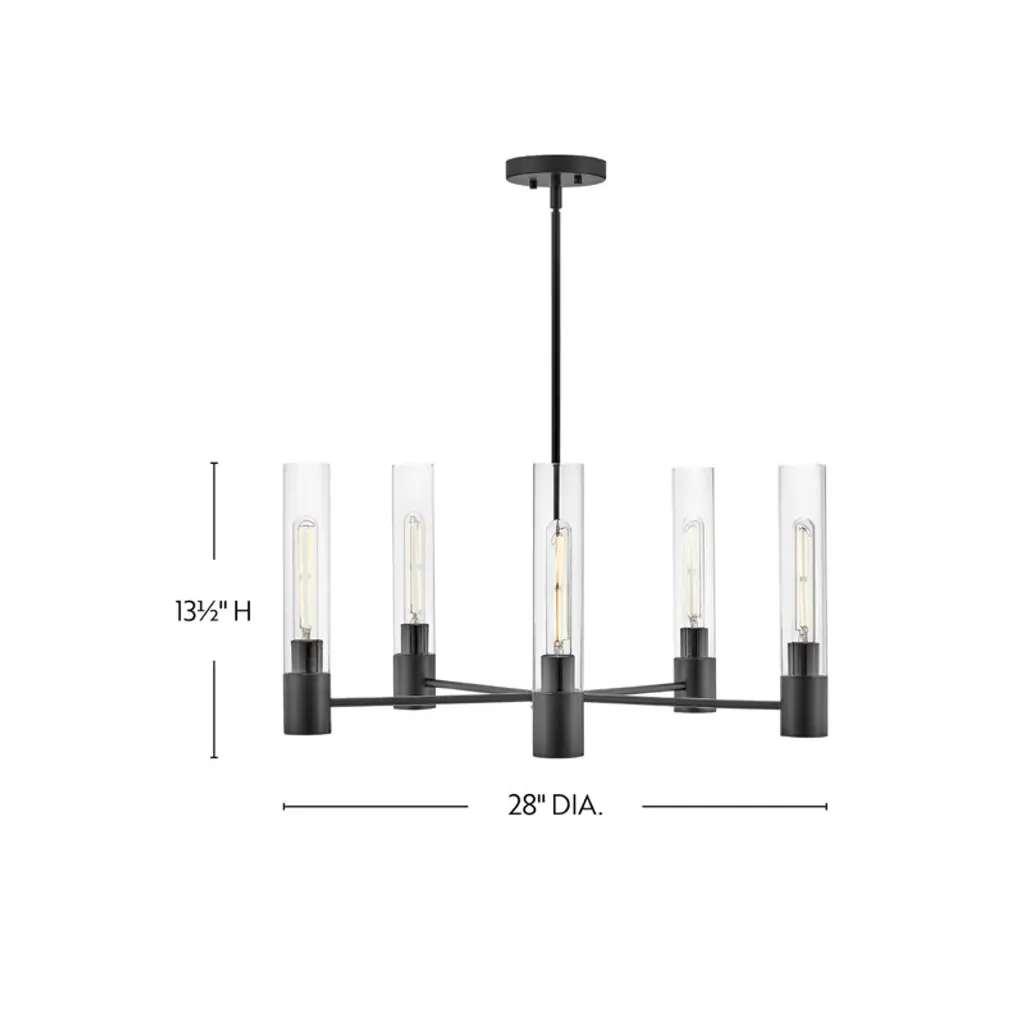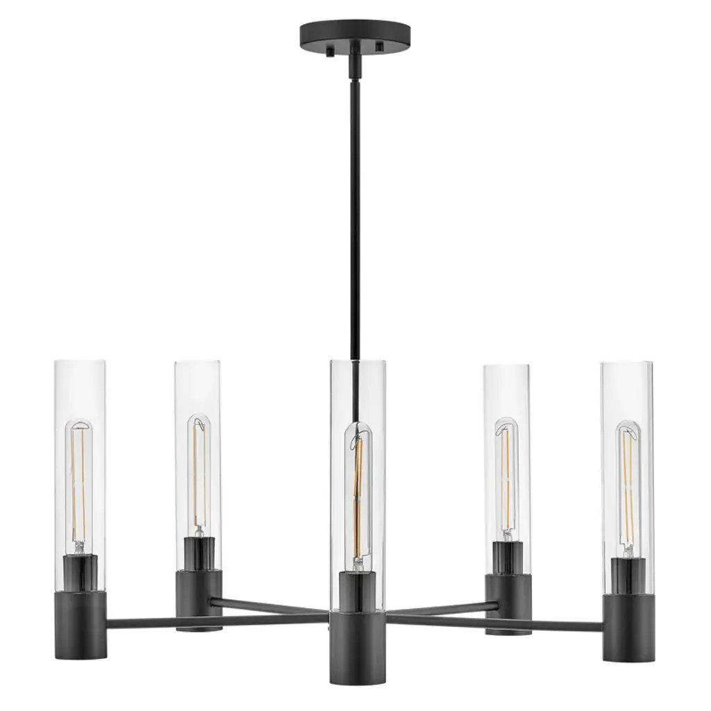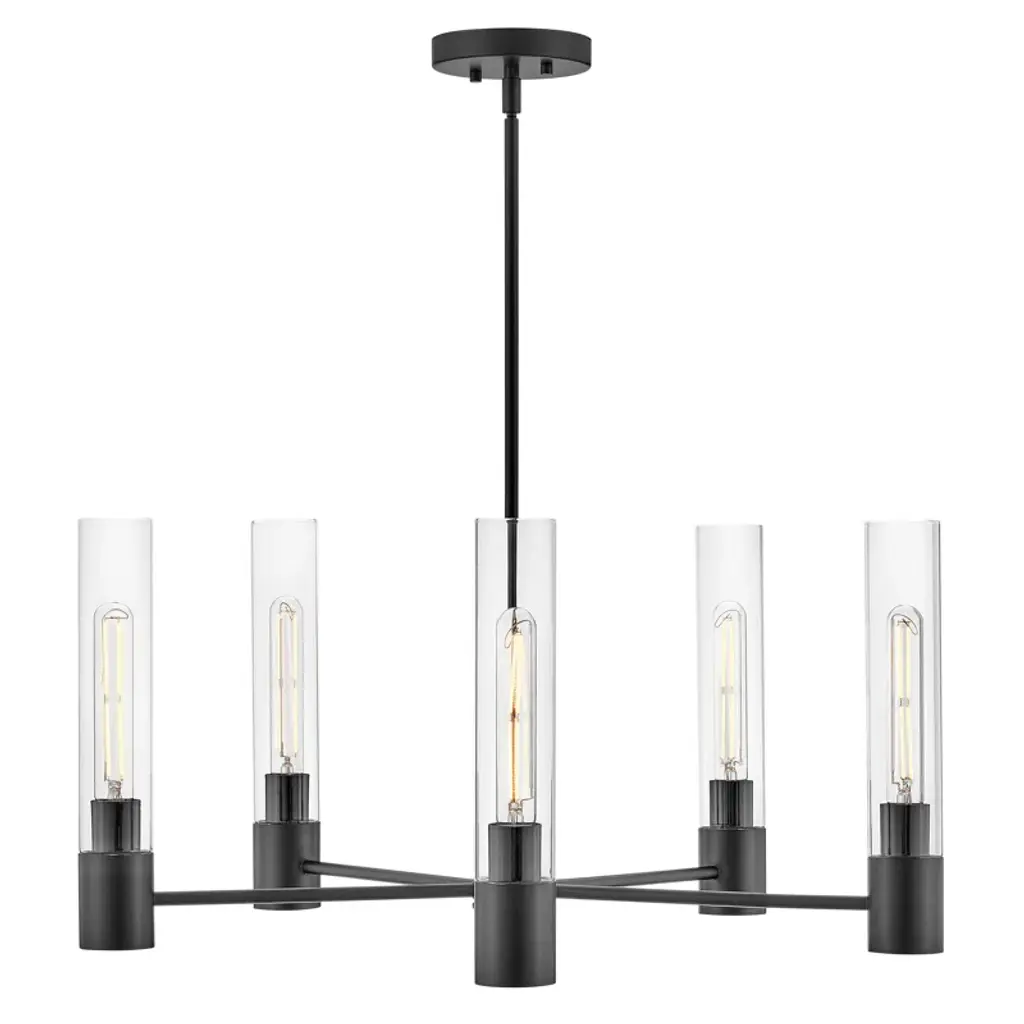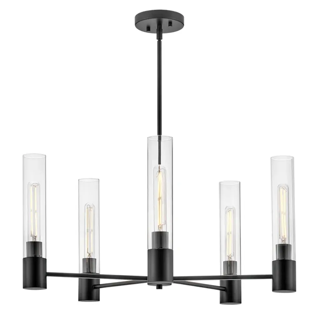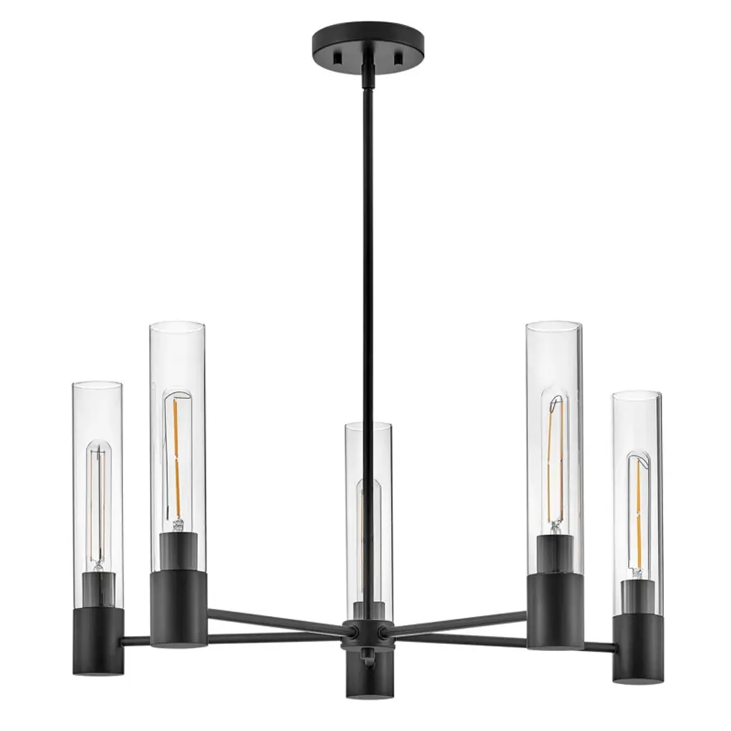 A modern candelabra, this streamlined medium single tier chandelier features a slender framework in a classic Black or Lacquered Brass finish. This contemporary design features (5) Clear Glass cylindrical shades, surrounding a T-style 10w Medium LED bulb (not included) for an elongated look. Flexible, this light fixture can be hung from even or sloped ceilings (up to 90°) with (1) 6" and (2) 12" down rods to extend up to 46" accommodating most room heights.
