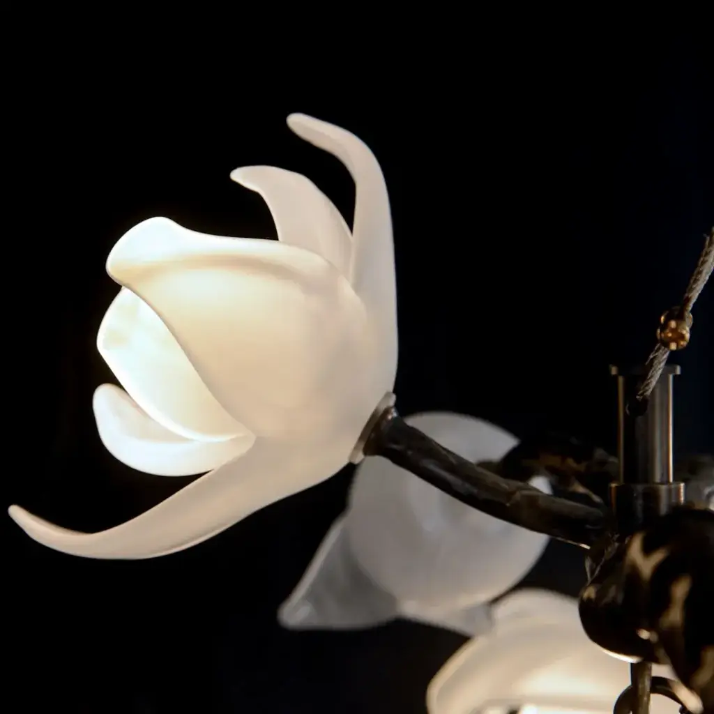 This oblong chandelier has branches in bronze with thirteen frosted mouthblown glass magnolia lights and ten decorative frosted mouthblown glass tulips. Six LED Bulbs (3 Watt Max) preinstalled in the canopy.