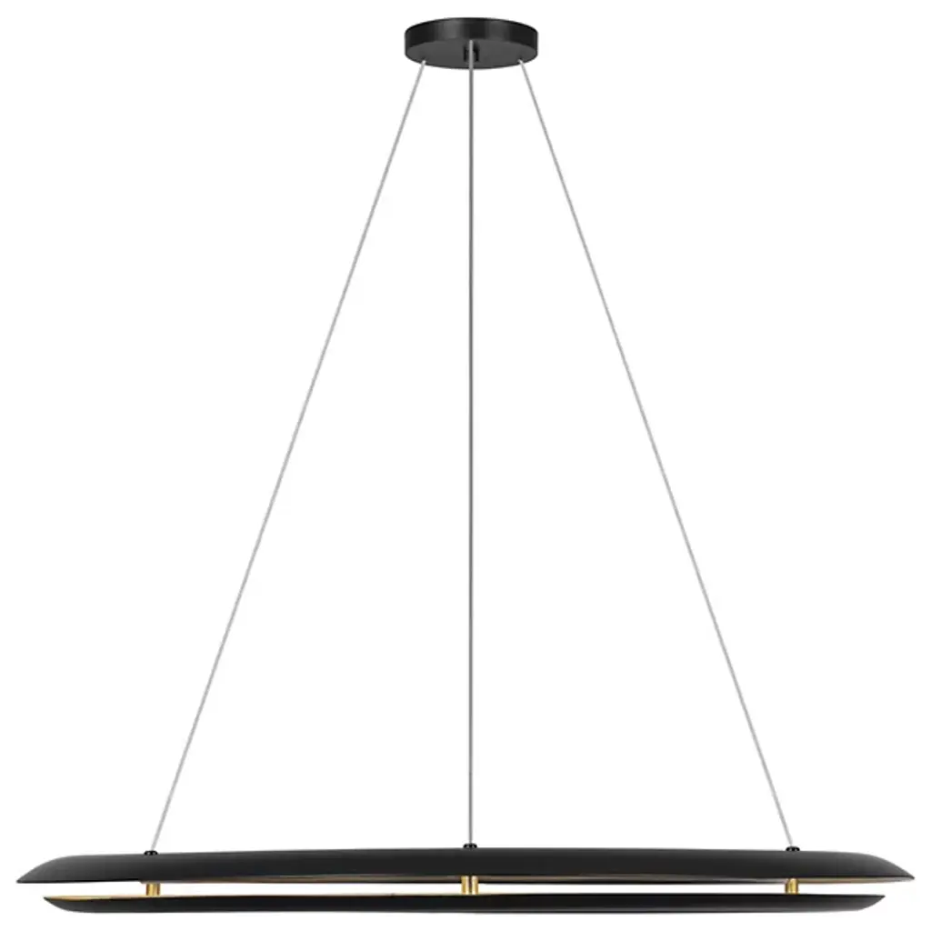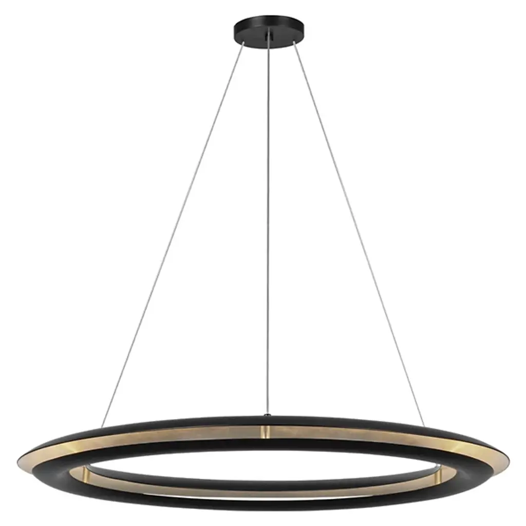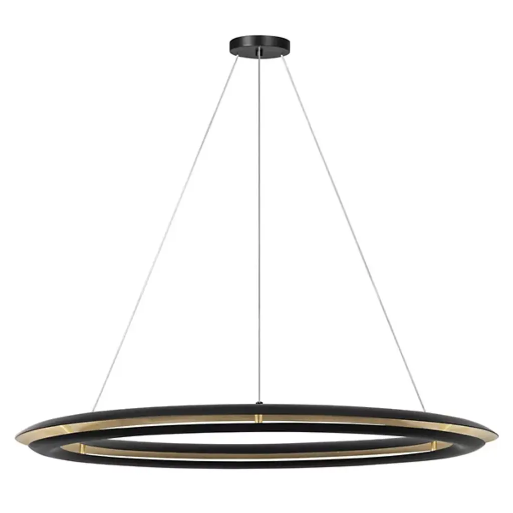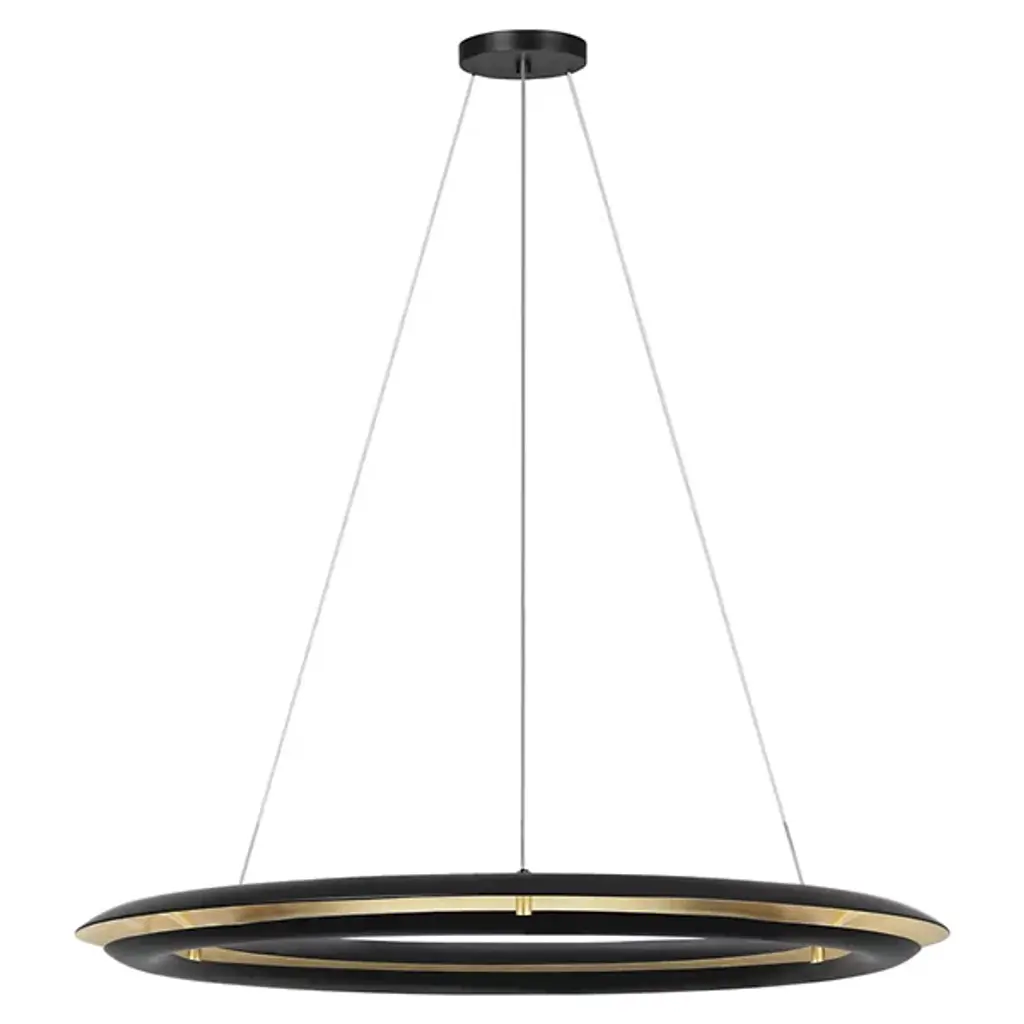 The dual donut shape of the Cielo LED Chandelier from Visual Comfort Studio offers a commanding contemporary presence to large inside spaces. A Chapman & Myers design with a vintage touch, it descends from a puck canopy via slim cables, placing energy-efficient lamping inside circular steel shades. The shades themselves are spaced out with vertical risers, allowing light to reflect out from between them for an ambient glow contrasted with the shadows cast by the ring.
