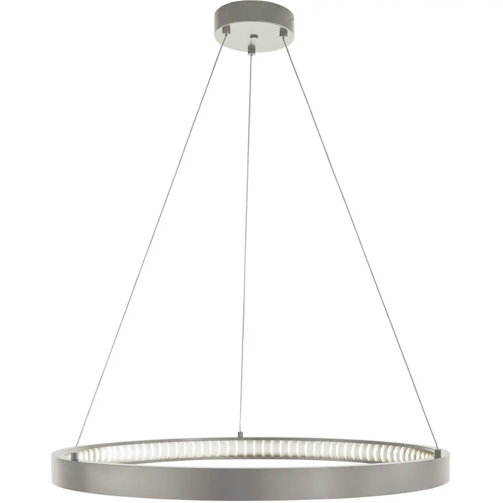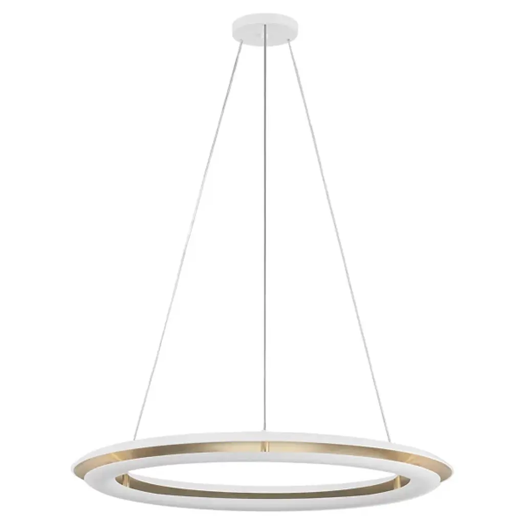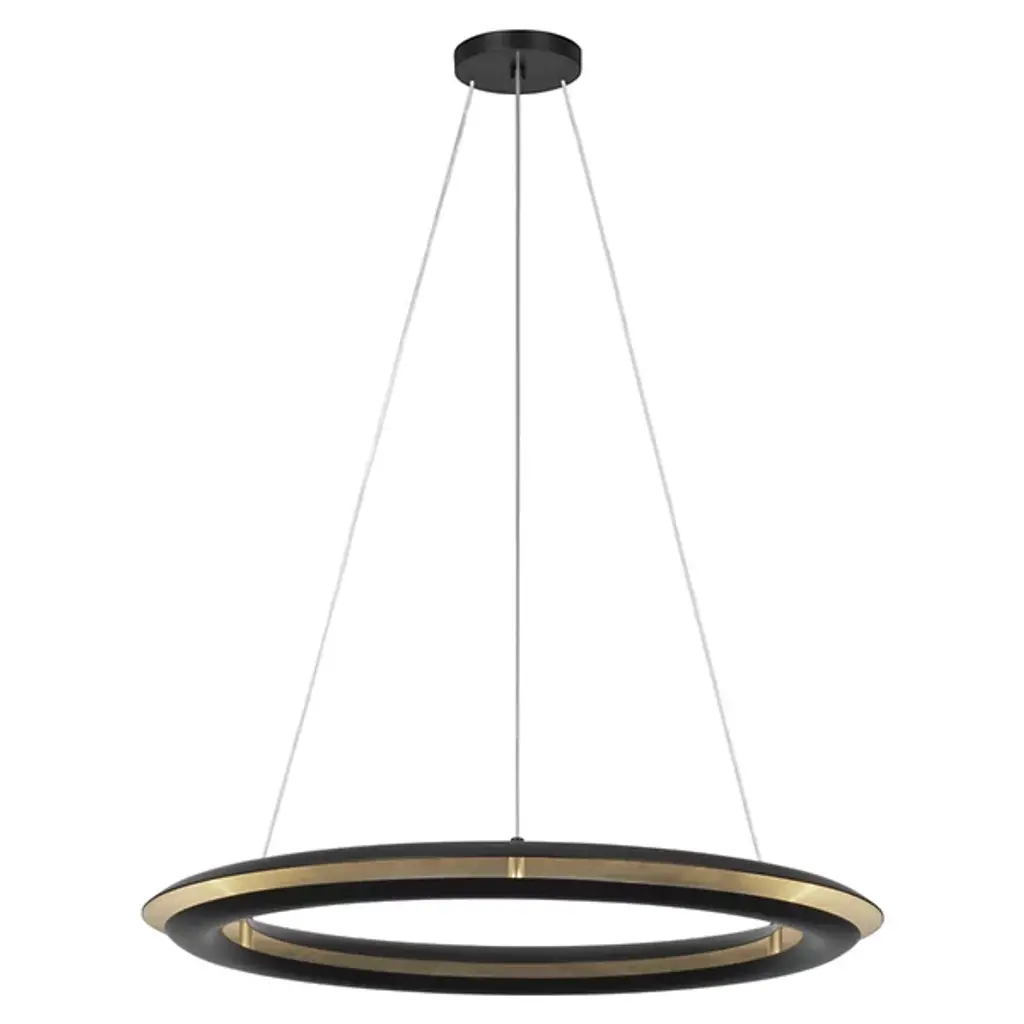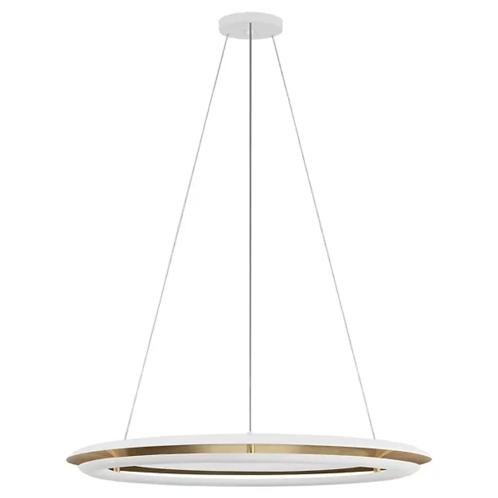 The dual donut shape of the Cielo LED Chandelier from Visual Comfort Studio offers a commanding contemporary presence to large inside spaces. A Chapman & Myers design with a vintage touch, it descends from a puck canopy via slim cables, placing energy-efficient lamping inside circular steel shades. The shades themselves are spaced out with vertical risers, allowing light to reflect out from between them for an ambient glow contrasted with the shadows cast by the ring.