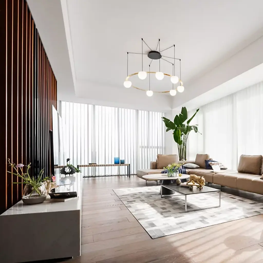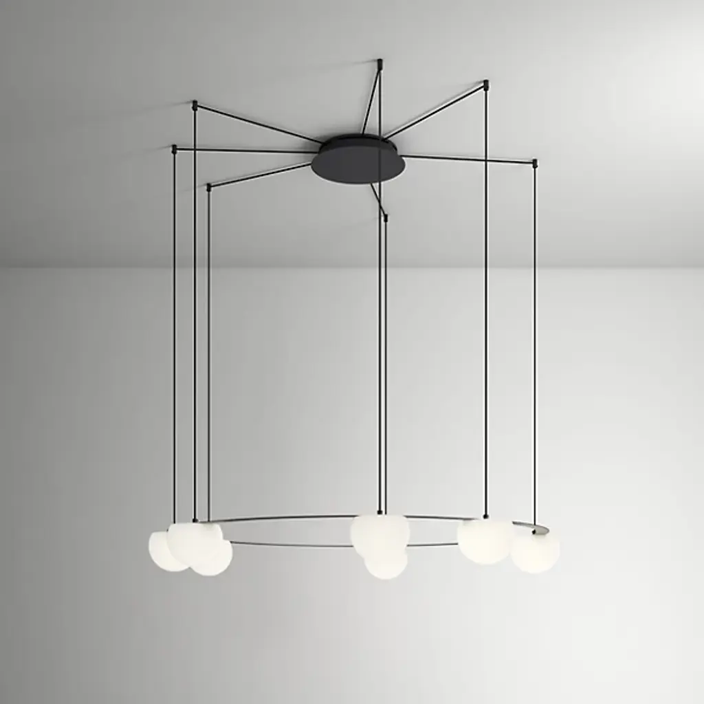 Inspired by the artistry of dance and the circus, the Circ LED Chandelier from Estiluz creates a memorable ambiance out of a ring of charming orbs. Circ's clean, direct visuals are a testament to designer Nahtrang Studio's love of formal simplicity and pure shapes. This appreciation for balanced form and function shows in the low-profile canopy and radiating suspension. The suspension's height adjustability gives the piece a cohesive look in low or tall ceiling rooms. A metal frame below guides the eye with bright glass spheres. For Nahtrang Studio, the sphere serves as a motif anyone can relate to. To enhance the sphere, clean LED light glazes its surface evenly. The glow of collective spheres creates an elegant, uplifting atmosphere.