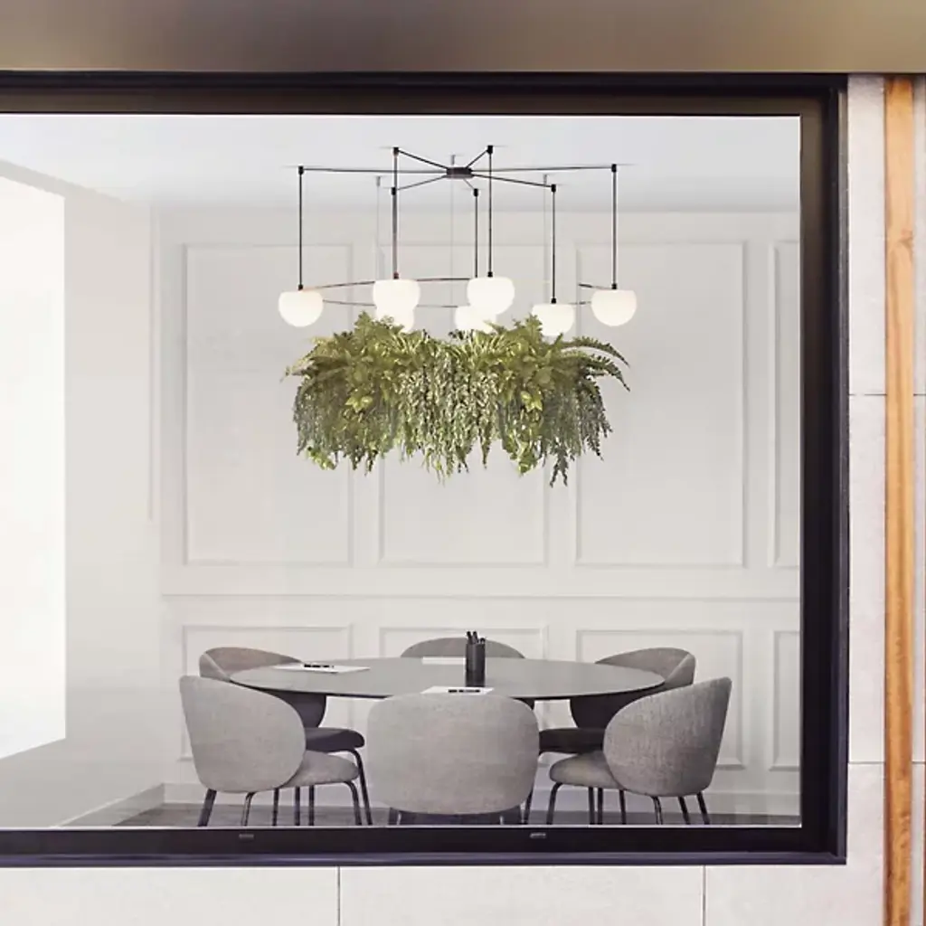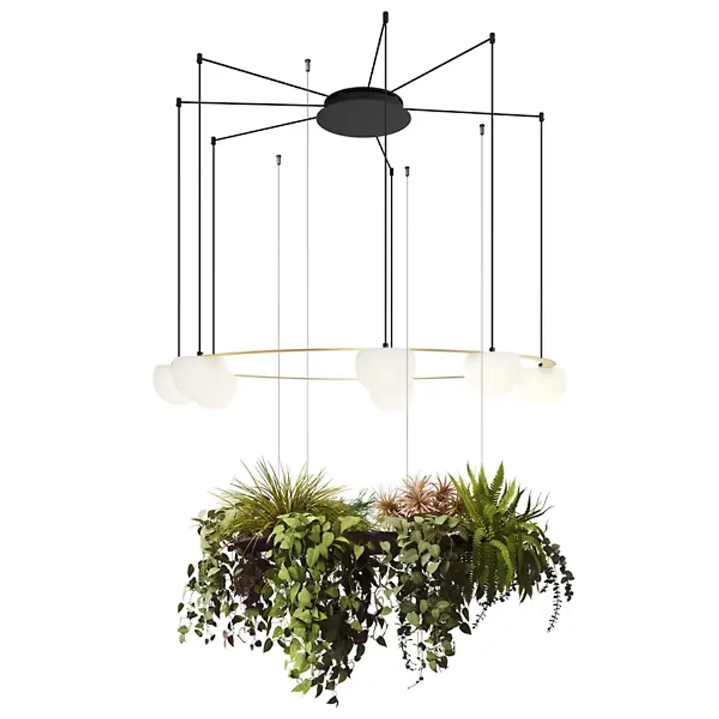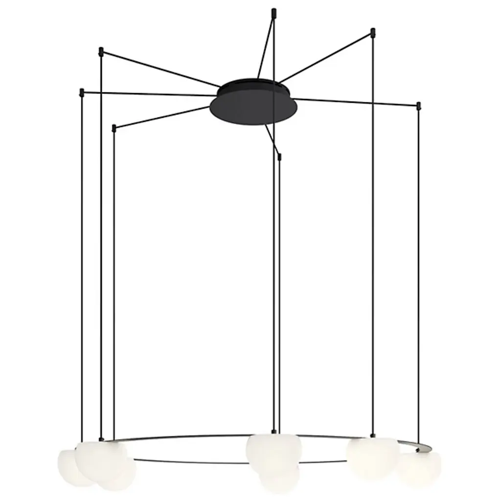 Inspired by the artistry of dance and the circus, the Circ LED Chandelier from Estiluz creates a memorable ambiance out of a ring of charming orbs. Circ's clean, direct visuals are a testament to designer Nahtrang Studio's love of formal simplicity and pure shapes. This appreciation for balanced form and function shows in the low-profile canopy and radiating suspension. The suspension's height adjustability gives the piece a cohesive look in low or tall ceiling rooms. A metal frame below guides the eye with bright glass spheres. For Nahtrang Studio, the sphere serves as a motif anyone can relate to. To enhance the sphere, clean LED light glazes its surface evenly. The glow of collective spheres creates an elegant, uplifting atmosphere.